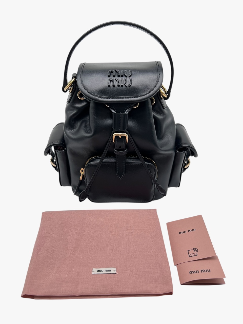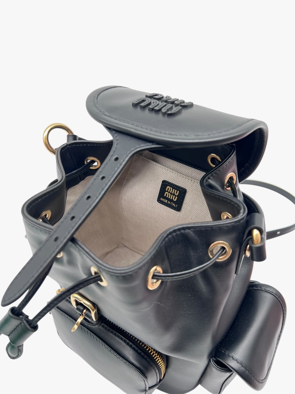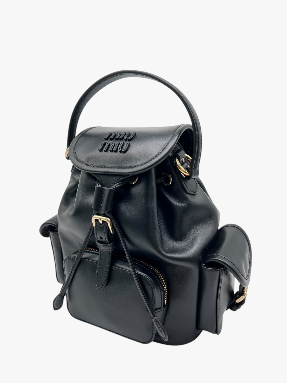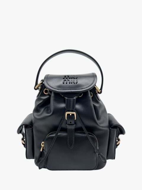 Ispirato al fascino del guardaroba scolastico, questo zaino Miu Miu unisce artigianalità e spirito contemporaneo con un’eleganza fresca e disinvolta. Realizzato in pelle di vitello di alta qualità, si distingue per il suo design compatto e funzionale, arricchito da finiture dorate e da dettagli iconici che riflettono lo stile raffinato e giocoso della Maison.