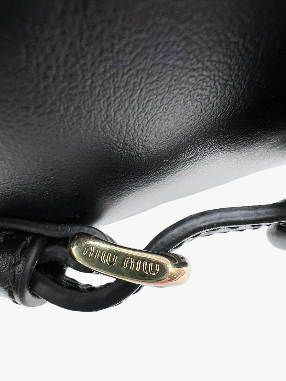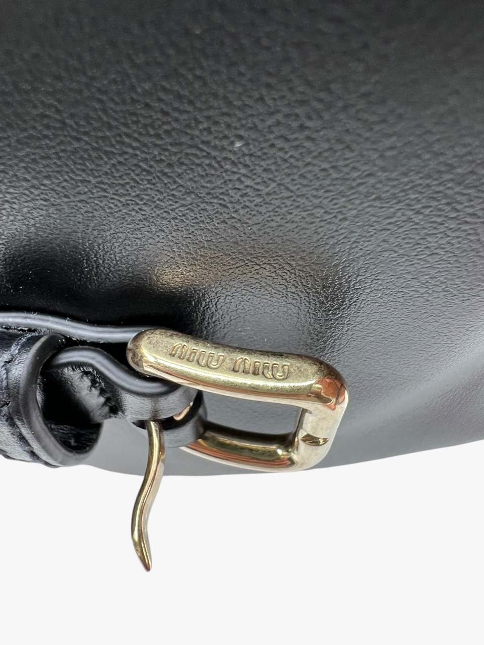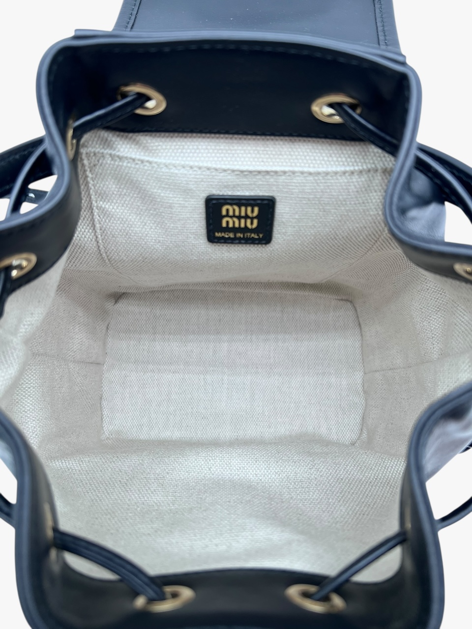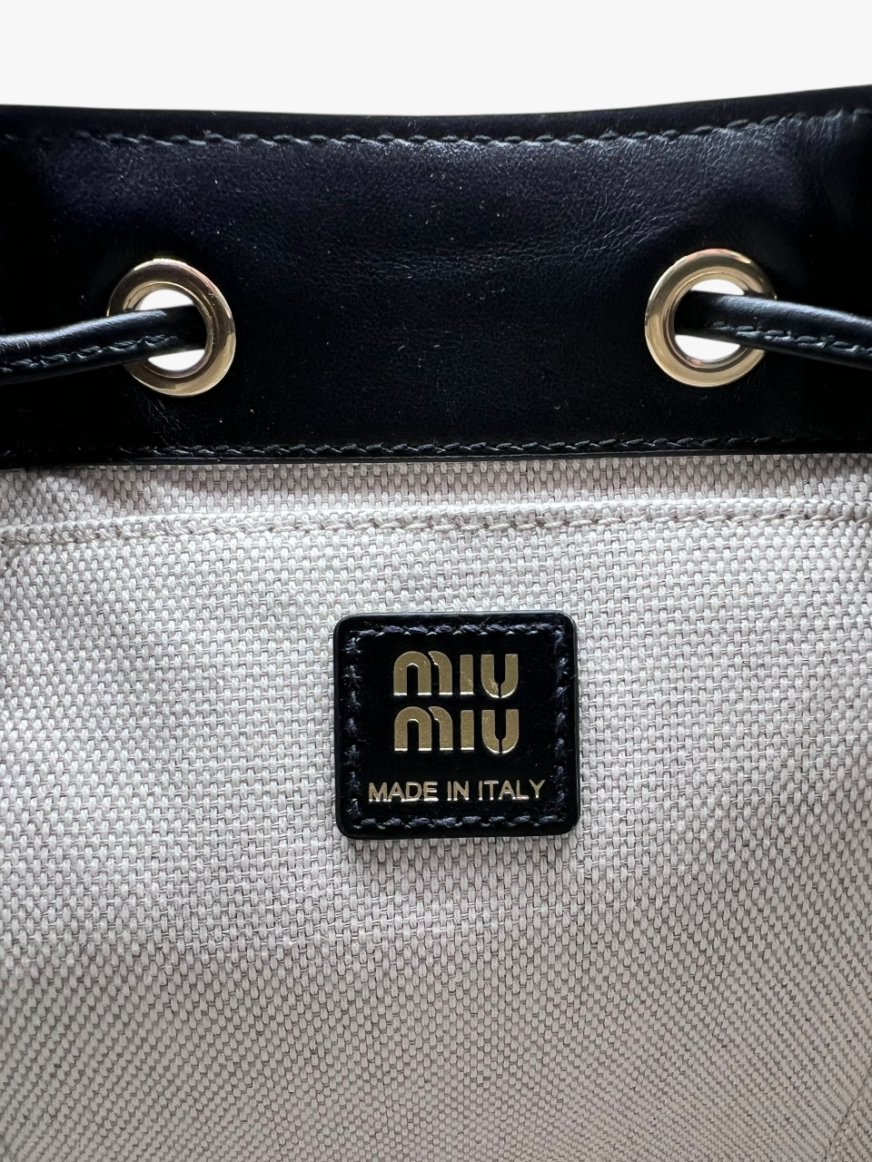 La struttura multitasche offre praticità senza rinunciare all’estetica: una tasca frontale con zip, due tasche laterali con pattina e una chiusura a fibbia sotto la pattina principale coniugano ordine e stile. L’interno in misto lino, con tasca applicata, è curato nei minimi dettagli, a conferma della qualità sartoriale che caratterizza ogni creazione Miu Miu.