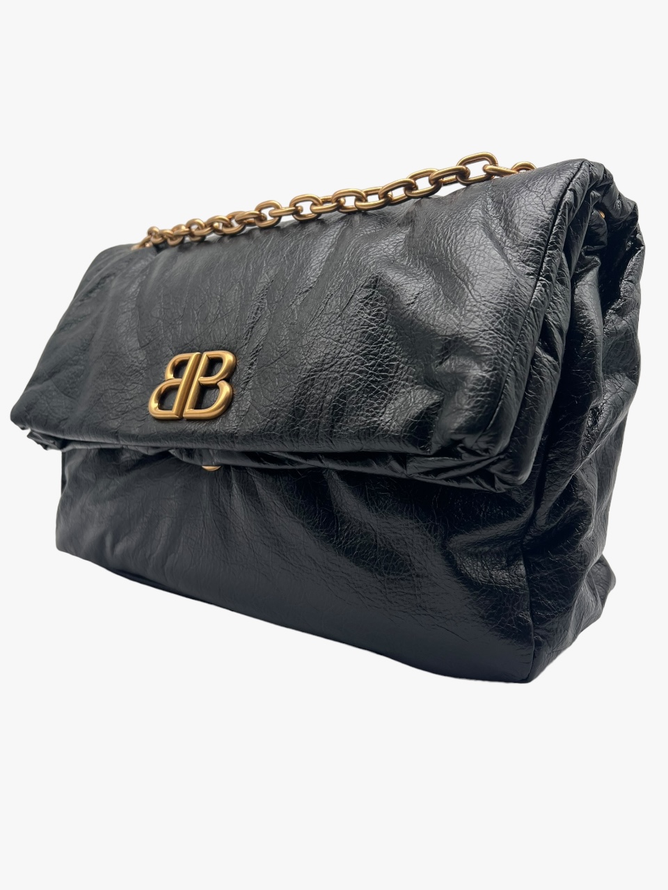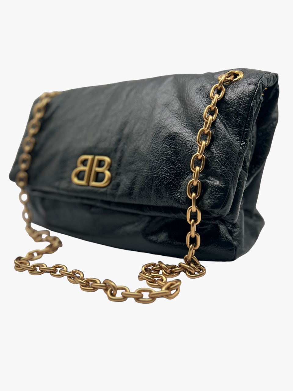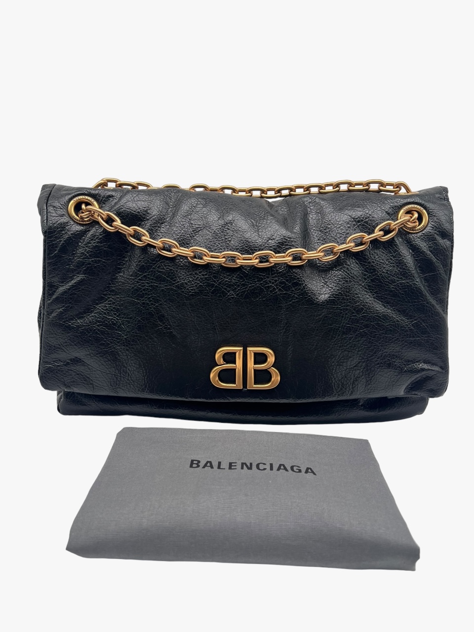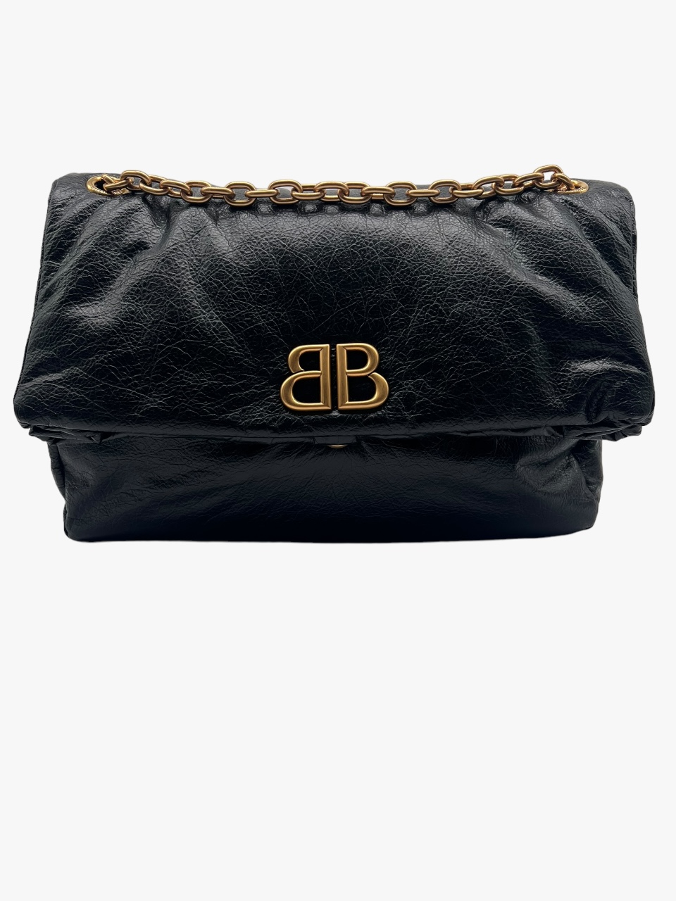 Borsa Balenciaga modello Monaco misura media in pelle di vitello Arena con parti metalliche in oro anticato. Chiusura con patta e tasca sul davanti. Tasca interna applicata e fodera in tela di cotone. Anno 2023, Misure L 32,5 x H 22 x P 9,9 CM, corredata di sola dustbag, la borsa si presenta in buone condizioni.
