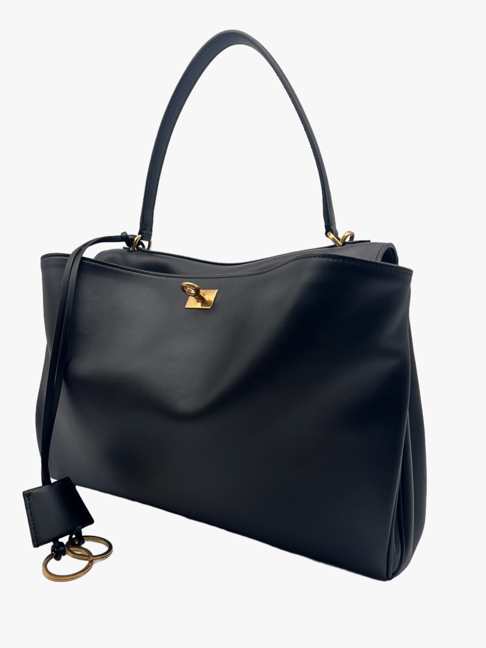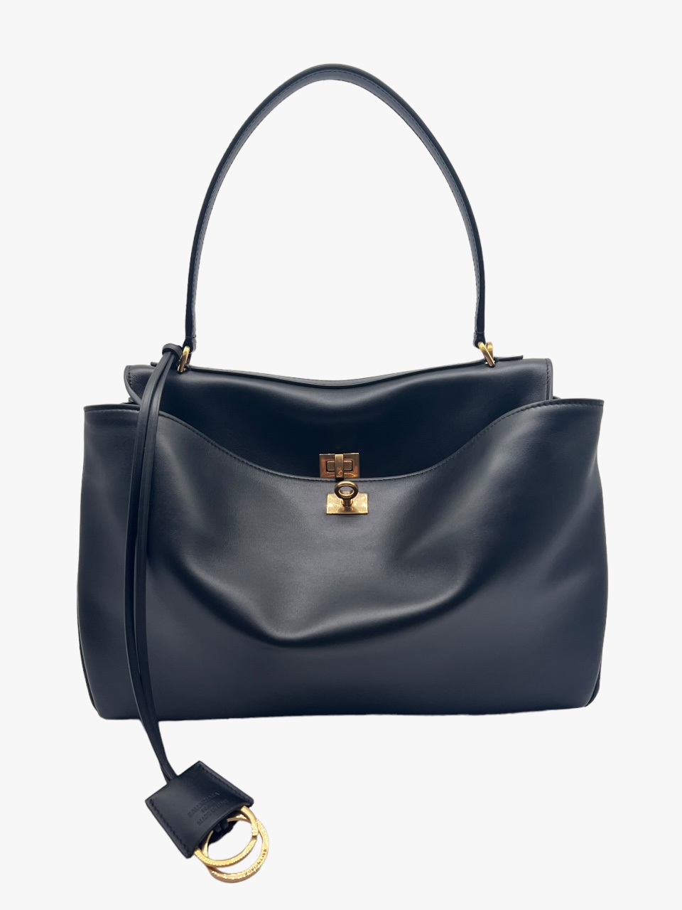Borsa Rodeo Balenciaga Media. Dimensioni: L 35 x H 23,3 x P 10,9 cm In pelle di vitello liscia, luce manico: 20,5 cm, tracolla amovibile (luce: 57,4 cm), portachiavi removibile in pelle, con due anelli aperti, finiture oro anticato e chiusura a girello. Presenta un’ampia tasca anteriore con uno scomparto principale e tasca interna con zip. Sul retro ha due tasche piatte e bottoni a pressione sui lati. La fodera interna è in nappa di agnello. Anno 06/2024. Corredata di tutto il set: Box, Dustabg e fotocopia scontrino originale, si presenta in ottime condizioni.