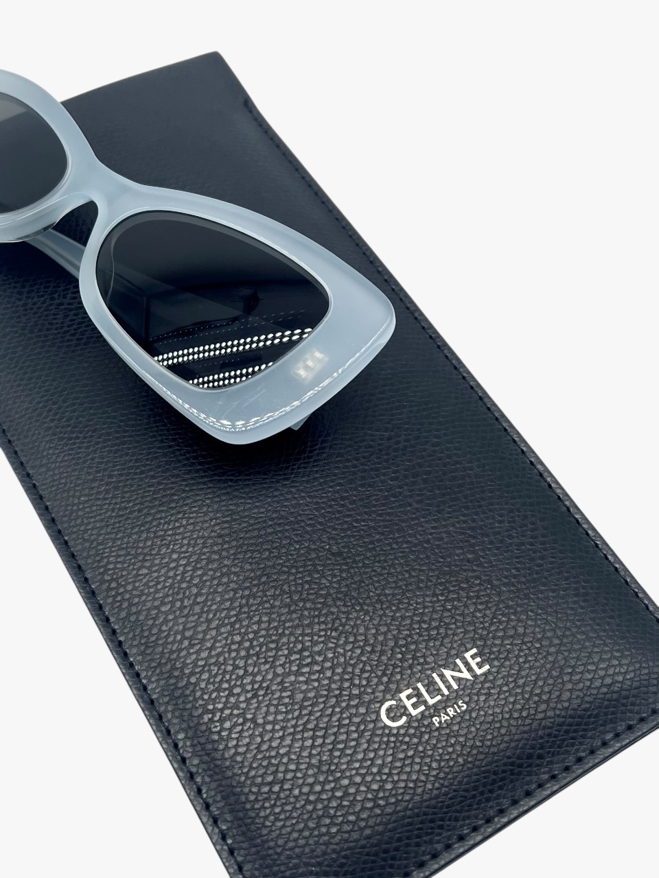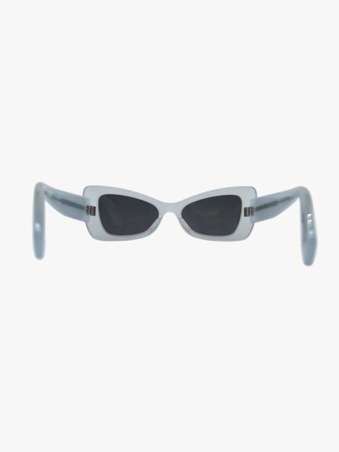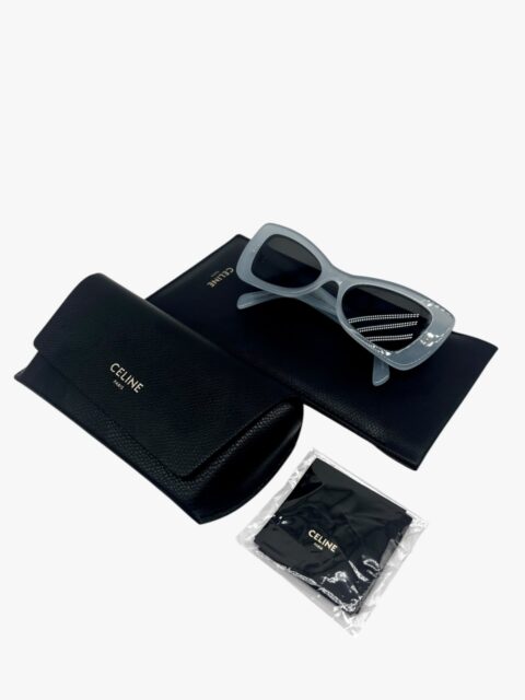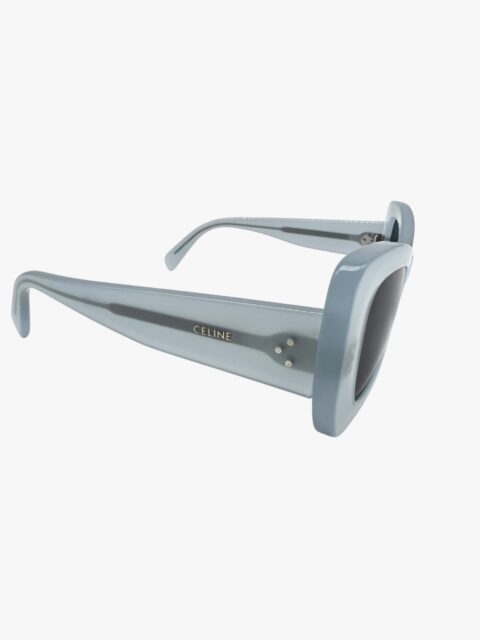 Occhiali da sole modello Cat Eyes in acetato, di colore ceruleo con lenti nere semi trasparente. Misure: lunghezza aste 14 cm, larghezza lente 15 cm. Corredati sia della Custodia che dell’astuccio con chiusura calamitata ed il pannetto. Si presentano in buone condizioni.