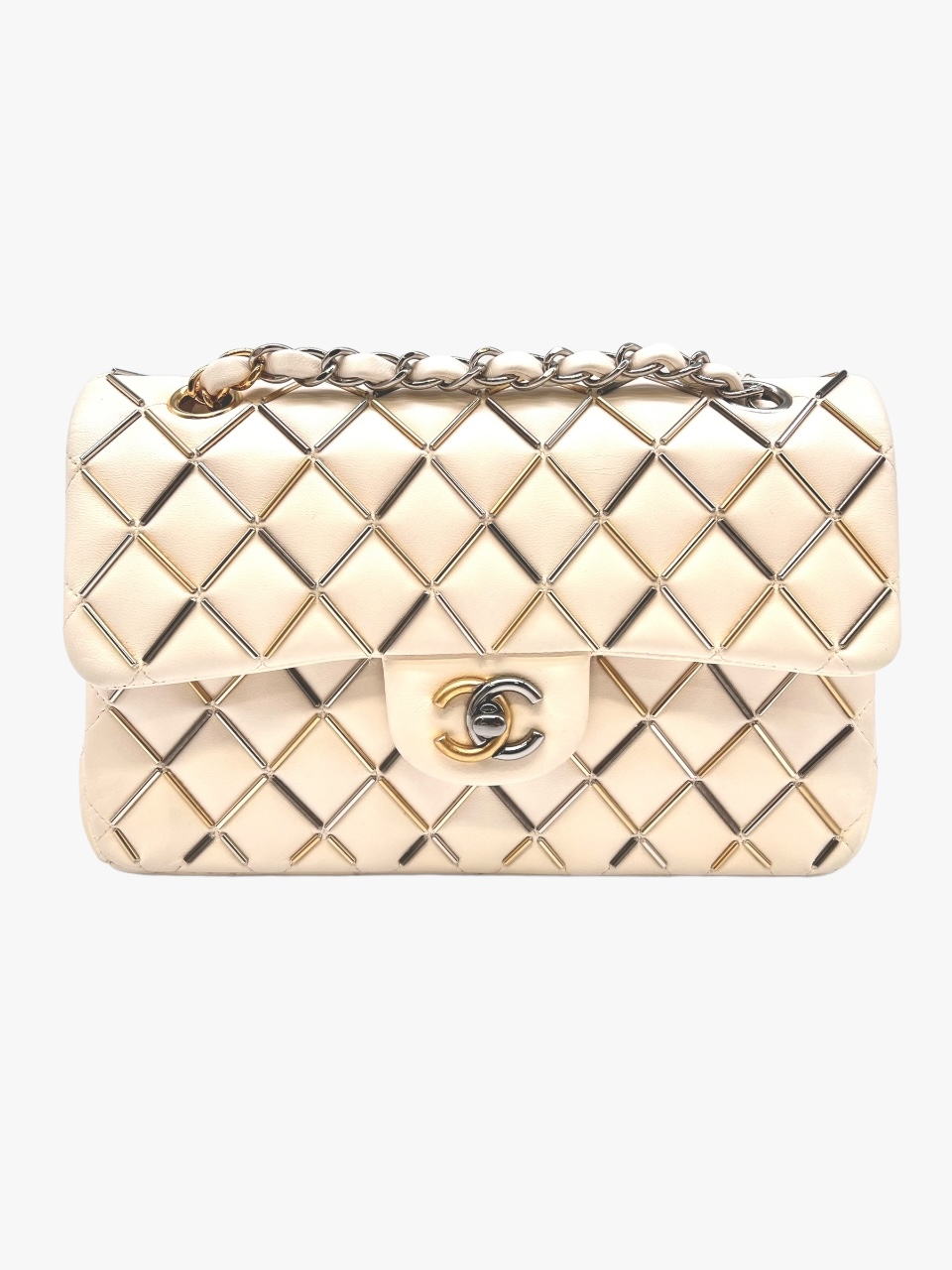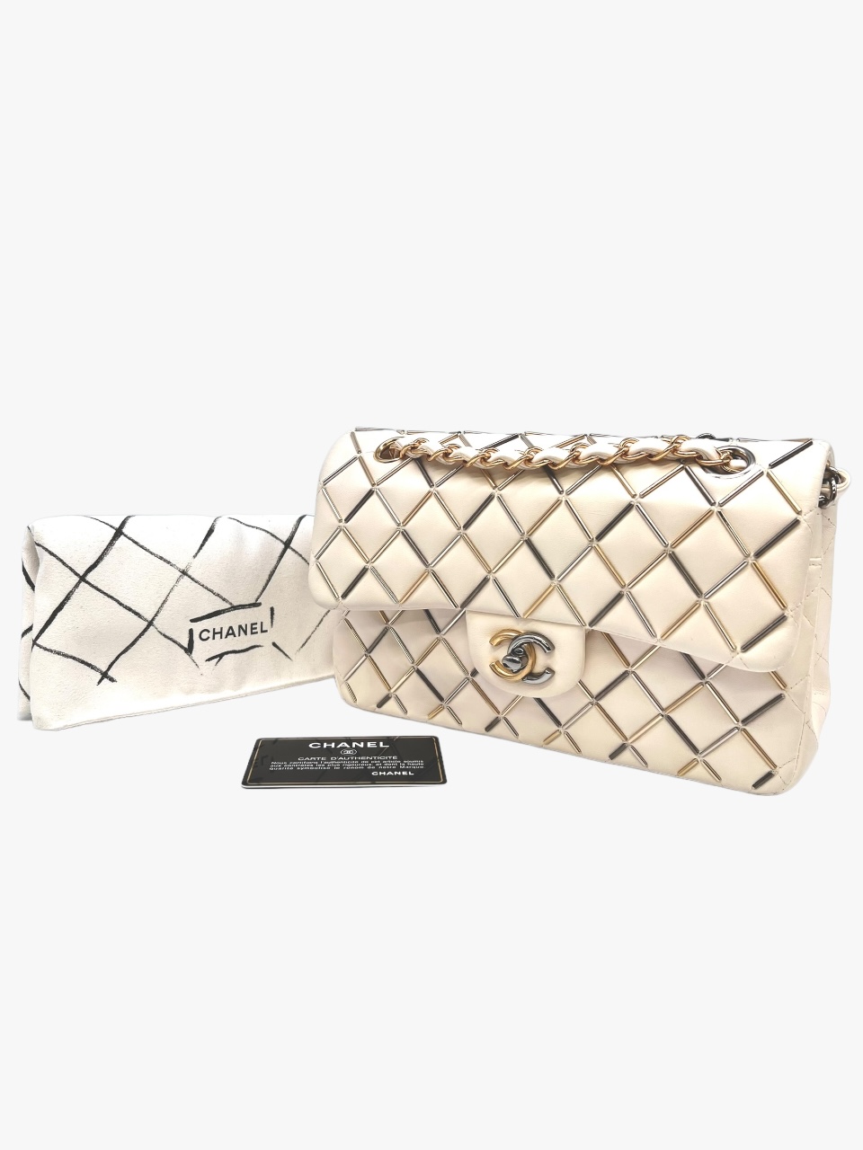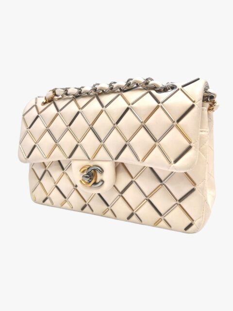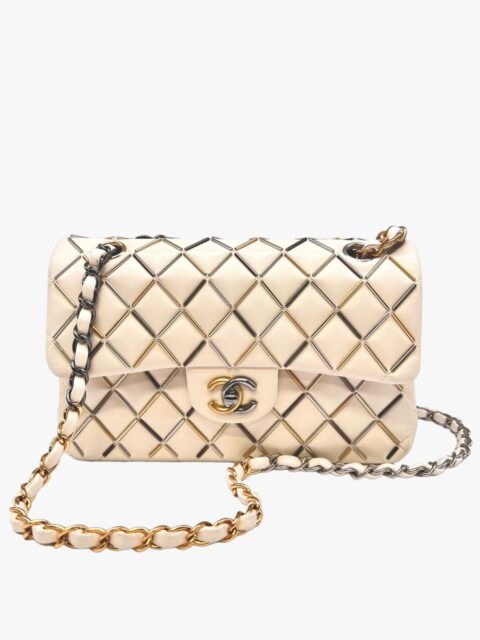 Presentata nella collezione Metier D’art del 2019, la Chanel 23 Bachette vede tutta la maestria degli artigiani selezionati in quell’anno, per mettere dentro questa fantastica borsa, ormai pezzo da collezione, tutta la loro sapienza e manualità. Si, perché in questa borsa, c’è da notare il minuzioso lavoro fatto a mano delle bacchette di tre diversi tipi di metalli, Gold/Silver/Rutenio, cuciti nel matelassé della borsa al posto delle classiche impunture a filo, che formano il classico disegno a Rombi delle borse Chanel. Ormai non più in produzione, questa borsa è un “Must Have” di chi, con passione colleziona questi capolavori. Anno 2019, Misure 23 x 6 x 13, si presenta in buone condizioni. Corredata della Dustbag e della Card.