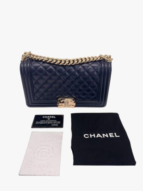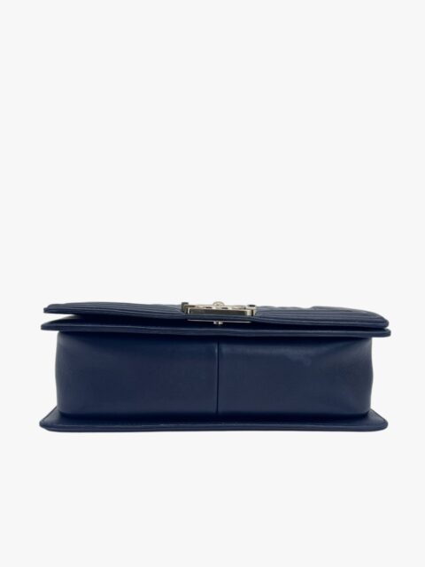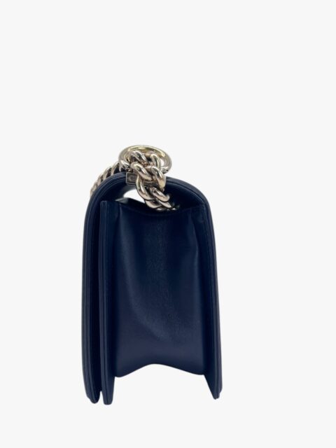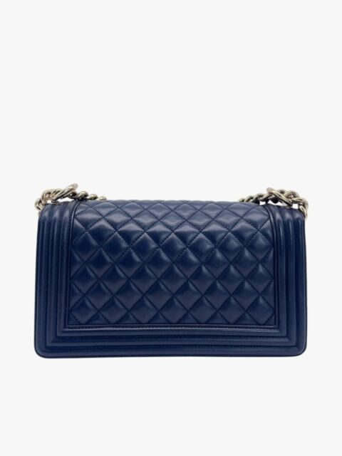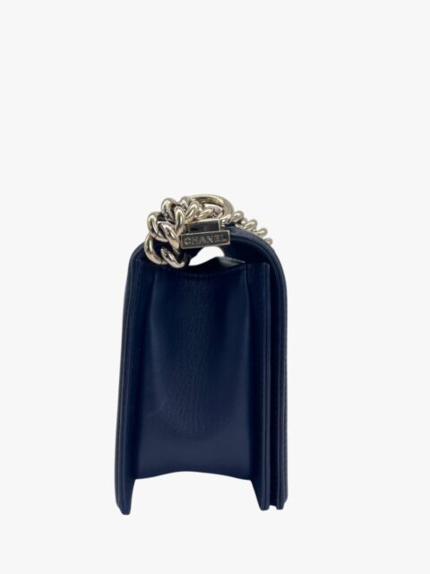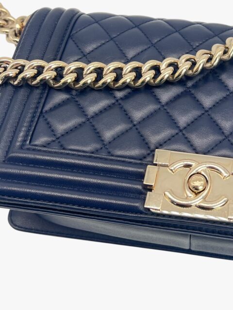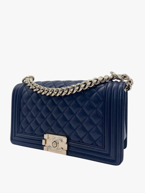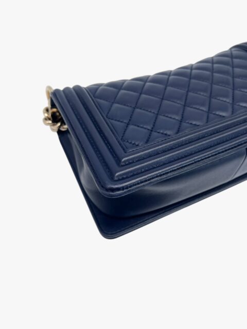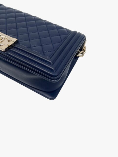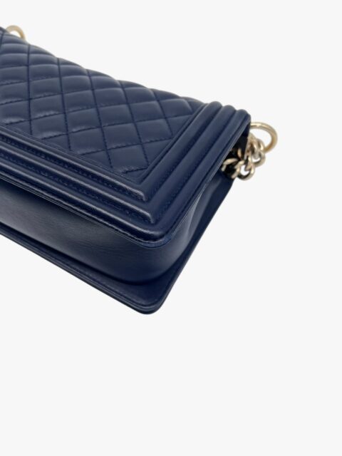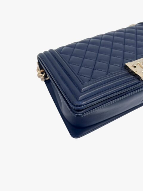 Borsa Boy Media Chanel, in pelle di agnello liscio Matelassé color bleu niut, parti metalliche in light gold. Si può indossare anche a tracolla. La borsa si presenta in buone condizioni, anche se si presentano dei leggerissimi segni di usura sugli angoli, come si vede in foto.