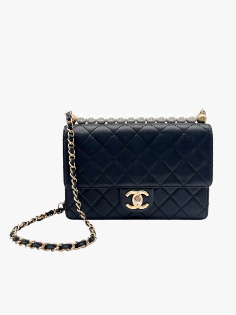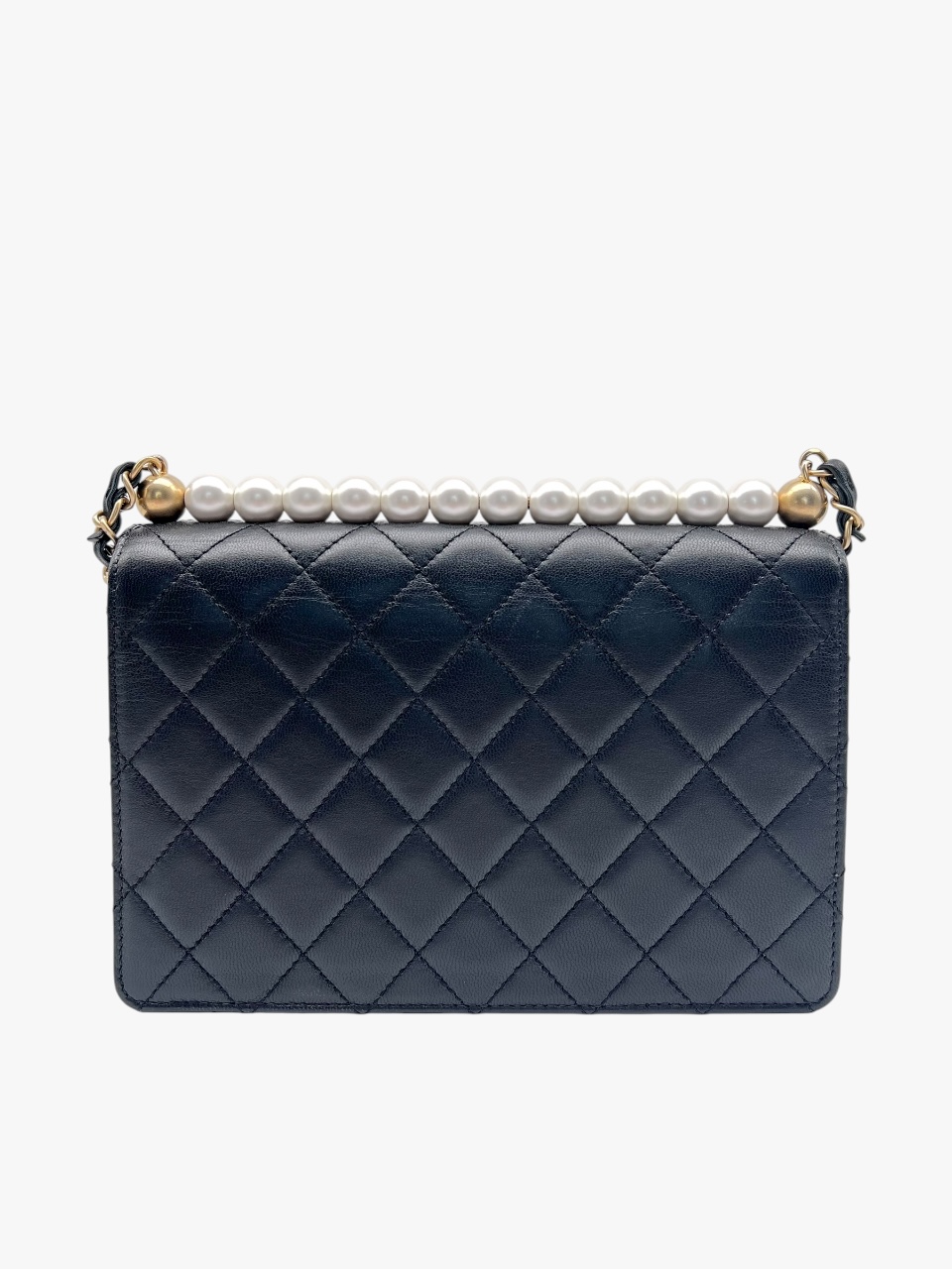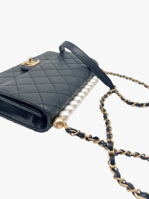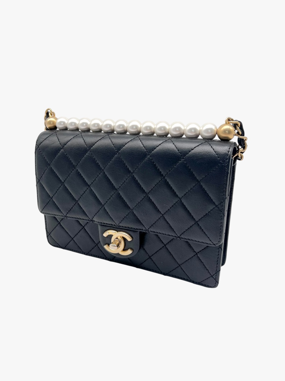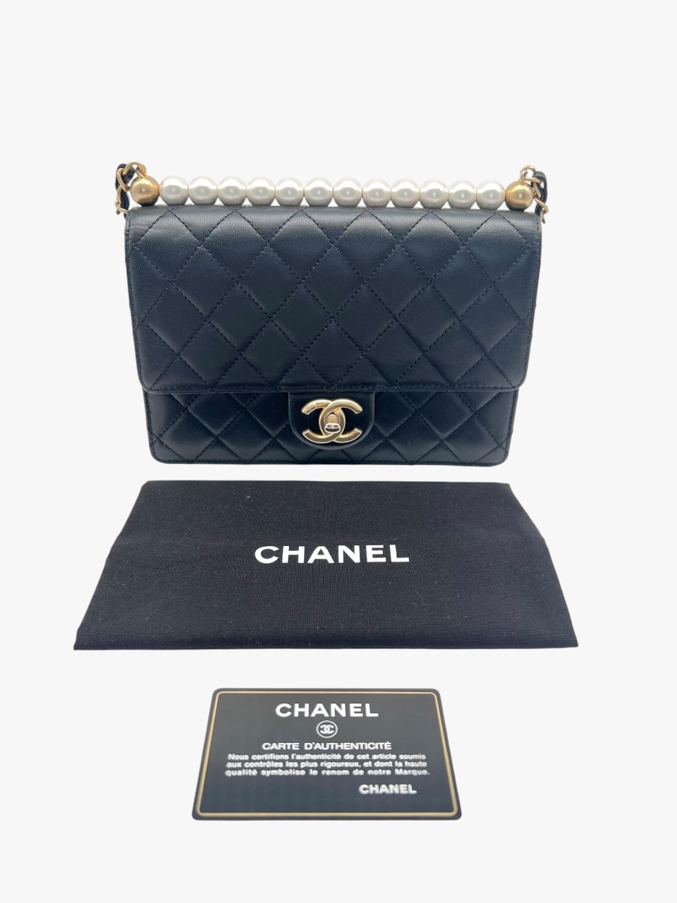 Questa elegante borsa Chanel Chic Pearl Flap è realizzata in pelle di vitello nera con motivo trapuntato a rombi (matelassé) e dettagli in metallo dorato effetto anticato.