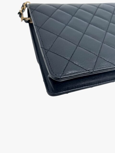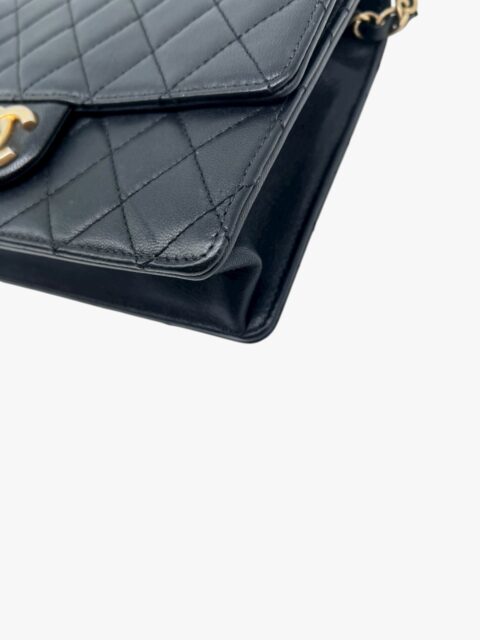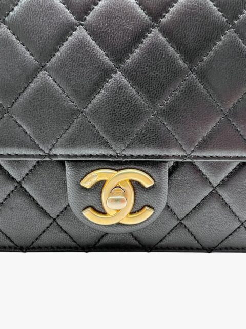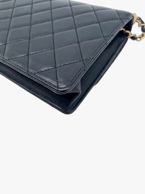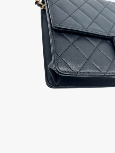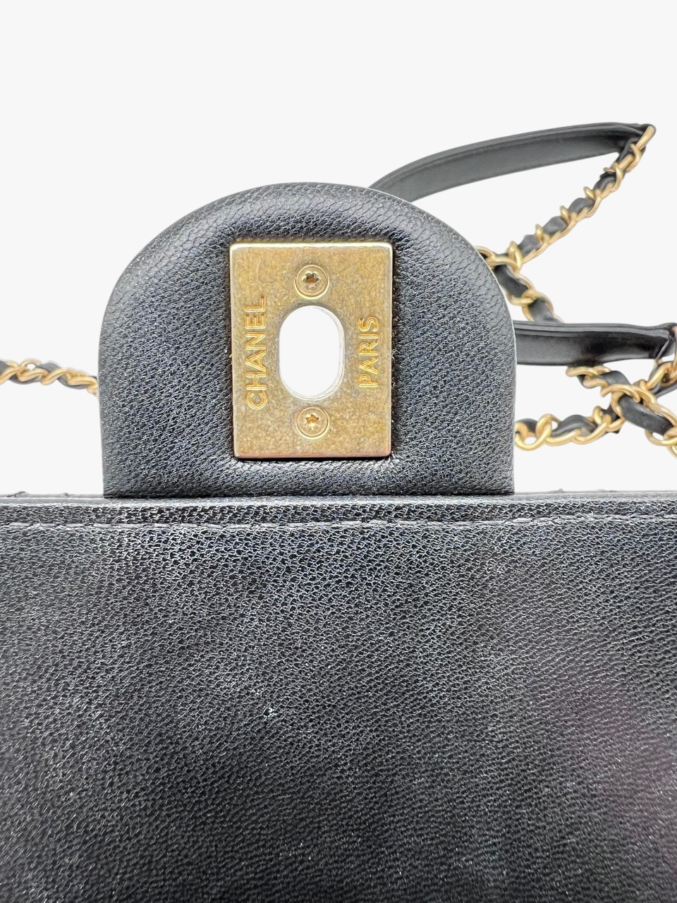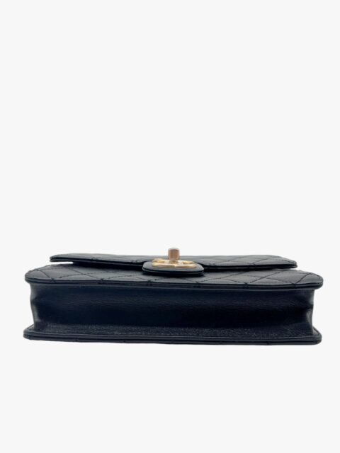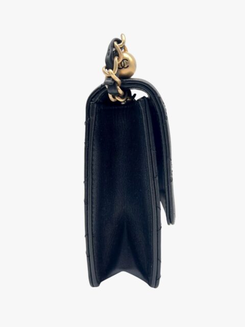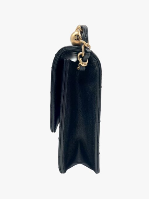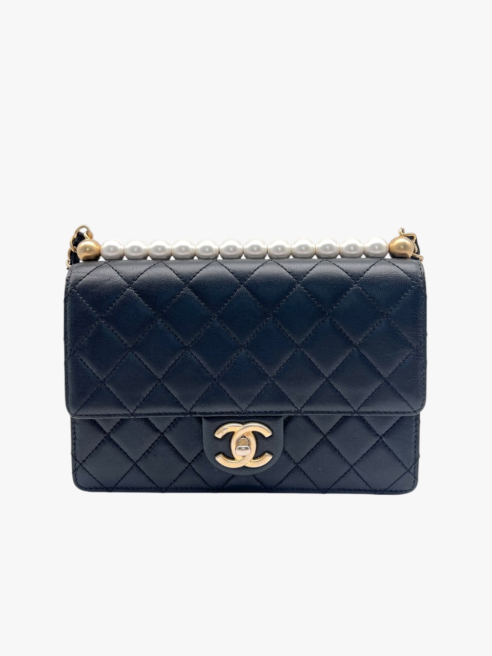 Questa elegante borsa Chanel Chic Pearl Flap è realizzata in pelle di vitello nera con motivo trapuntato a rombi (matelassé) e dettagli in metallo dorato effetto anticato.