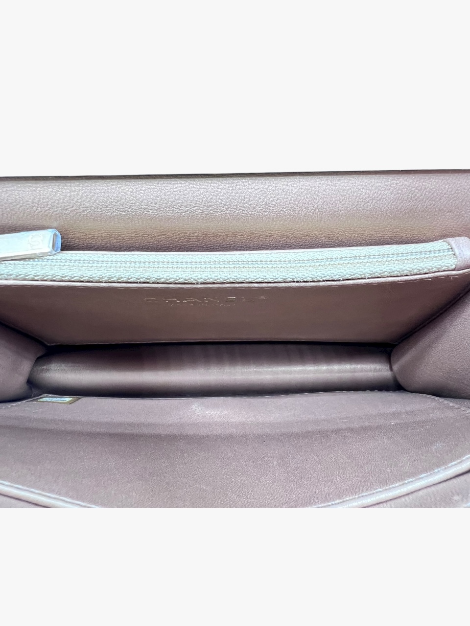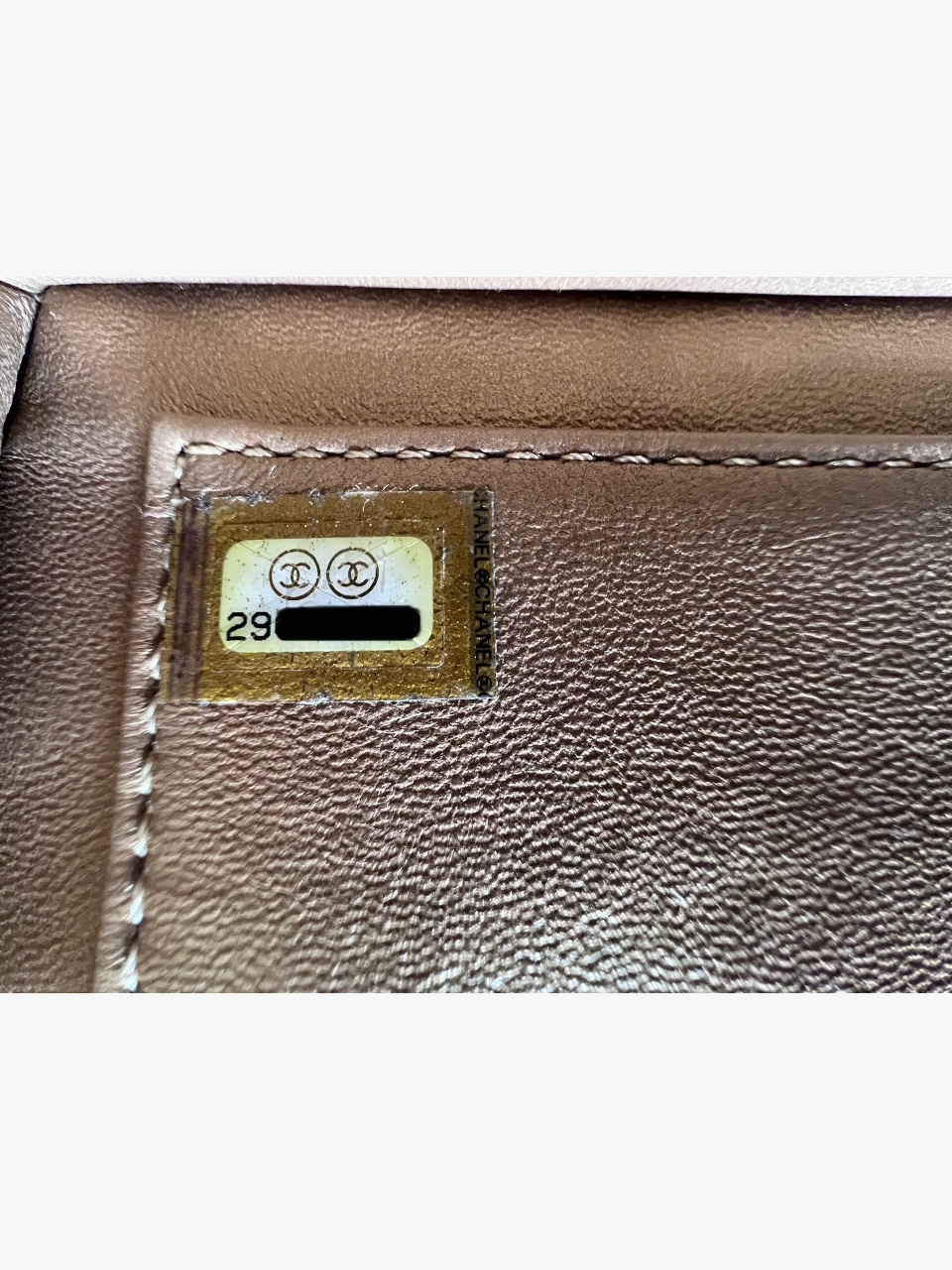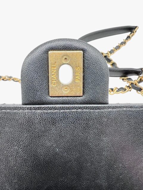 La parte superiore è impreziosita da perle in pasta di vetro avorio con dettaglio dorato, mentre la patta frontale si chiude con l’iconica chiusura a torsione CC.