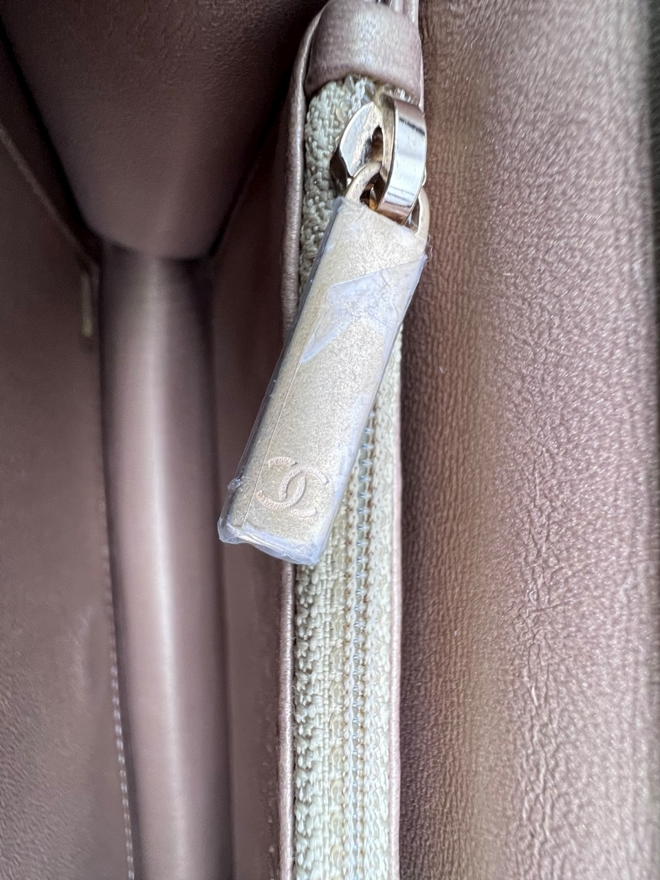 L’interno, foderato in pelle color bronzo, presenta due scomparti separati da una tasca con chiusura a zip, oltre a una tasca aperta.