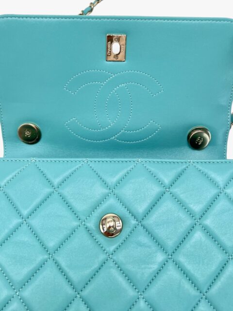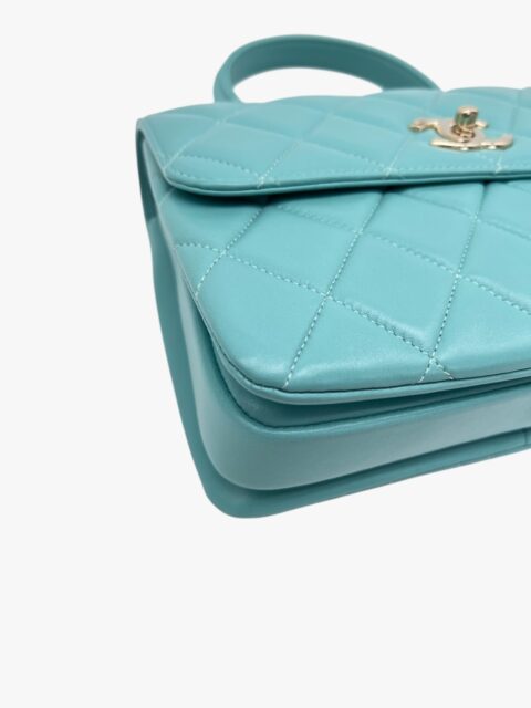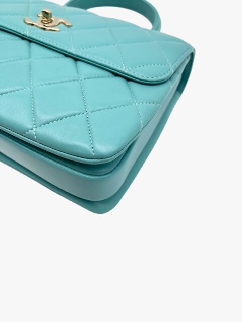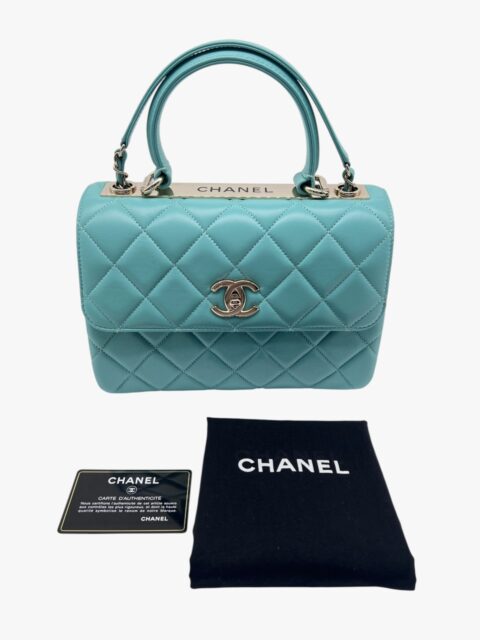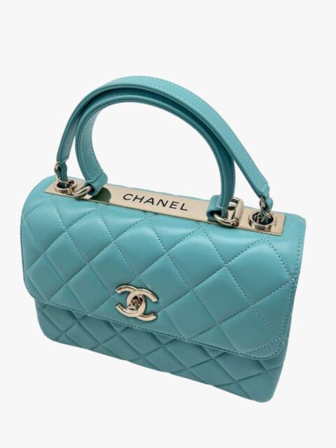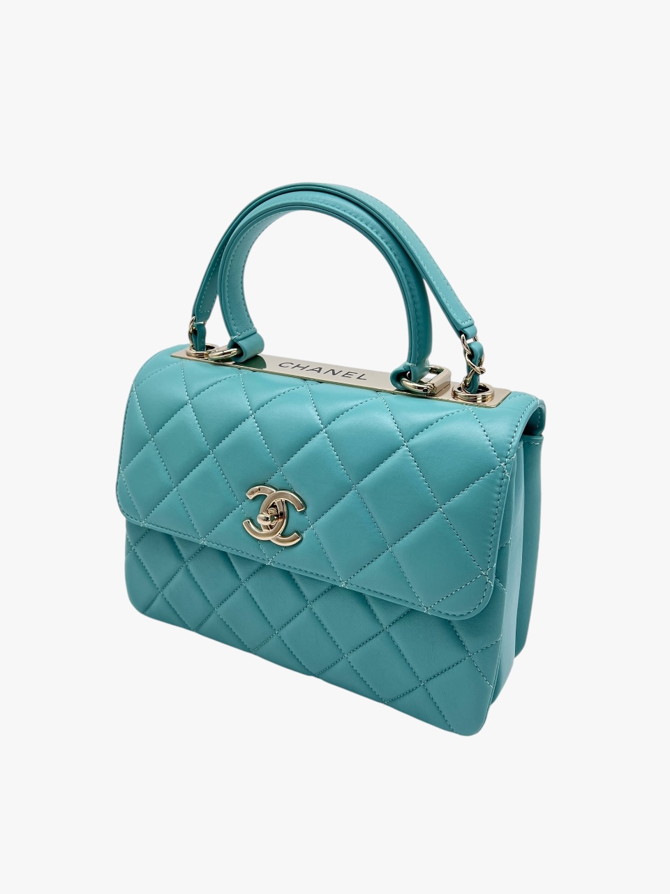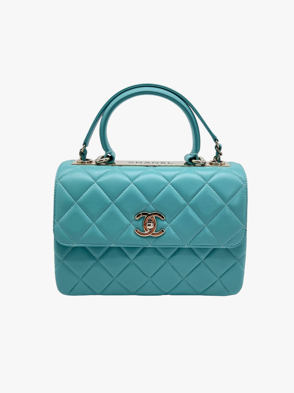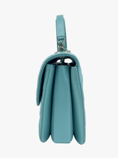 Borsa Chanel con manico Trendy media, in pelle di agnello liscio di colore Tiffany con parti metalliche effetto dorato. Dotata sia del manico corto che della tracolla con salva spalla in pelle, questa borsa è perfetta per tutte le occasioni. Stile classico, misure che la rendono un vero bijoux. Patta singola, interno in pelle tono su tono. Il dettaglio che la rende cosi particolare è il lettering CHANEL serigrafato su una placca rettangolare di metallo dorato posta alla base del manico corto, che dà alla borsa quel tocco di unicità. Anno 2021, Misure 25 x 17.5 x 8 cm, la borsa è completa di Dustbag e Card e si presenta in buone condizioni, non ci sono importanti segni di utilizzo da segnalare.