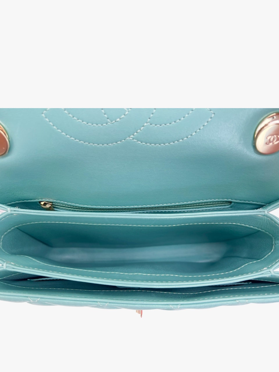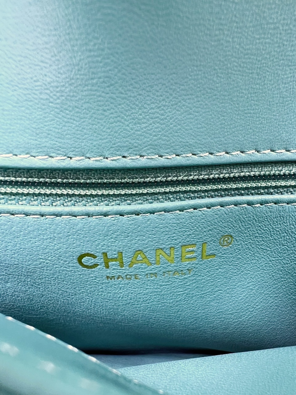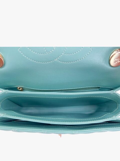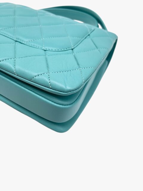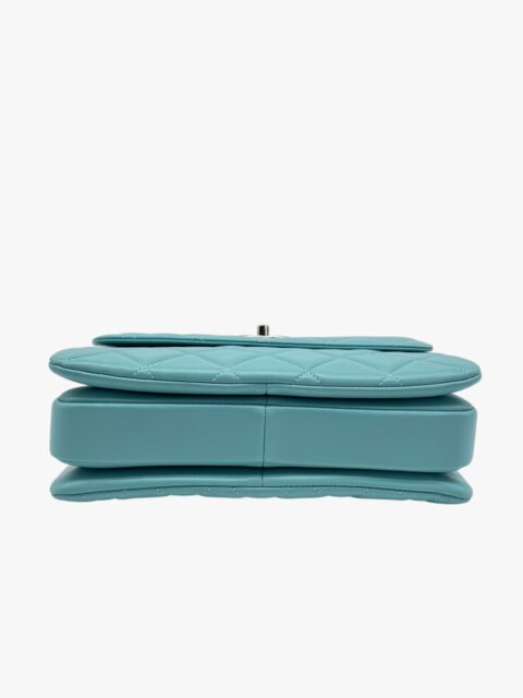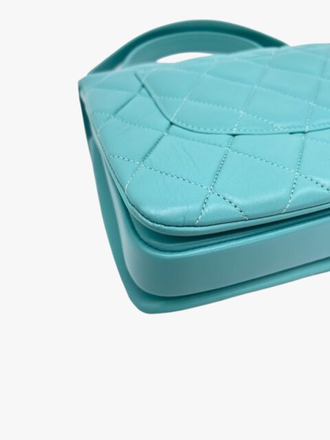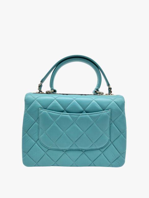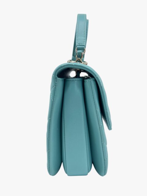 Borsa Chanel con manico Trendy media, in pelle di agnello liscio di colore Tiffany con parti metalliche effetto dorato. Dotata sia del manico corto che della tracolla con salva spalla in pelle, questa borsa è perfetta per tutte le occasioni. Stile classico, misure che la rendono un vero bijoux. Patta singola, interno in pelle tono su tono. Il dettaglio che la rende cosi particolare è il lettering CHANEL serigrafato su una placca rettangolare di metallo dorato posta alla base del manico corto, che dà alla borsa quel tocco di unicità. Anno 2021, Misure 25 x 17.5 x 8 cm, la borsa è completa di Dustbag e Card e si presenta in buone condizioni, non ci sono importanti segni di utilizzo da segnalare.
