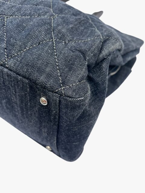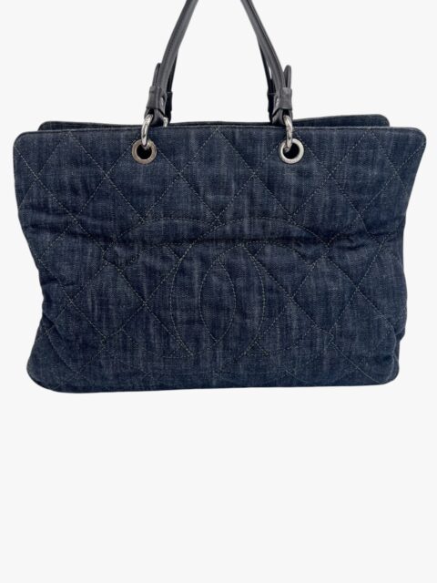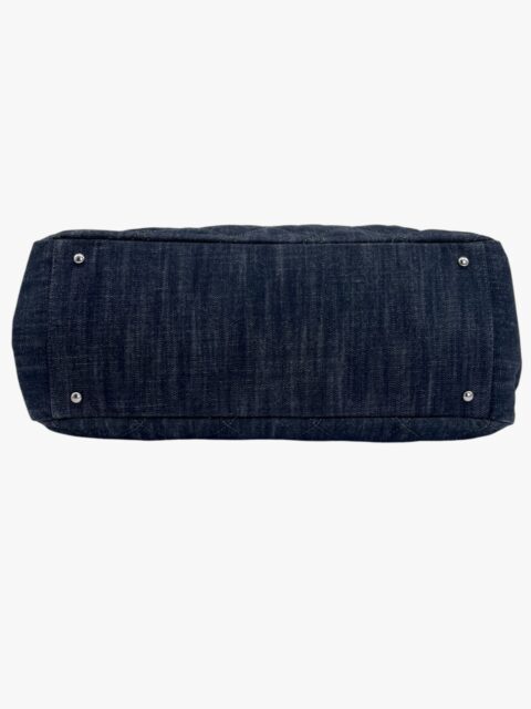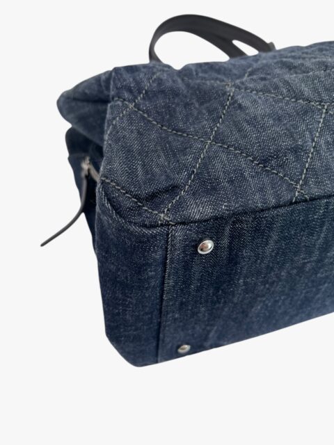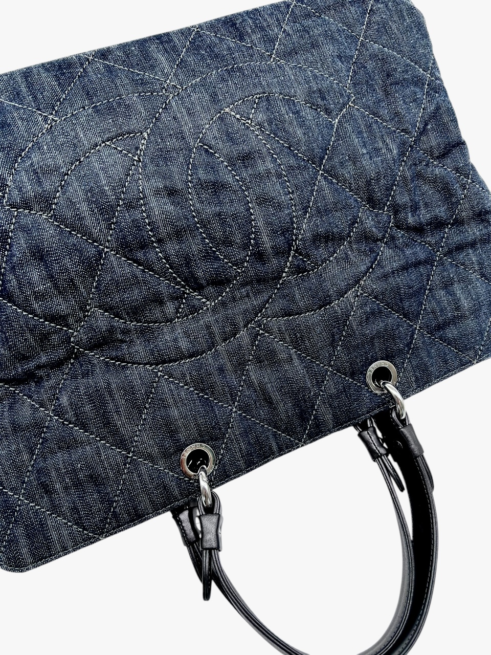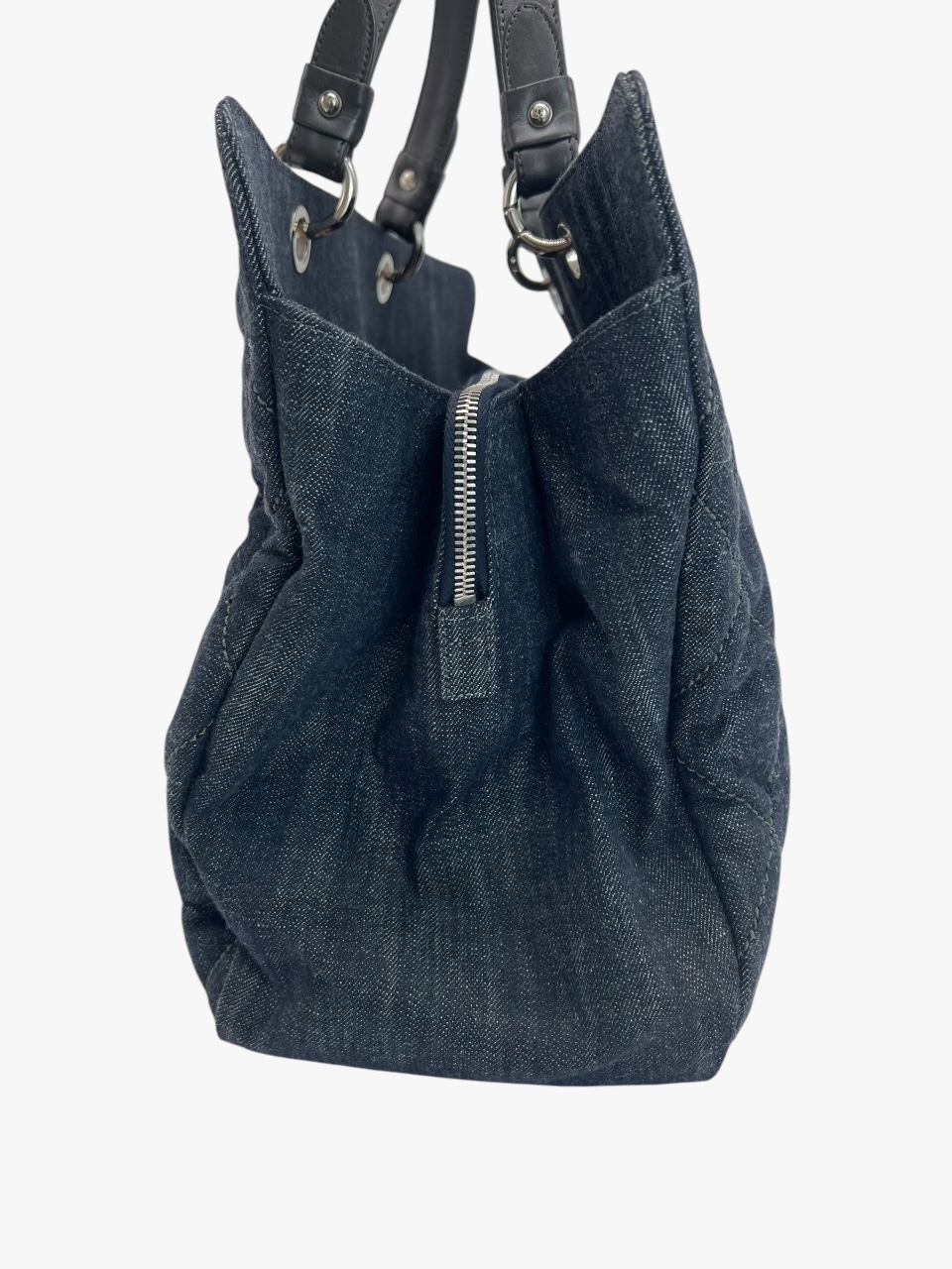 Borsa Chanel in tessuto Denim Bleau scuro. Le parti metalliche sono in Silver e i manici in pelle nera sono corti. La borsa può essere portata solo a mano o sotto braccio, vista la sua morbidezza. Il big logo centrale trapuntato sul matelassé a trama larga, la monnalisa posta sul retro, la rendono una borsa molto affascinante. Per non parlare della capienza dell’interno, foderato in tessuto tecnico di colore grigio tortora. Le due tasche grandi e aperte sono divise da una centrale che presenta la zip con tira lampo in pelle. Il che, la rende anche sicura oltre che comoda. Anno 2008, Misure 39 x 29 x 17 cm. La borsa si presenta in buone condizioni con lievissimi segni di usura nella parte esterna. Gli angoli sono intatti e la borsa non presenta alcun tipo di corredo.