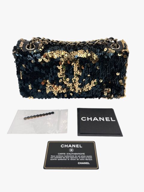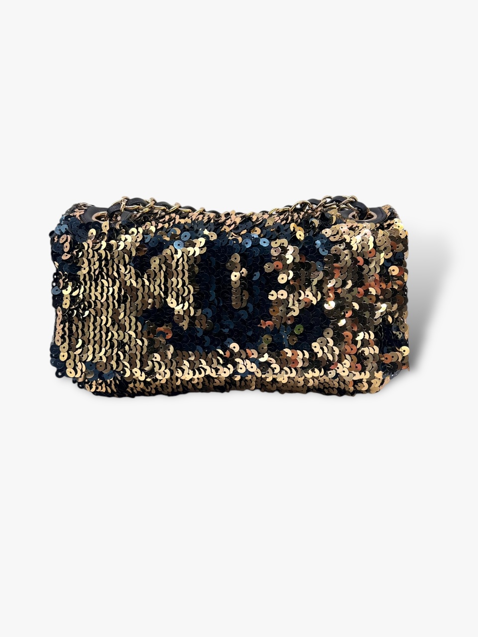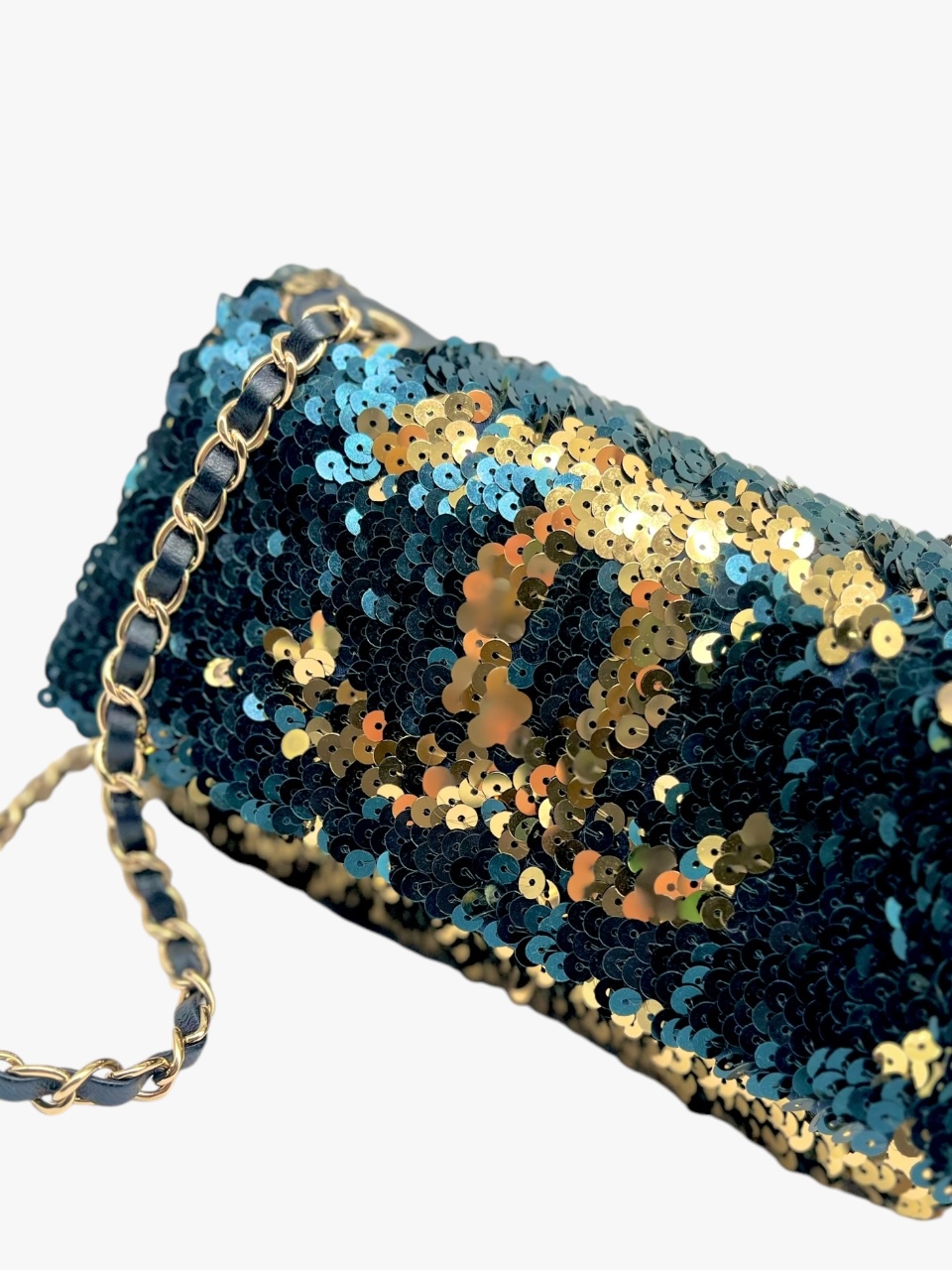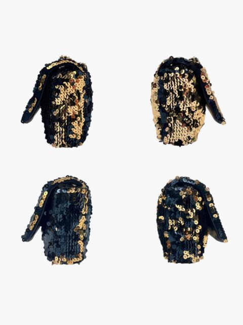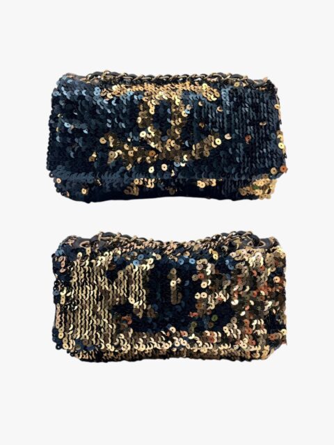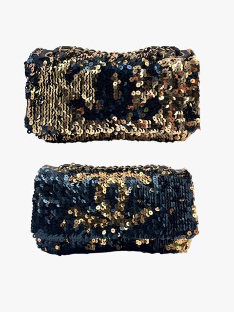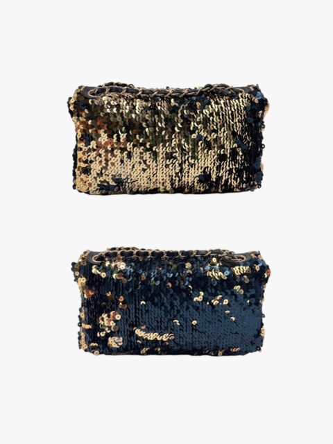 Questa bellissima Borsa Chanel single flap in Paillettes, di colore blu e gold è un oggetto di raffinata delicatezza. Il massimo per una serata scintillante all’insegna del riflesso e del luccichio. Come una volta veniva fatto dagli antichi, che cucivano monete, sui loro capi d’abbigliamento, anche le borse adesso sono diventate un oggetto prezioso da ornare con le paillettes. Dotata di una classica tracolla in pelle intrecciata al metallo, può avere due tipi di colorazione o Gold con le doppie CC Blu o anche viceversa a seconda del verso delle paillettes. Si può anche giocare mixandole insieme nei due colori. Il fondo della borsa e la patta interna sono di pelle colore blu. Anno 2009, misure 25 x 6 x 14 cm, luce tracolla se singola 37 cm. Corredata della sola card, si presenta in buone condizioni.