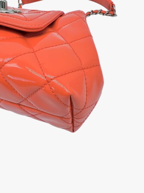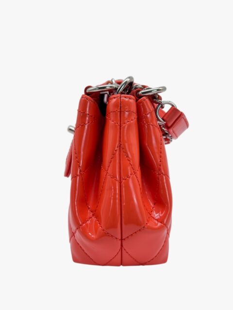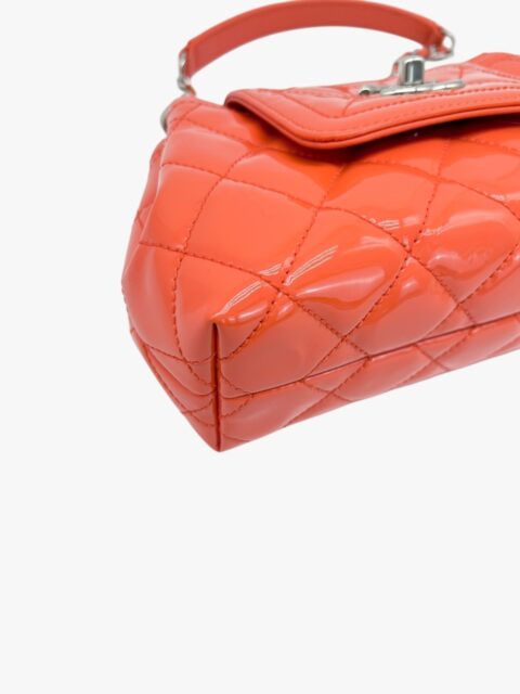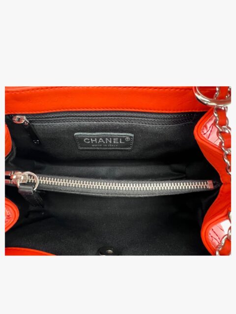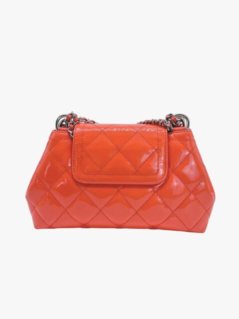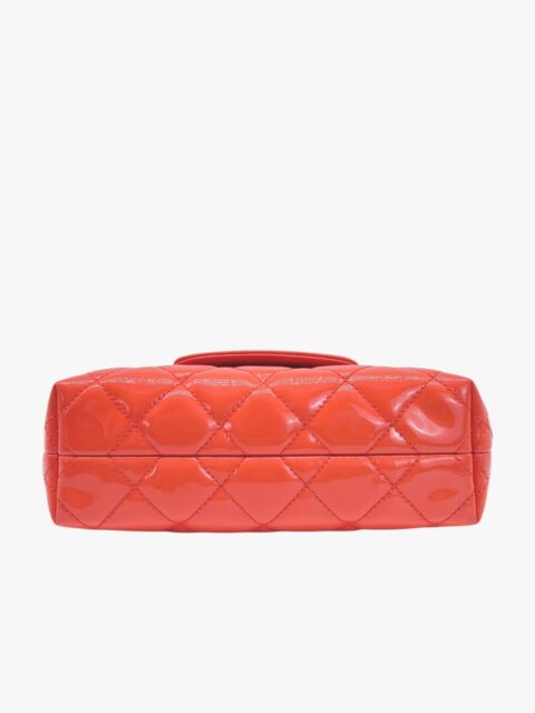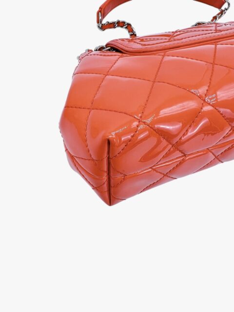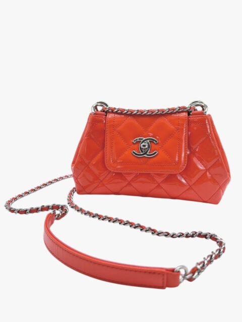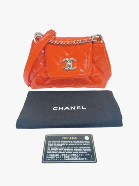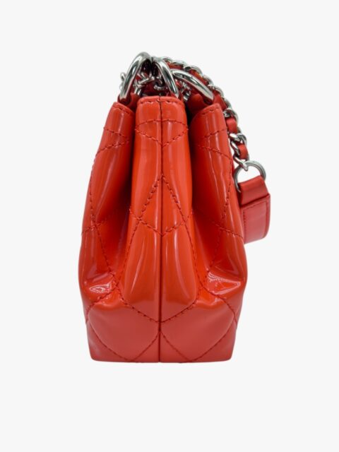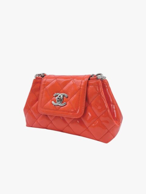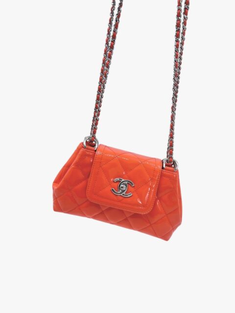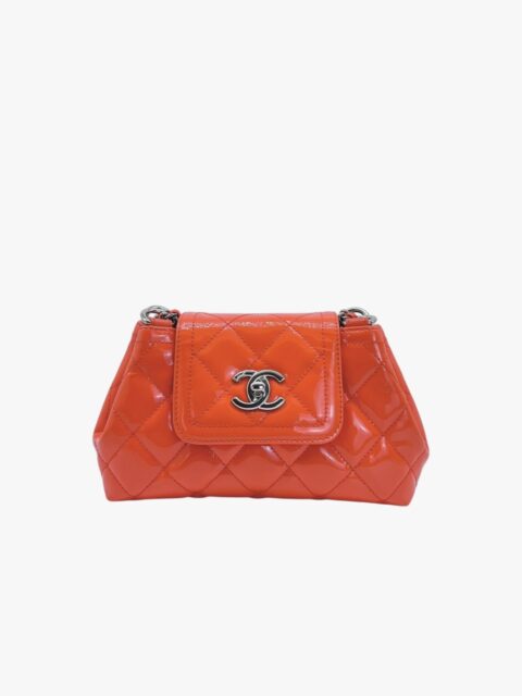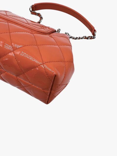Questa elegante borsa a tracolla Chanel è un perfetto equilibrio tra raffinatezza e praticità. Realizzata in pelle verniciata di alta qualità di colore Arancio, si distingue per la sua finitura lucida e la silhouette compatta, tipica del modello pouch.