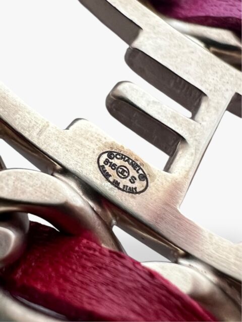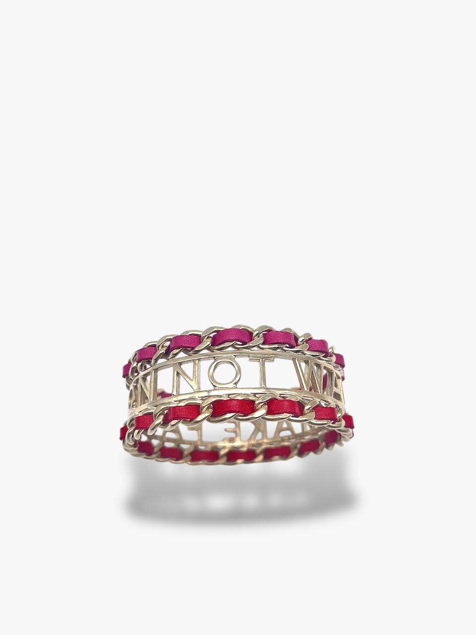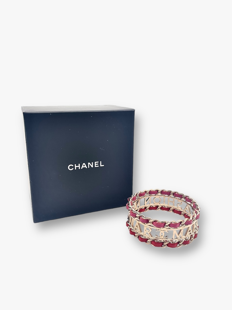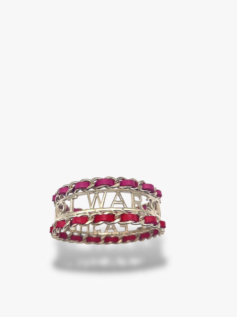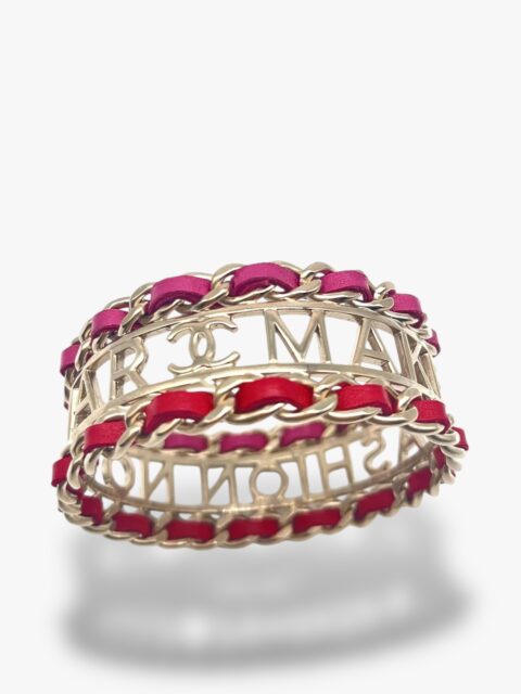 Bracciale Chanel rigido “MAKE FASHION NOT WAR”, cosi riporta la scritta lungo tutta la rotondità del bracciale. Infatti questa collezione del 2015, è stata proprio fatta con slogan contro la guerra. Il bracciale è fatto di metallo light gold e ai bordi della scritta ci sono due catene di pelle intrecciata di due diversi colori : rosso/fucsia. Le misure sono: Circonferenza interna 19,5 cm, Diametro 6,5 cm, Larghezza 3 cm. Si presenta in buone condizioni ed è corredato solo di Box.