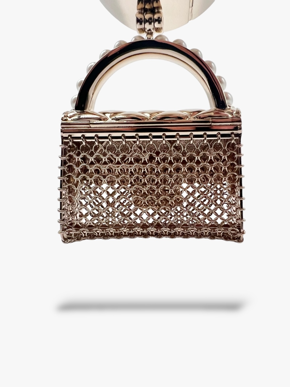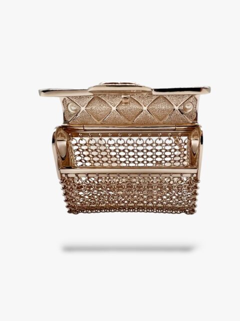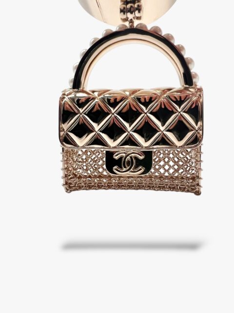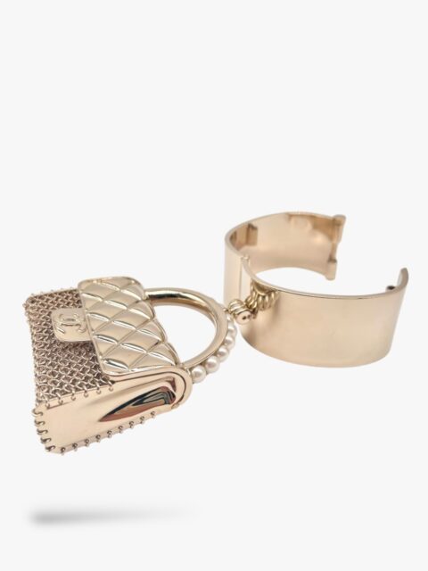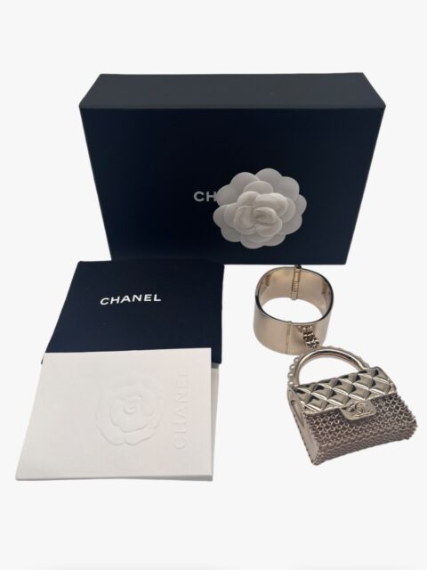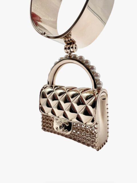 Questo prezioso gioiello di Chanel, è un oggetto Chic che veste la donna che lo indossa. Interamente in metallo light gold, con dettaglio borsa Chanel pendente. Il manico è interamente ricoperto di perle avorio in pasta di vetro. La patta della borsetta si può aprire per metterci dentro piccoli oggetti. Circonferenza interna max 17 cm, diametro 5 x 5 cm, larghezza bracciale 3 cm, misure ciondolo borsa 8 x 6 x 2 cm. Anno 2021, completo di tutto il set: Box, Dustbag e doppio scontrino originale. La manchette si presenta in condizioni nuove, mai usata.