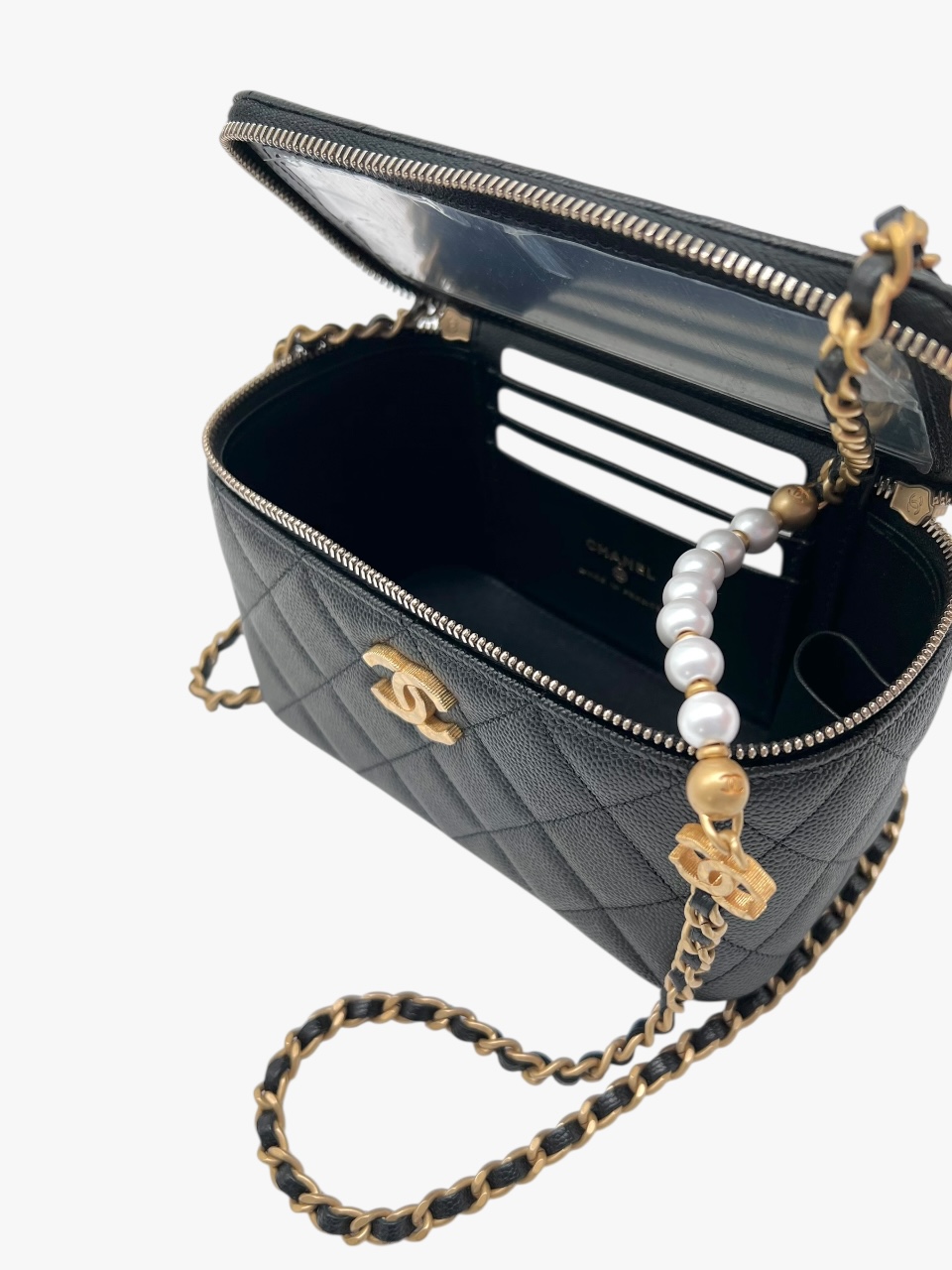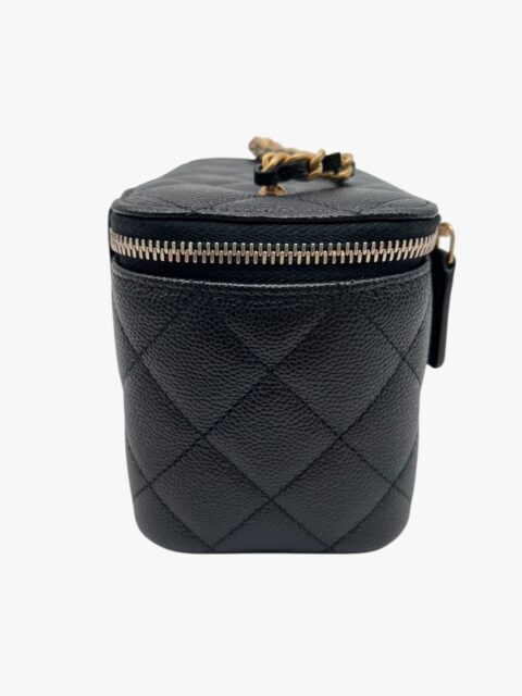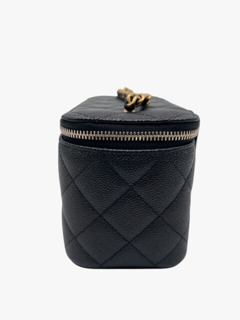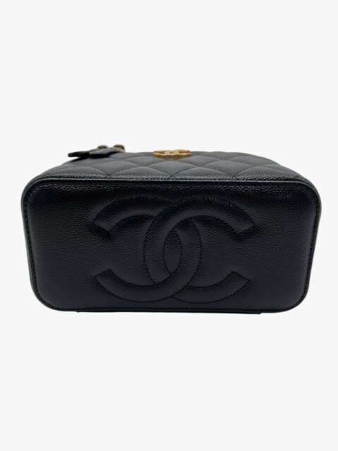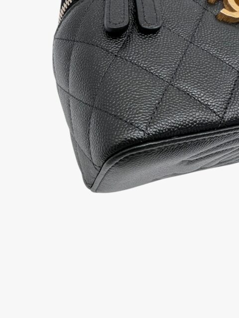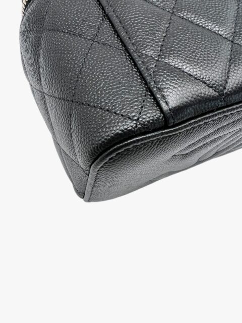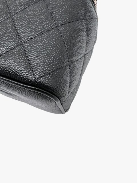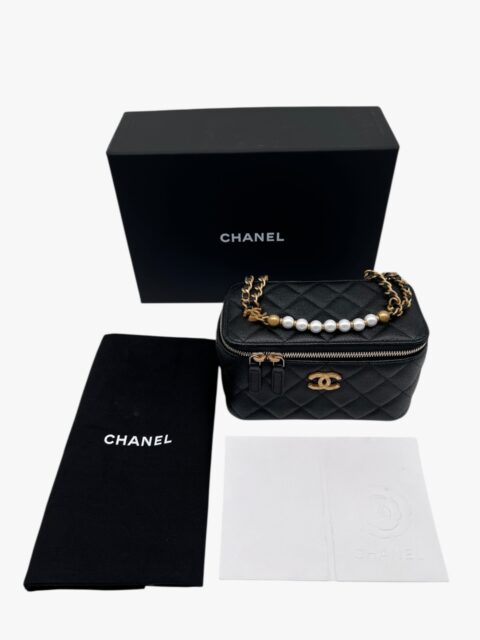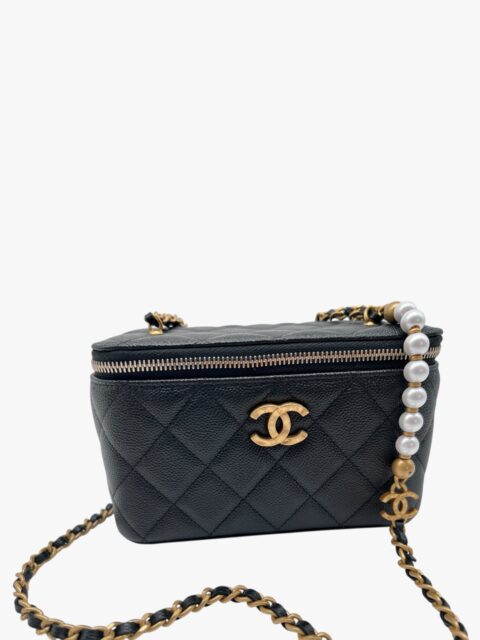 Esclusiva e femminile, questa mini vanity Chanel è realizzata in pregiata pelle caviar – riconosciuta per la sua resistenza e texture distintiva – ed è impreziosita da una tracolla con perle, dettaglio raffinato che richiama l’iconica eleganza della maison.