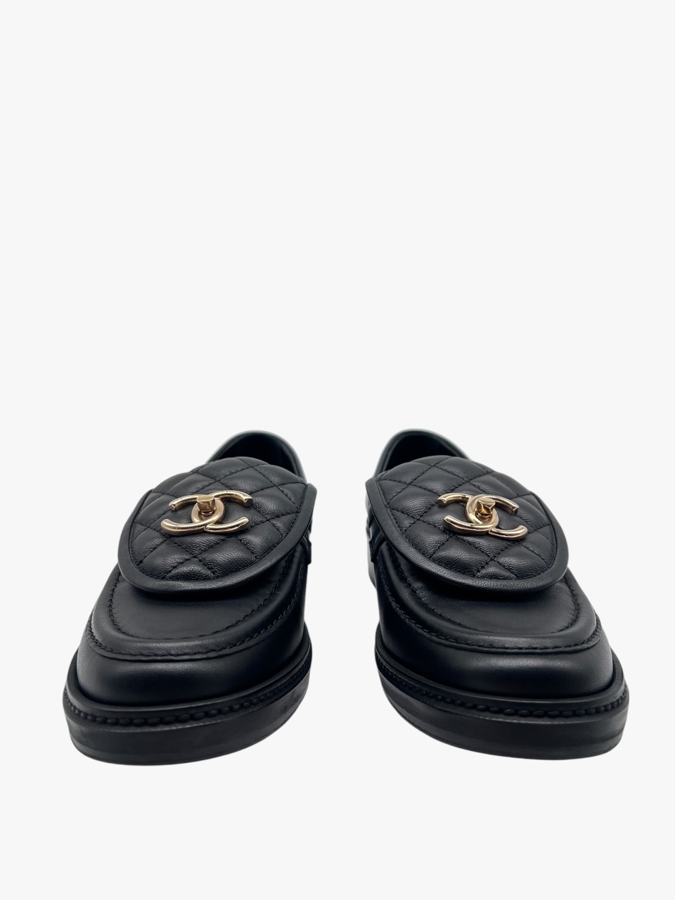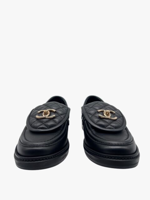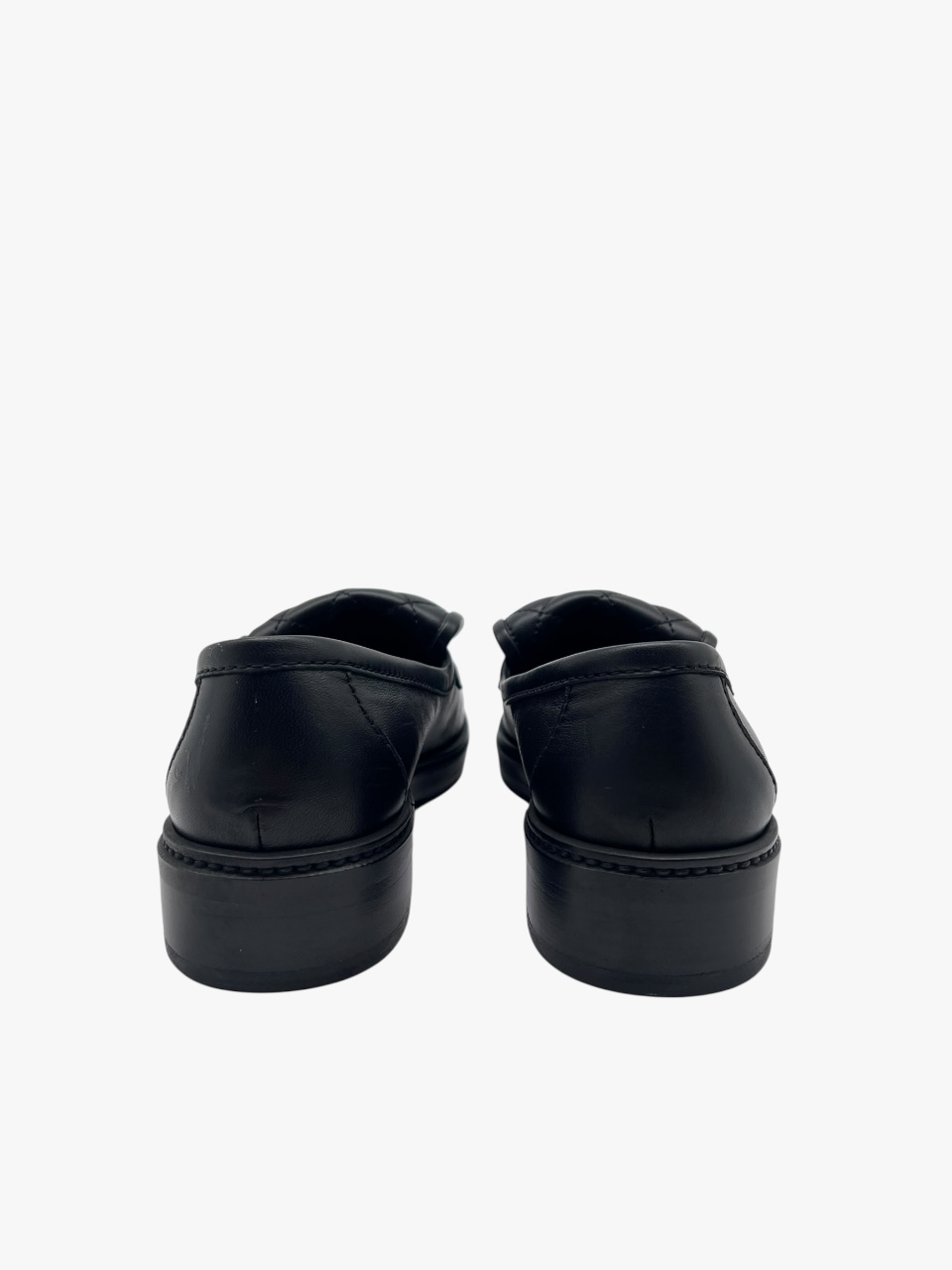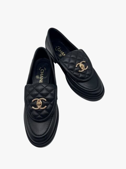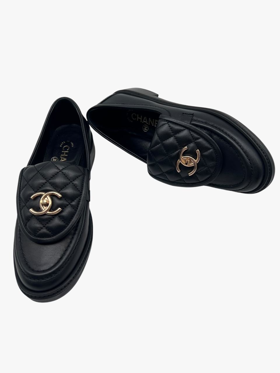 Questi mocassini in pelle nera celebrano lo stile iconico di Chanel grazie alla patta trapuntata a motivo matelassé, simbolo inconfondibile della Maison. La linea essenziale incontra il dettaglio lussuoso del logo dorato “CC” intrecciato, trasformando un modello classico in un accessorio di eleganza assoluta. In pelle di agnello, raffinati e versatili, si abbinano con naturalezza a look formali e casual-chic, regalando un tocco immediatamente riconoscibile di stile senza tempo.