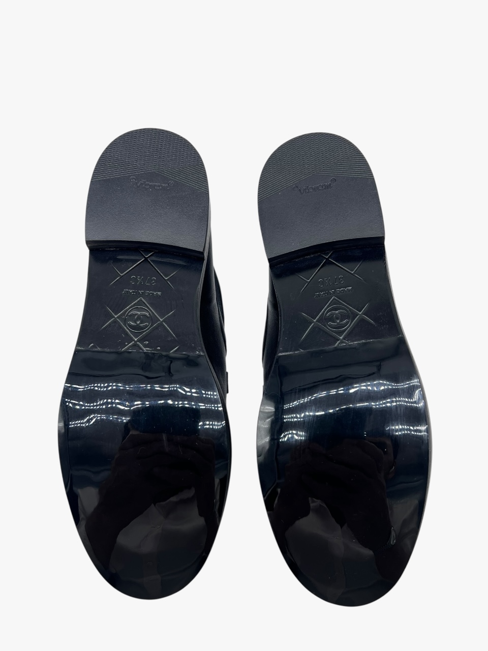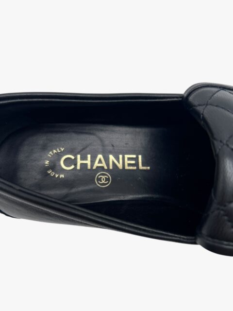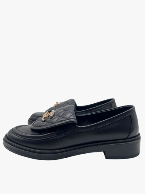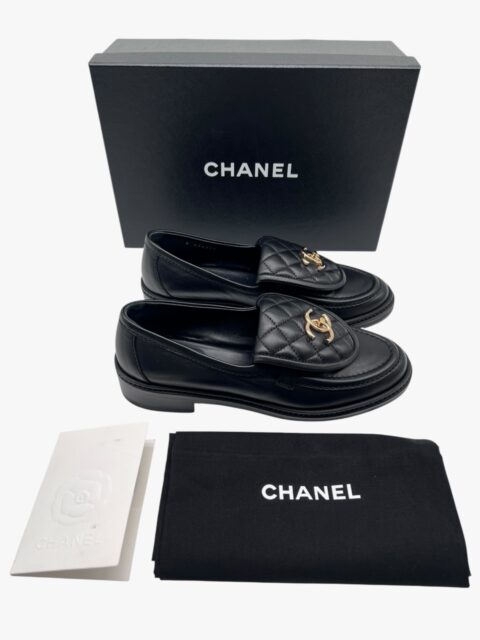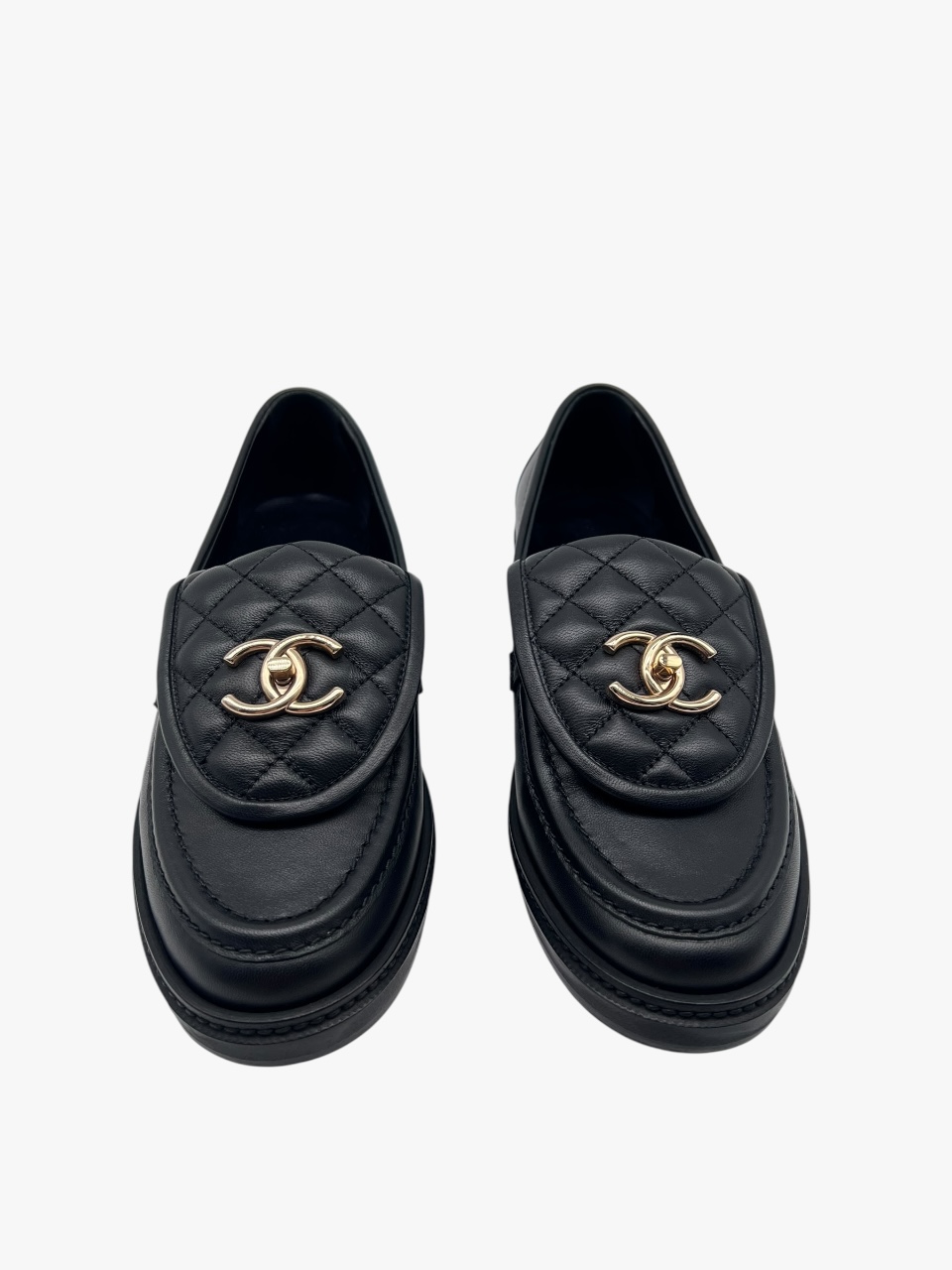 Questi mocassini in pelle nera celebrano lo stile iconico di Chanel grazie alla patta trapuntata a motivo matelassé, simbolo inconfondibile della Maison. La linea essenziale incontra il dettaglio lussuoso del logo dorato “CC” intrecciato, trasformando un modello classico in un accessorio di eleganza assoluta. In pelle di agnello, raffinati e versatili, si abbinano con naturalezza a look formali e casual-chic, regalando un tocco immediatamente riconoscibile di stile senza tempo.