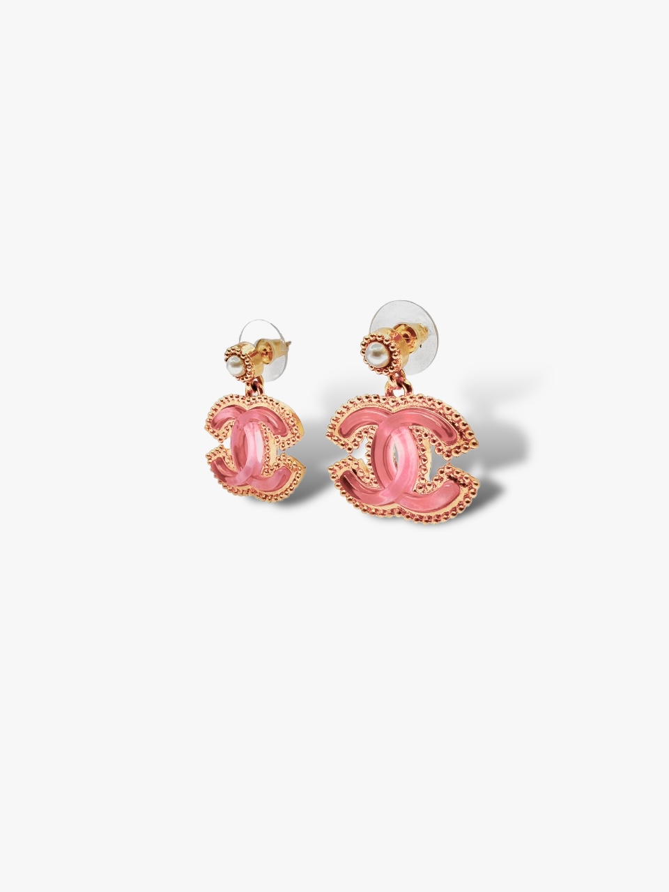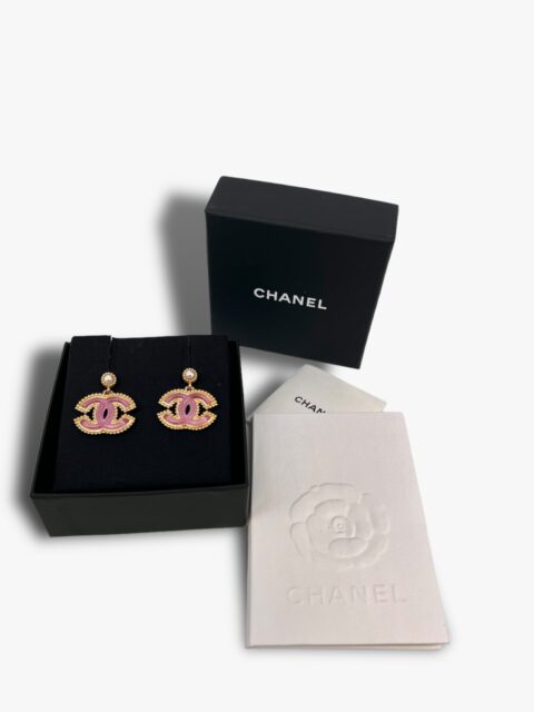 Orecchini Chanel a lobo con perla e doppie CC in resina color rosa chiaro pendenti. Anno 2024, misure 2.5 x 3 cm si presentano in ottime condizioni, corredati del Box e della fattura.