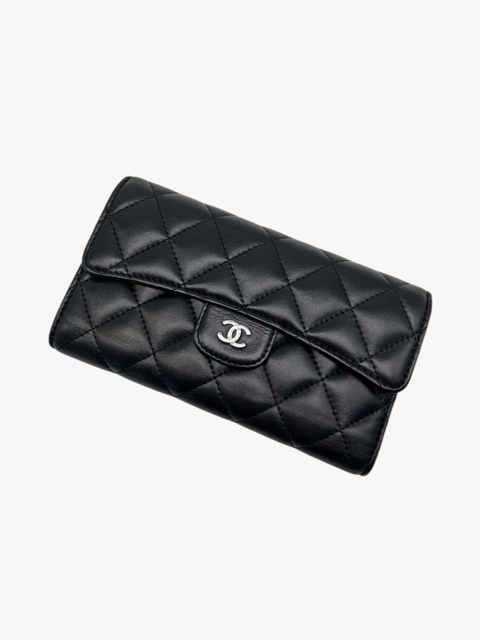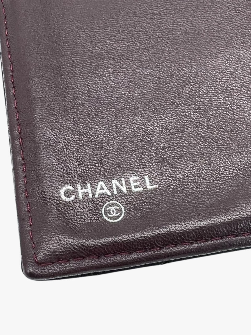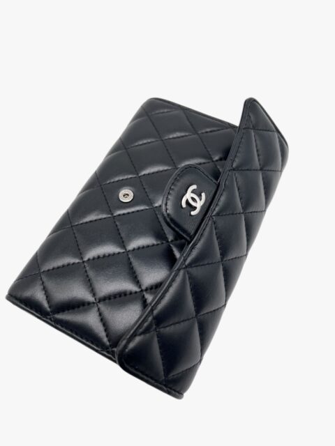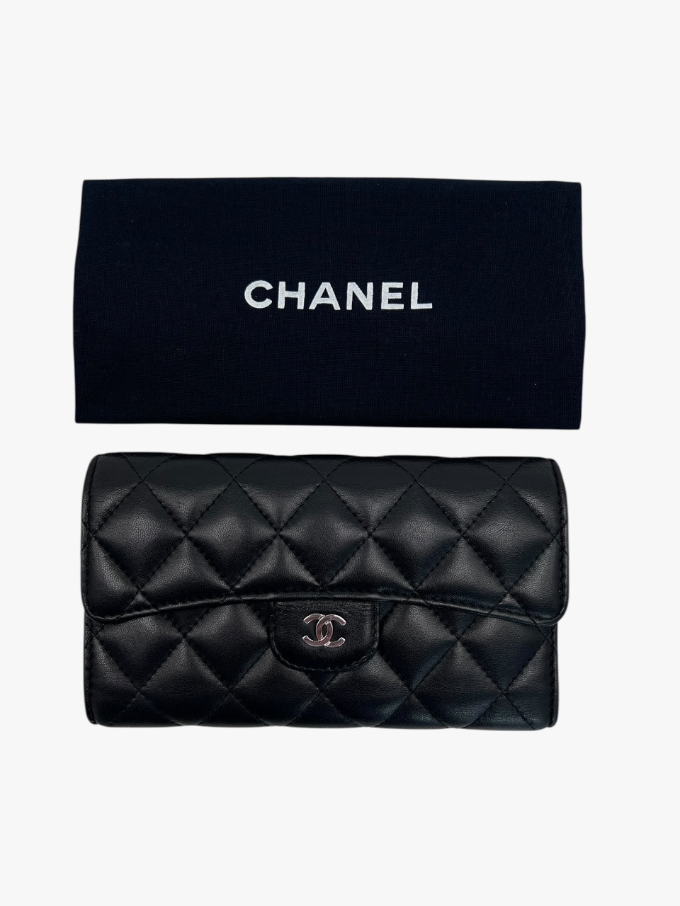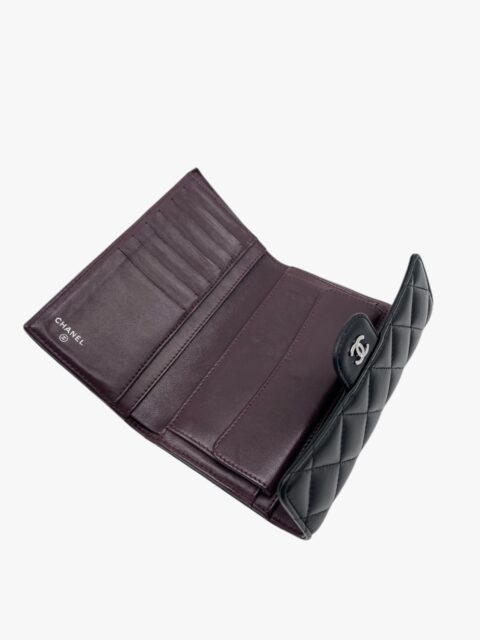 Eleganza senza tempo in formato, portafoglio classico con patta firmato CHANEL è un accessorio iconico che racchiude tutta la raffinatezza della Maison. Realizzato in morbida pelle d’agnello trapuntata di colore Nero, presenta la distintiva lavorazione matelassé e il celebre logo CC in metallo Silver, simbolo di lusso e tradizione. La chiusura della patta è con bottone a pressione e la parte interna è di pelle color Borgogna. Tasca porta monete applicata con patta e bottone a pressione. Tre tasche aperte con 6 slot porta tessere o carte di credito. Vano porta banconote foderato in tessuto tono su tono. Anno 2016, Misure 18 x 10,5 x 3 CM. Si presenta in buone condizioni, anche se al tatto si sente che la pelle è vissuta con un buon grado di morbidezza e si evincono leggeri segni di usura anche sulle doppie cc della patta frontale.