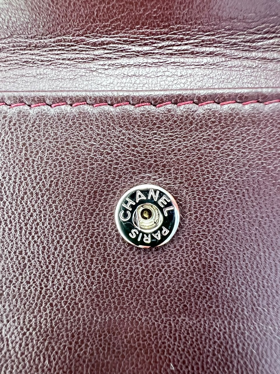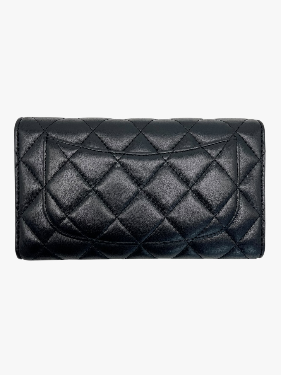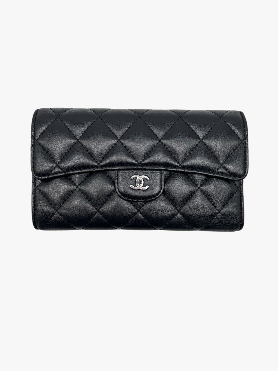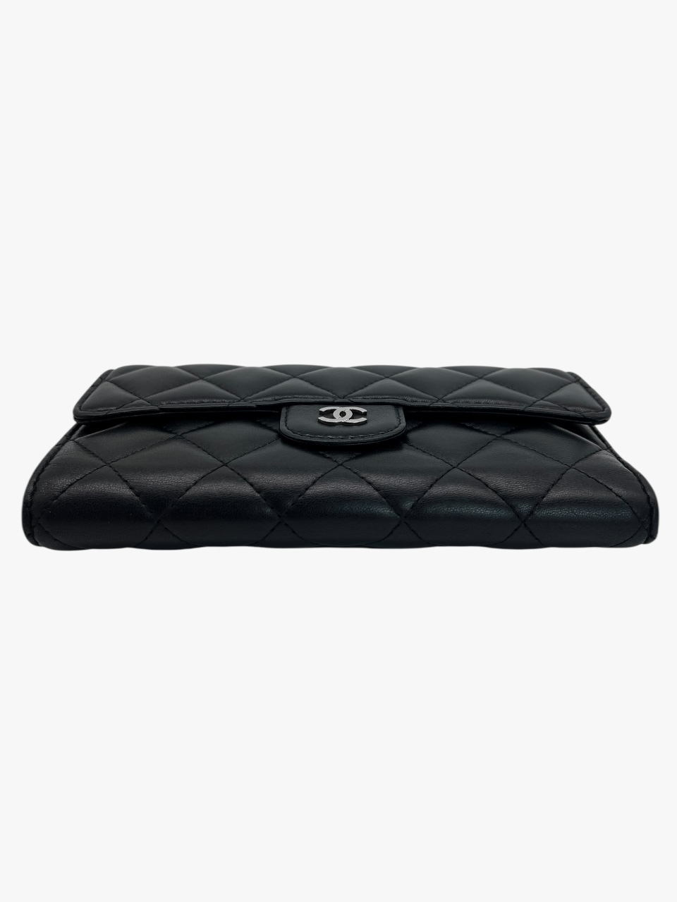 Eleganza senza tempo in formato, portafoglio classico con patta firmato CHANEL è un accessorio iconico che racchiude tutta la raffinatezza della Maison. Realizzato in morbida pelle d’agnello trapuntata di colore Nero, presenta la distintiva lavorazione matelassé e il celebre logo CC in metallo Silver, simbolo di lusso e tradizione. La chiusura della patta è con bottone a pressione e la parte interna è di pelle color Borgogna. Tasca porta monete applicata con patta e bottone a pressione. Tre tasche aperte con 6 slot porta tessere o carte di credito. Vano porta banconote foderato in tessuto tono su tono. Anno 2016, Misure 18 x 10,5 x 3 CM. Si presenta in buone condizioni, anche se al tatto si sente che la pelle è vissuta con un buon grado di morbidezza e si evincono leggeri segni di usura anche sulle doppie cc della patta frontale.