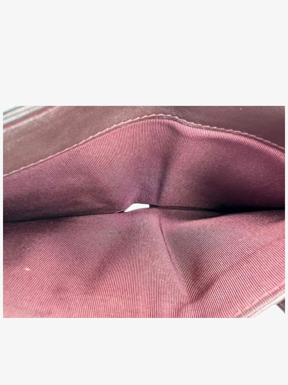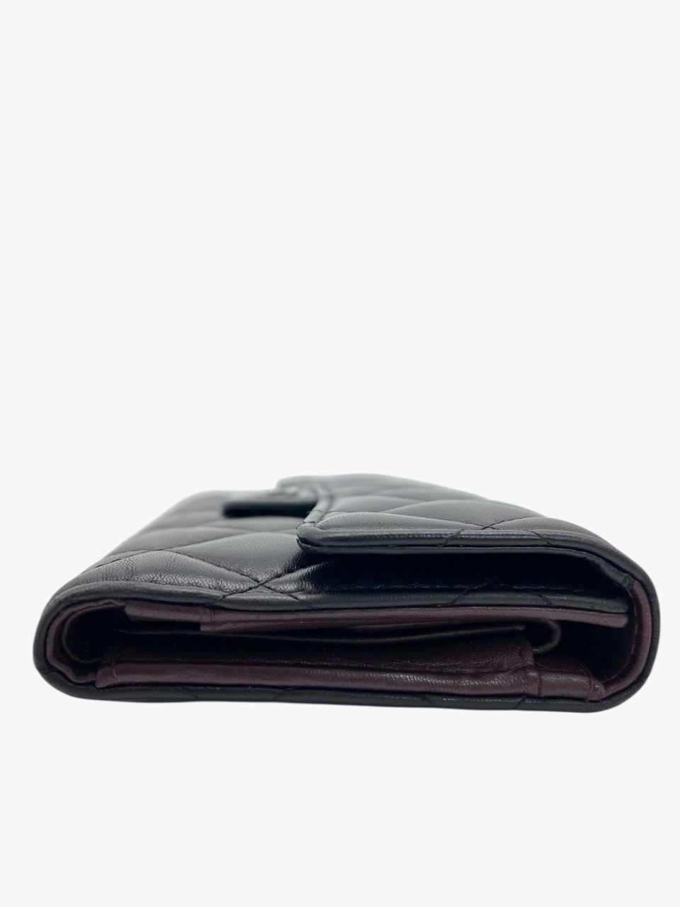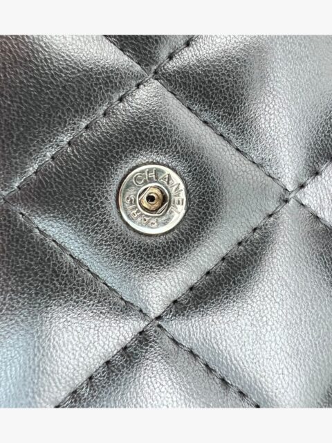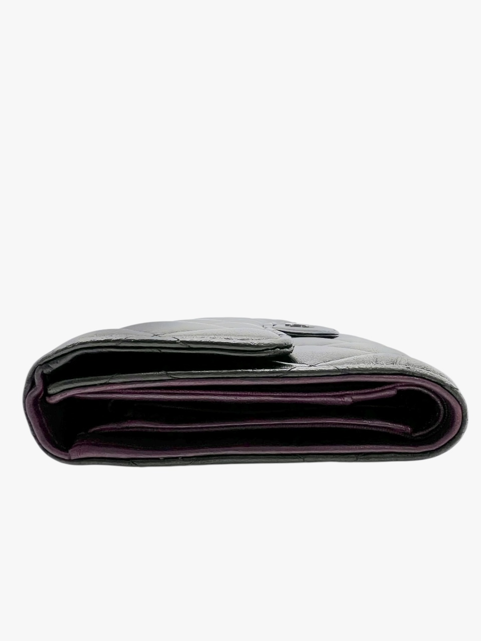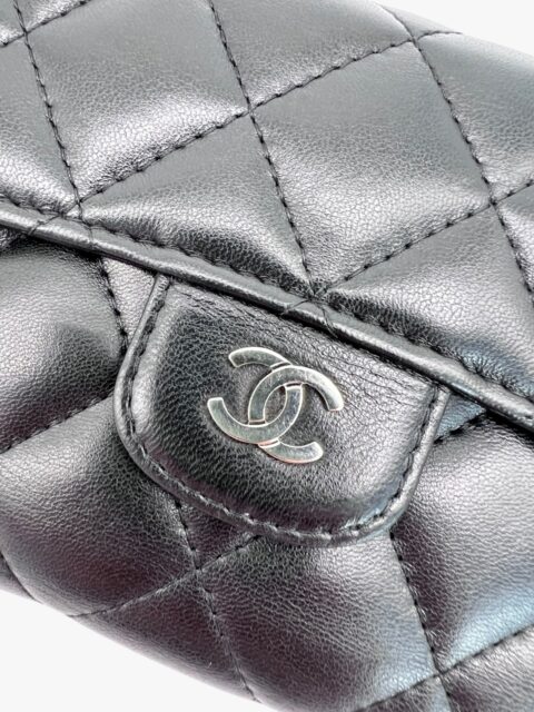 Eleganza senza tempo in formato, portafoglio classico con patta firmato CHANEL è un accessorio iconico che racchiude tutta la raffinatezza della Maison. Realizzato in morbida pelle d’agnello trapuntata di colore Nero, presenta la distintiva lavorazione matelassé e il celebre logo CC in metallo Silver, simbolo di lusso e tradizione. La chiusura della patta è con bottone a pressione e la parte interna è di pelle color Borgogna. Tasca porta monete applicata con patta e bottone a pressione. Tre tasche aperte con 6 slot porta tessere o carte di credito. Vano porta banconote foderato in tessuto tono su tono. Anno 2016, Misure 18 x 10,5 x 3 CM. Si presenta in buone condizioni, anche se al tatto si sente che la pelle è vissuta con un buon grado di morbidezza e si evincono leggeri segni di usura anche sulle doppie cc della patta frontale.