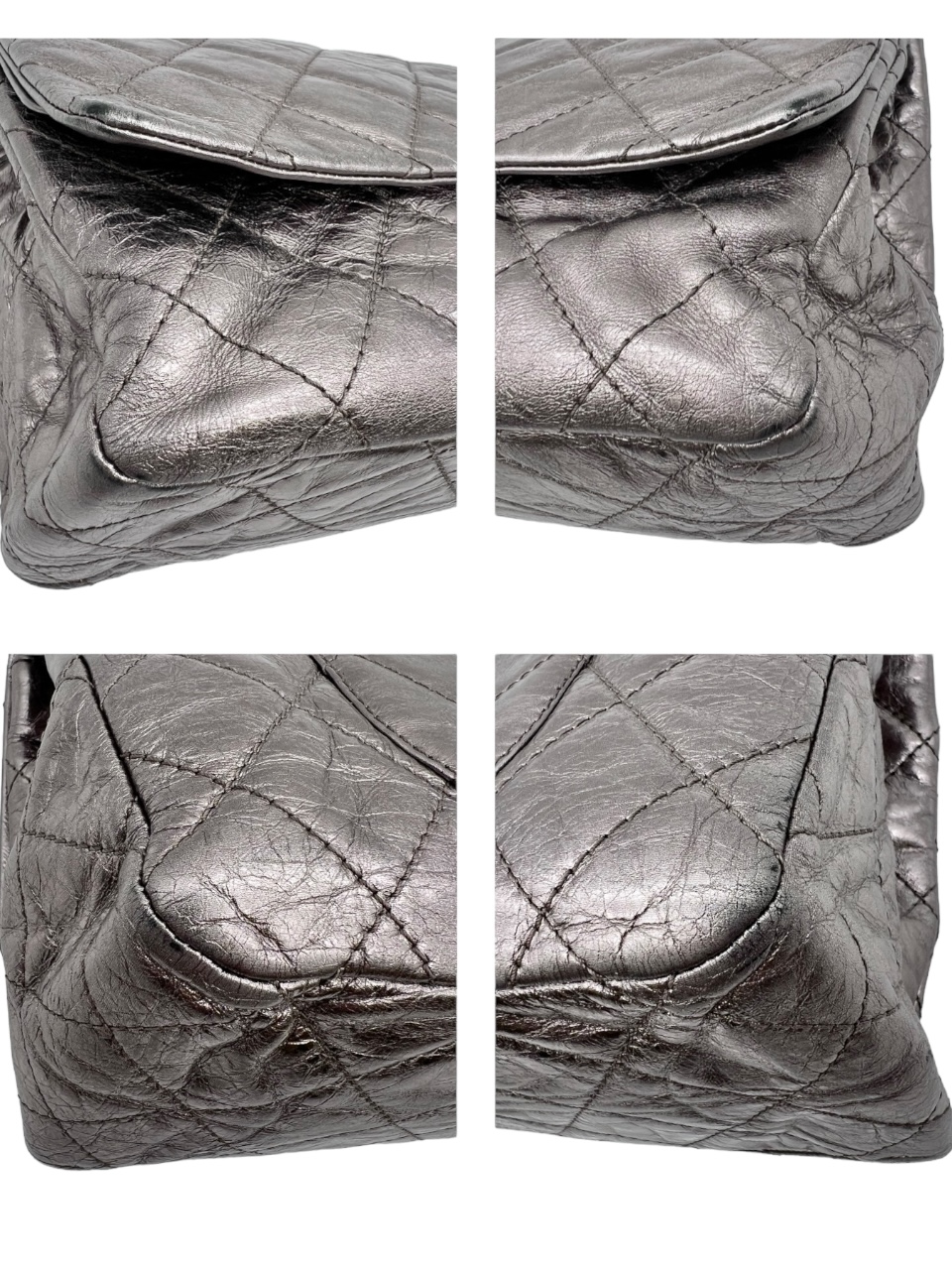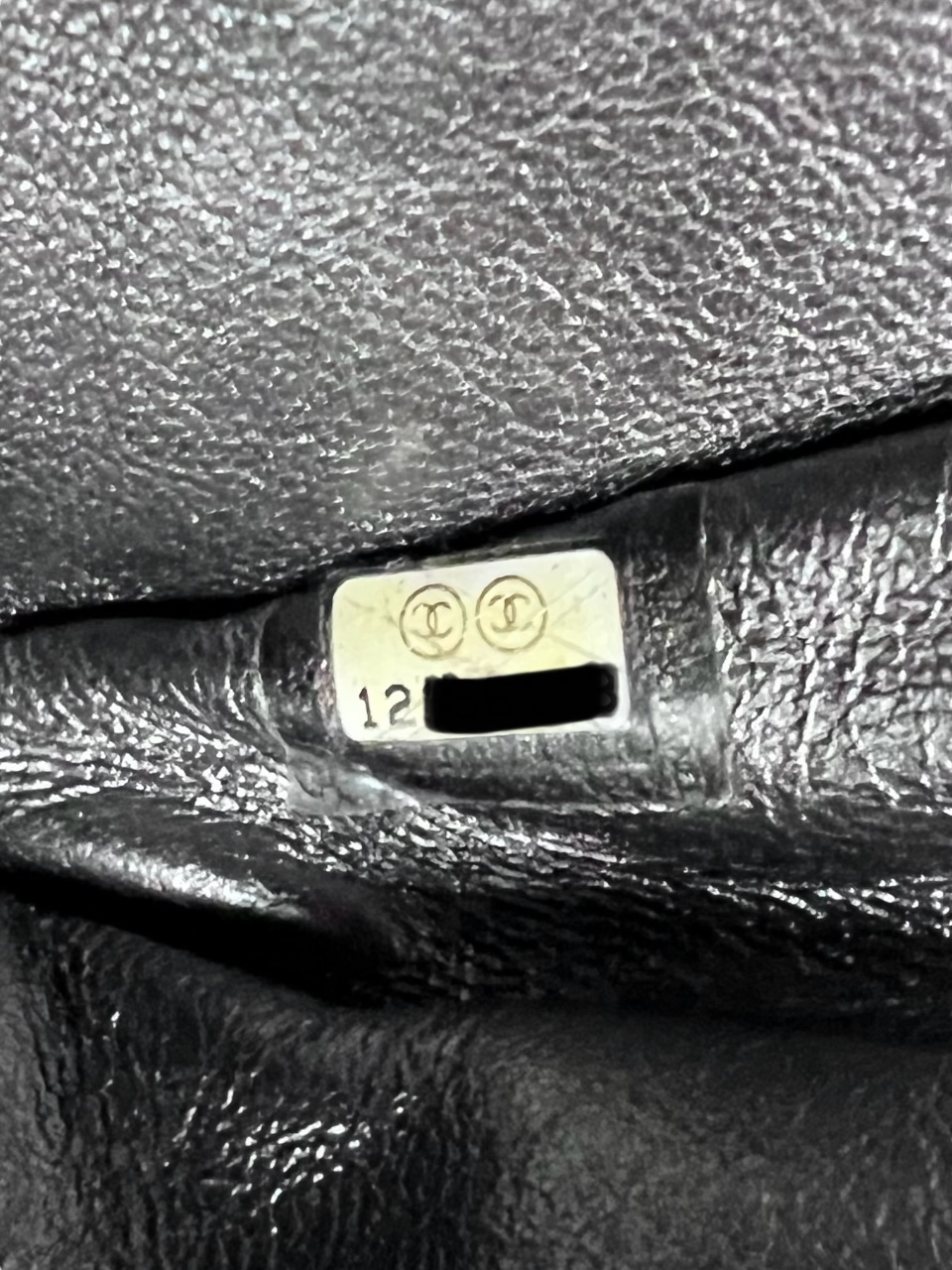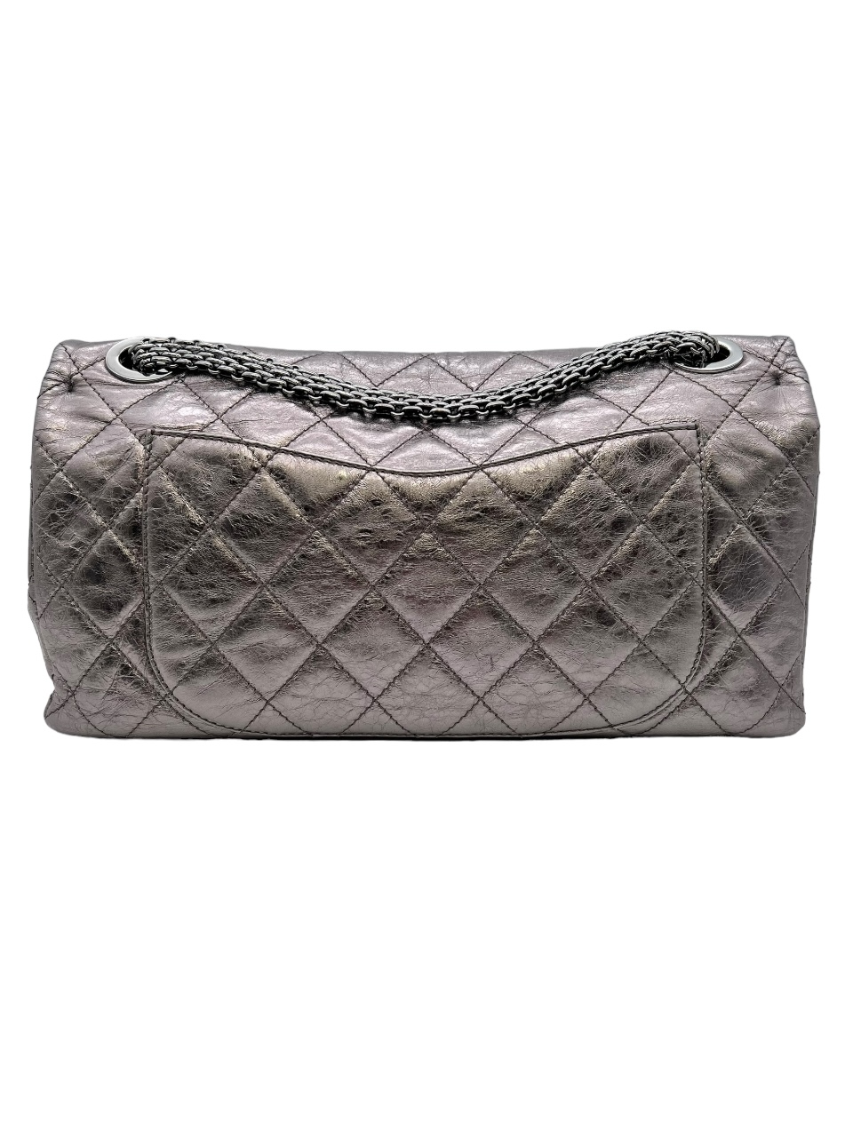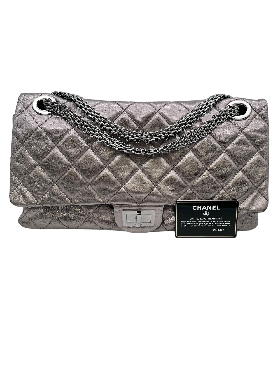 L’ Inconfondibile chiusura rettangolare a torsione di questa borsa, con l’emblematica scritta chanel in basso, e la lunga catena di intrecci metallici sono state la prima versione, montate sulle borse a tracolla invitate da Gabrielle Chanel. Questa bellissima e capiente borsa per via delle sue dimensioni, è una classica intramontabile della casa Chanel. Struttura morbida e pelle effetto invecchiato in questo colore Argento la rendono un must have. Anno 2009, Misure 35 x 11 x 18 cm, corredata della sua Card.