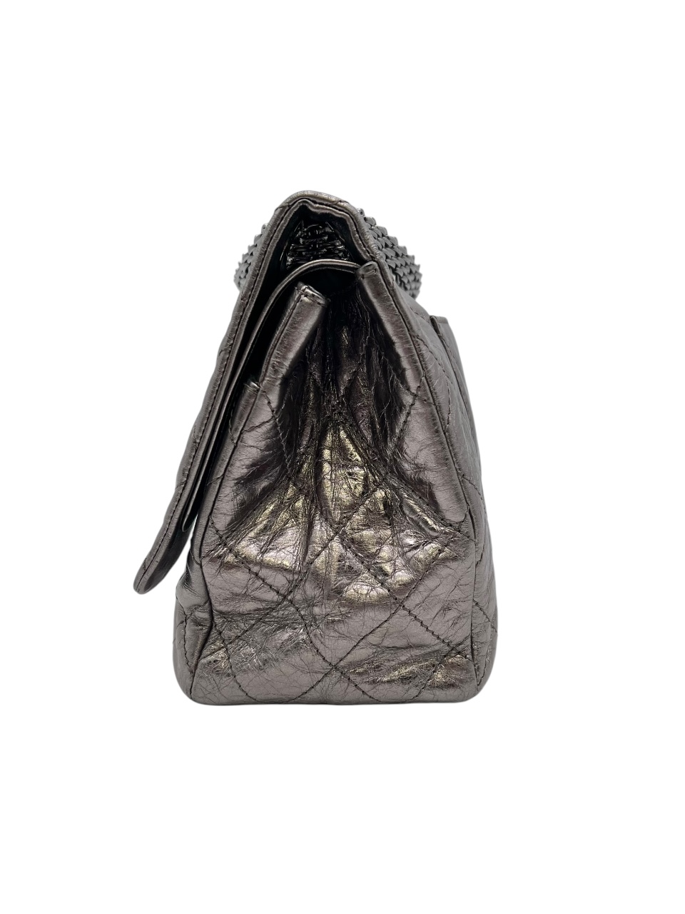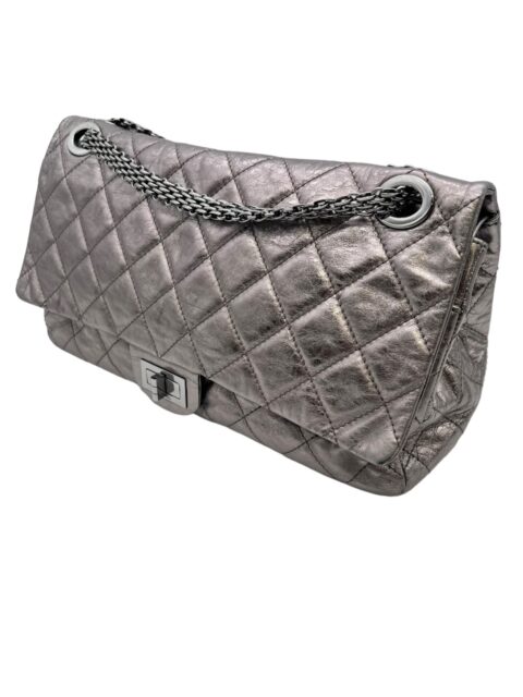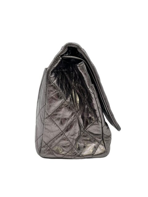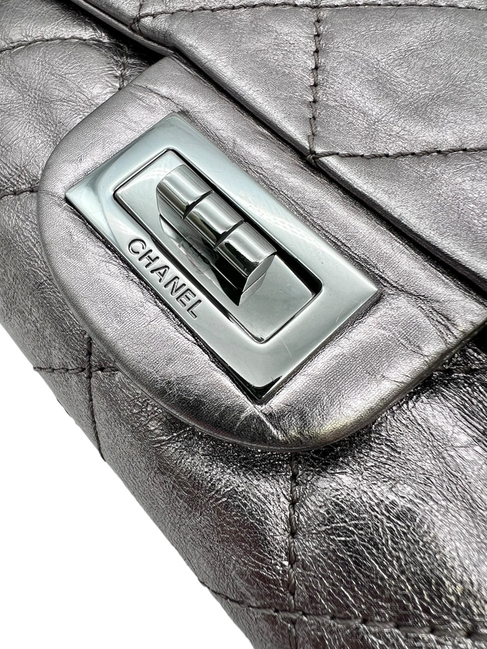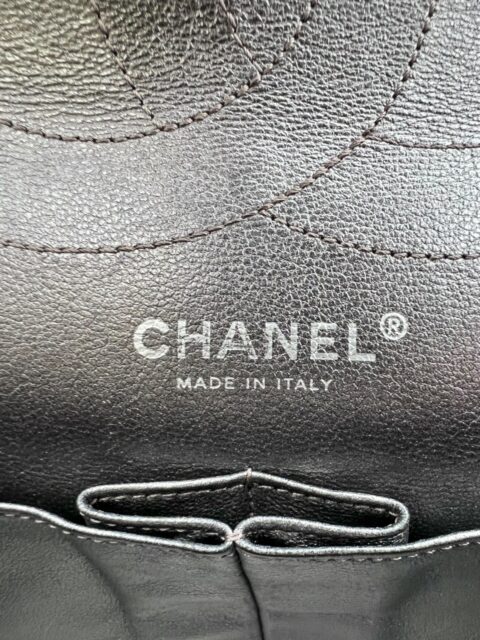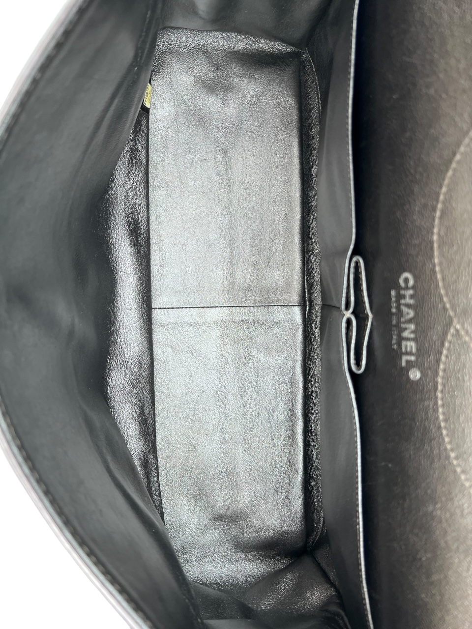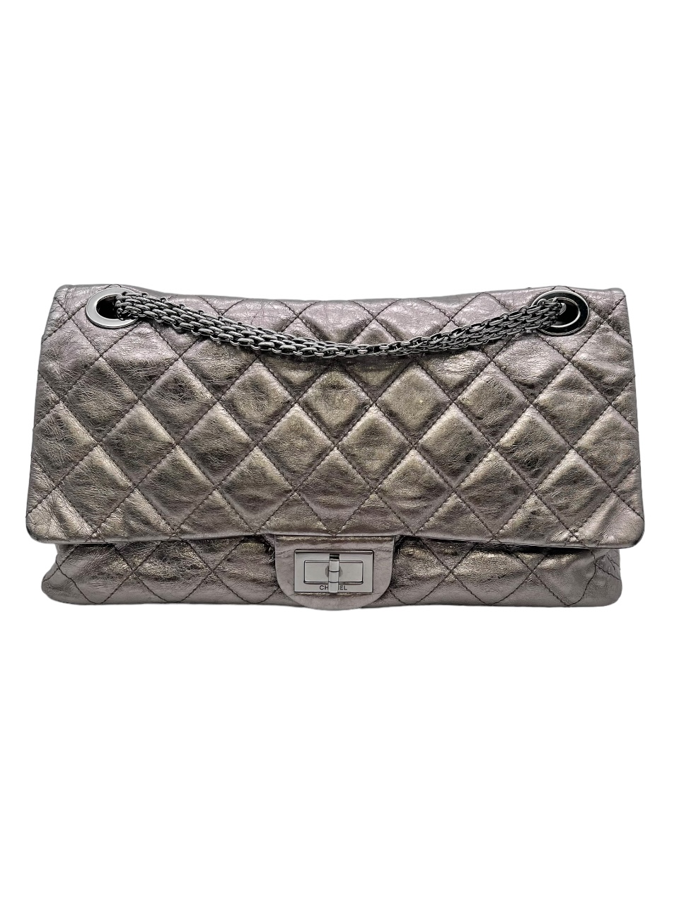 L’ Inconfondibile chiusura rettangolare a torsione di questa borsa, con l’emblematica scritta chanel in basso, e la lunga catena di intrecci metallici sono state la prima versione, montate sulle borse a tracolla invitate da Gabrielle Chanel. Questa bellissima e capiente borsa per via delle sue dimensioni, è una classica intramontabile della casa Chanel. Struttura morbida e pelle effetto invecchiato in questo colore Argento la rendono un must have. Anno 2009, Misure 35 x 11 x 18 cm, corredata della sua Card.
