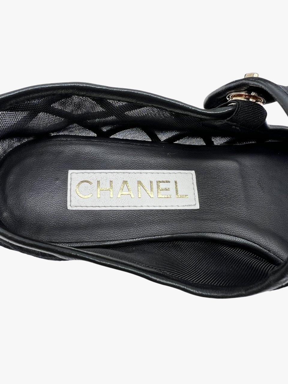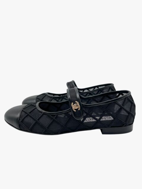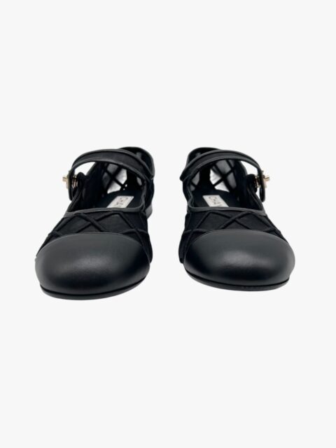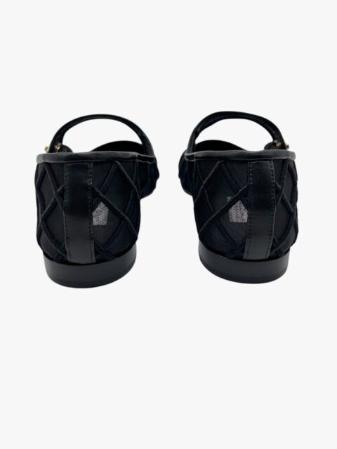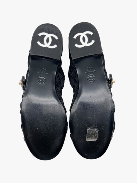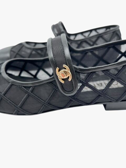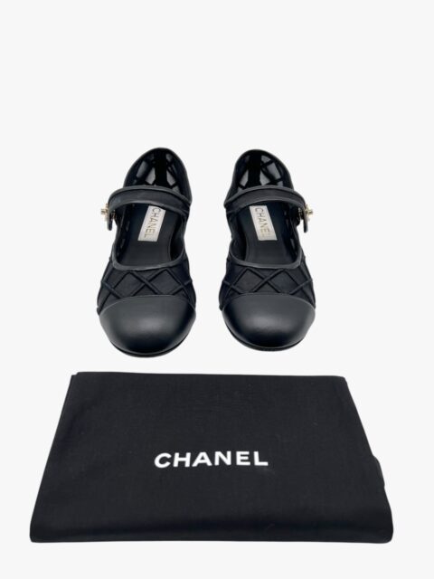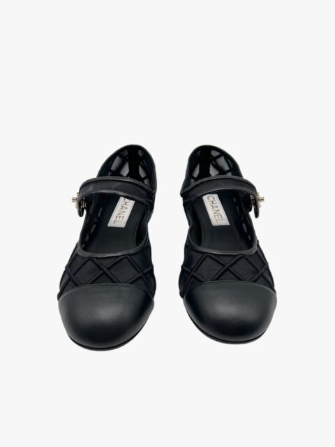 Scarpa Chanel modello Mary Jane, in tessuto tessuto tecnico semi-trasparente, con impunture matelassé. La punta e i bordi della scarpa sono in pelle nera liscia. Il tocco di classe è dato dalla chiusura CC a torsione, in metallo light gold, applicata sulla linguetta superiore. Misura 40, tacco basso 1.5 cm, soletta interna 26 cm. La scarpa si presenta in buone condizioni, nonostante siano state utilizzate più volte. Presentano segni di usura sulla suola come si evince da foto. Corredate delle Dustbag.