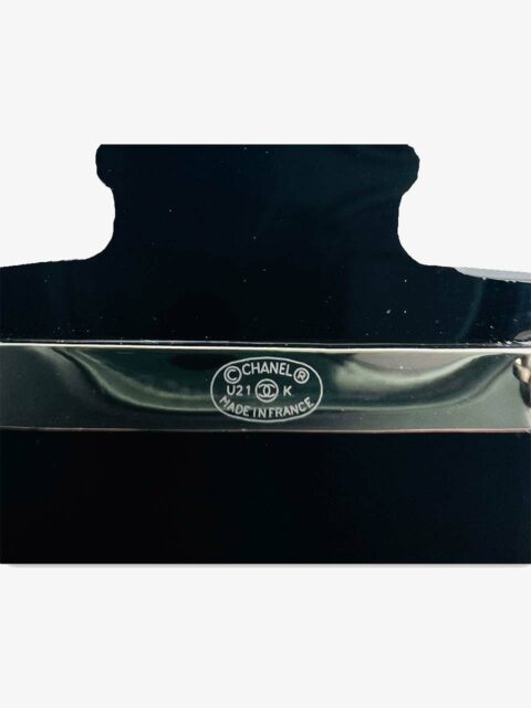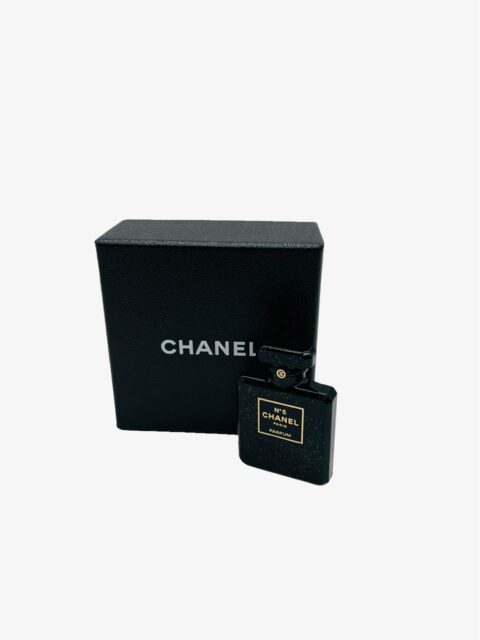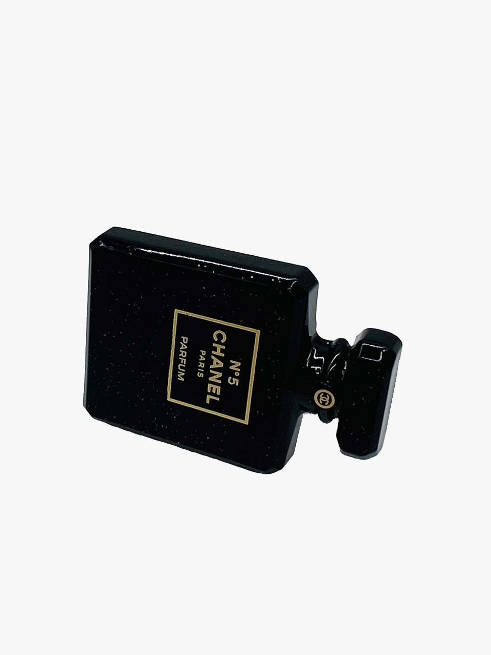 Spilla Chanel bottiglia di profumo n°5, in resina nero lucido, con glitter color gold,