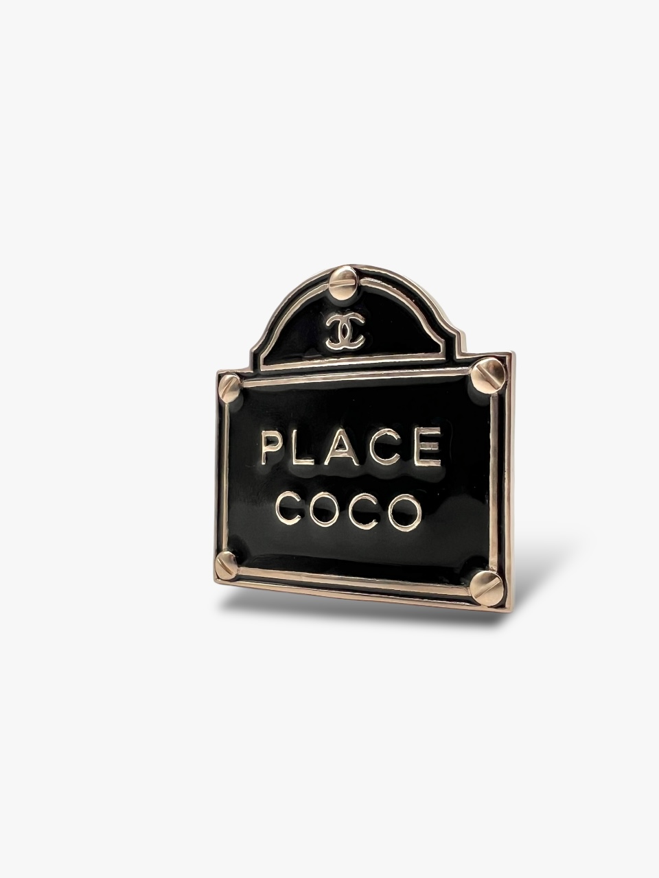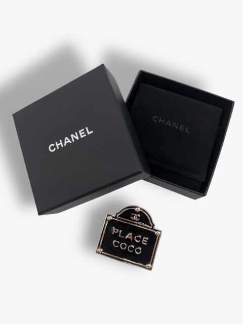 Spilla Chanel Place Coco, in metallo Light Gold e Smalto Nero Lucido. Anno 2015, Misure 5 x 5 cm. Si presenta in ottime condizioni, corredato del Box.