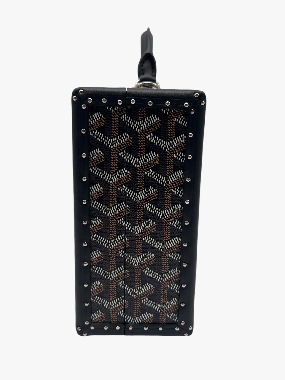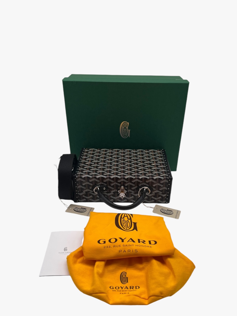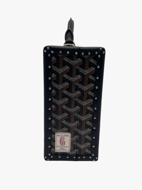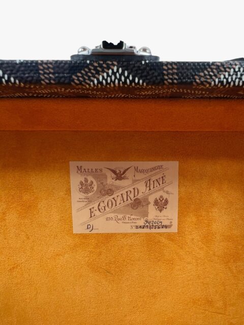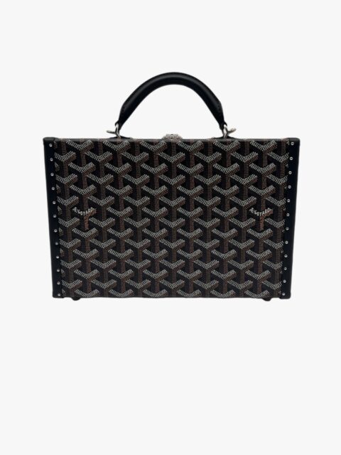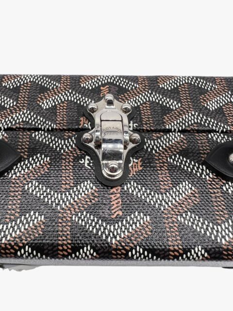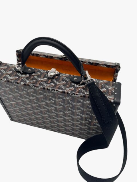 Grand Hotel Trunk bag nera di Goyard, in tela Goyardine e pelle bovina Clamecy, rende omaggio all’esperienza nella produzione di bauli così cara a Maison Goyard. È la dimensione ideale per tenere al sicuro gli elementi essenziali di tutti i giorni e combina eleganza, raffinatezza e una sensazione di leggerezza. Con il suo cinturino aggiuntivo la borsa può essere indossata in diversi modi, in particolare con la tracolla, come si può evincere dalle foto. L’interno è in pelle di vitello in camoscio Tavenay giallo e la metalleria è Palladio. Presenta i manici rotondi con finitura in pelle e borchie sui lati e sotto il Trunk. Le misure sono: 24,5 cm x 7,7 cm x 17 cm. Il Trunk presenta ottime condizioni, dotato di tracolla, dustbag, box e scontrino originale.