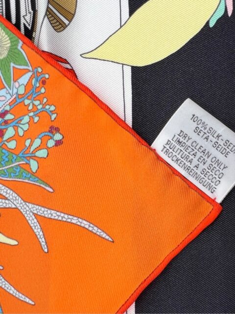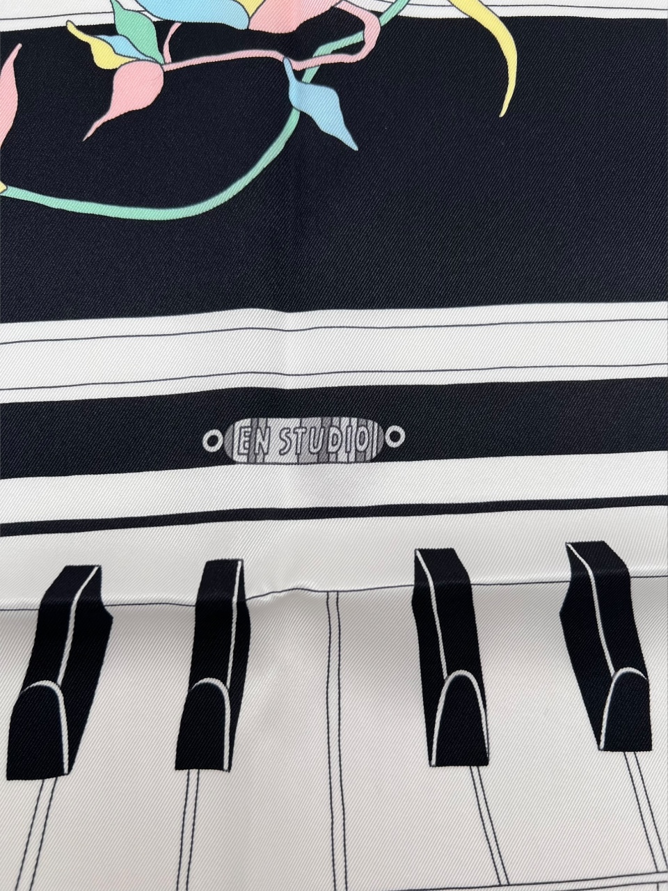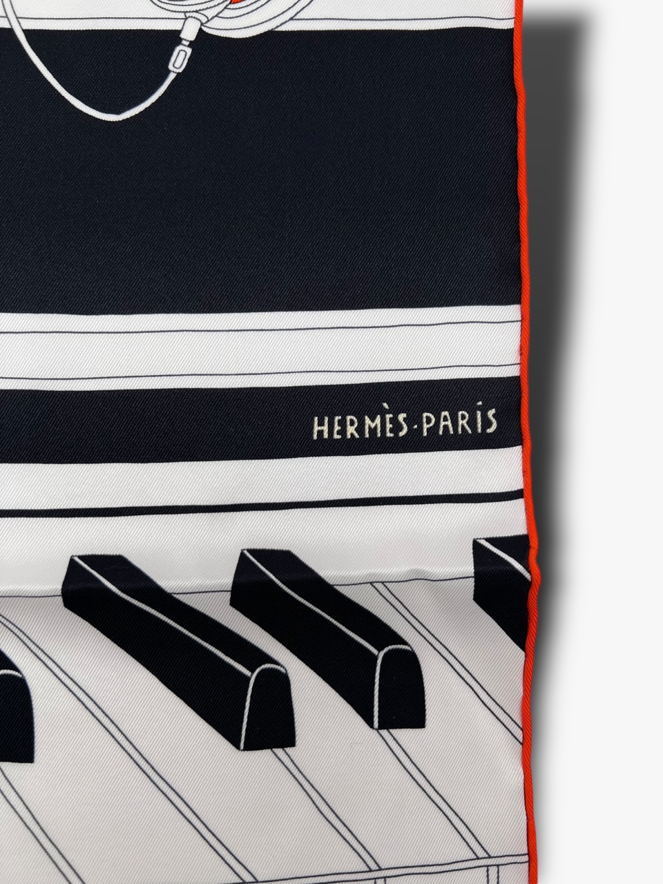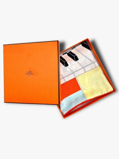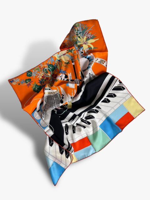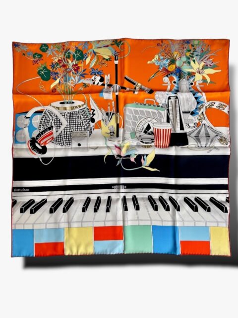 Do, Sol, Sol, La… No. Sol, Sol, Re, Mi… Neanche. La sequenza suona male, oggi sembra impossibile trovare la melodia giusta. Lento: i tasti del pianoforte suonano un tempo monotono, il metronomo oscilla con insolente nonchalance e il microfono volta le spalle. Poi Re, Mi, Fa, Si, Sol… c’è del moderato nell’aria. Re, Mi, Fa, Si, Sol… Ecco che il tamburello comincia a vibrare. La lira invece si crede un vaso e all’improvviso inizia a fiorire, sprigionando una gioia contagiosa che porta subito il tempo ben oltre l’allegro. Anche la cannuccia, nel suo bicchiere a strisce, balla facendo l’hula hoop. Presto, presto, lo spartito colorato segue il ritmo! Le classifiche musicali si preparino: è in arrivo la nuova hit di Carine Brancowitz. Orlato a mano in seta vintage, nella misura 70 x 70, nuovo mai usato, corredato di Box.