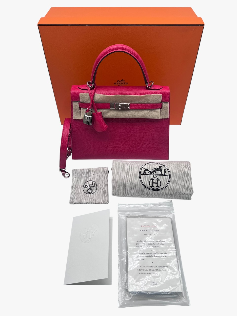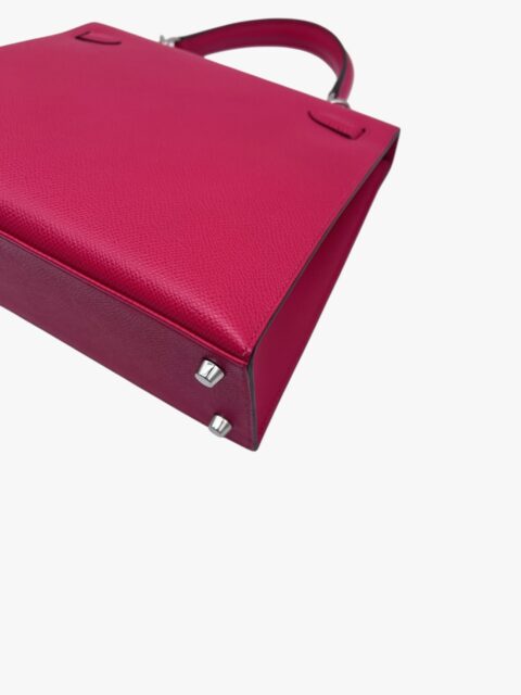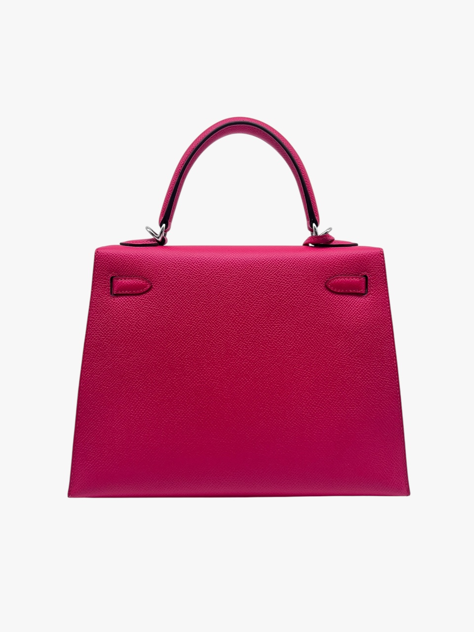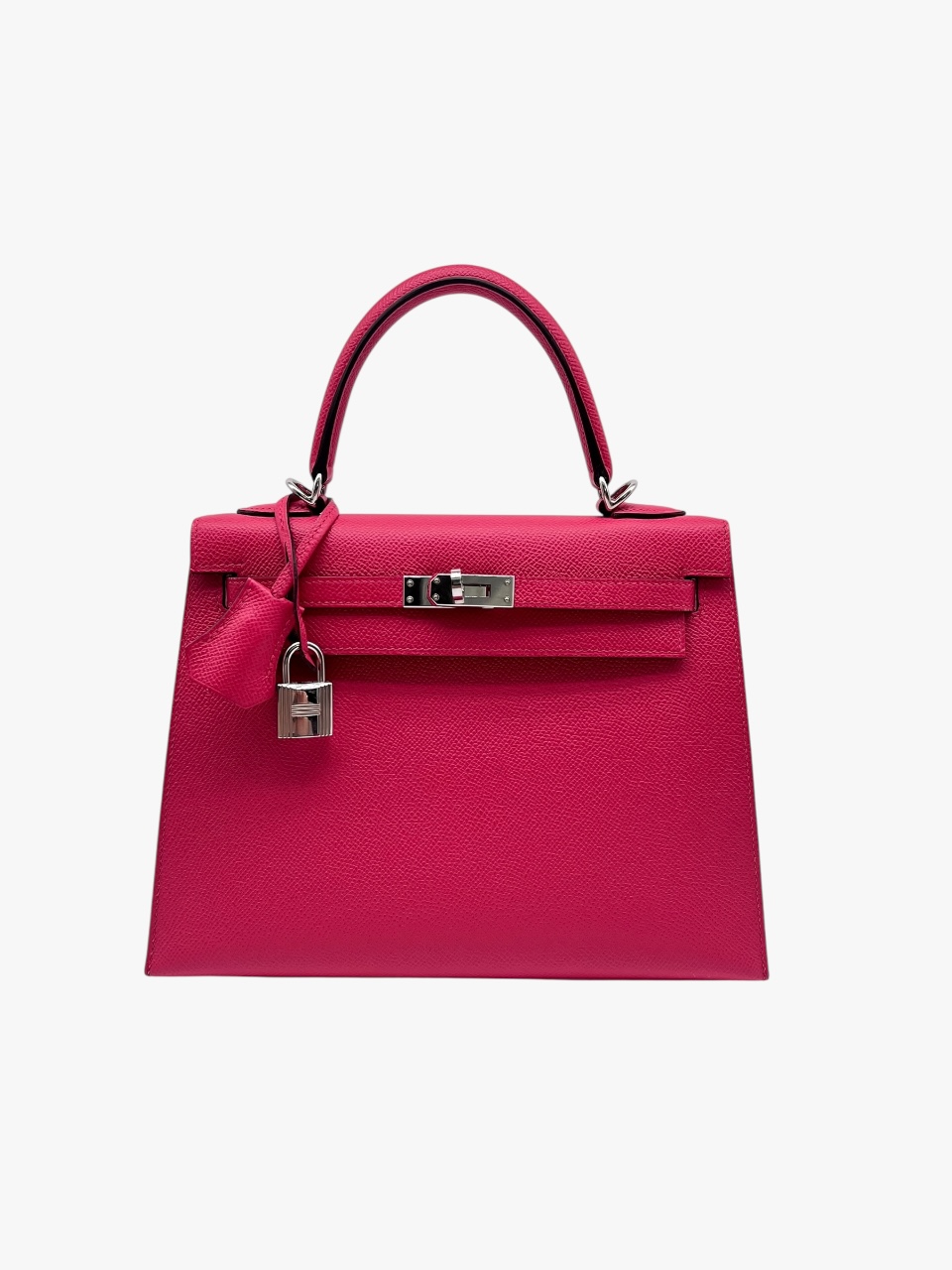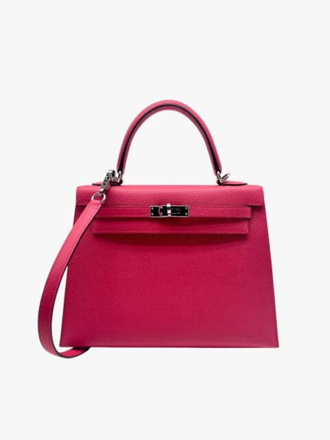 Negli anni ’30, Robert Dumas crea la borsa da donna Kelly. Con una forma trapezoidale, patta a taglio, un manico, due cinghie e la mitica chiusura Kelly, proietta la Maison nella modernità. Borsa Kelly 25 Hermès, in pelle Epsom color Rose Mexico, con parti metalliche in Palladio.
