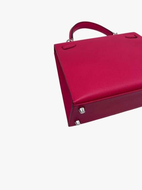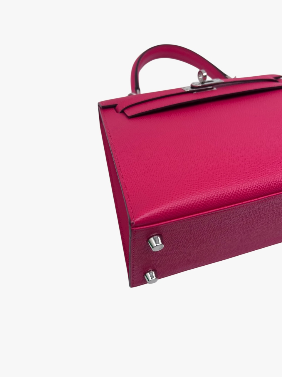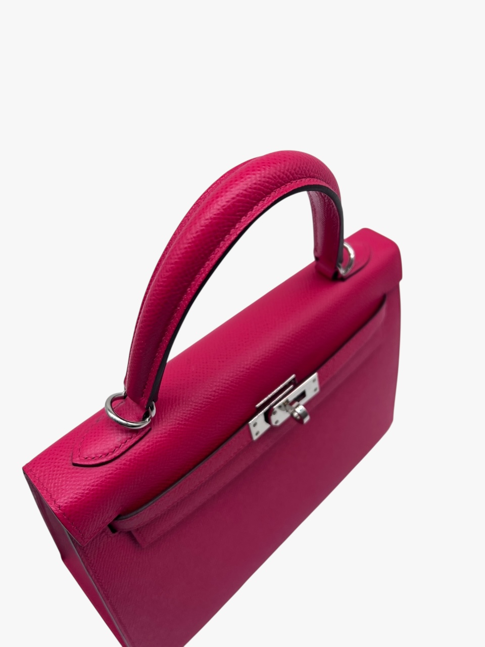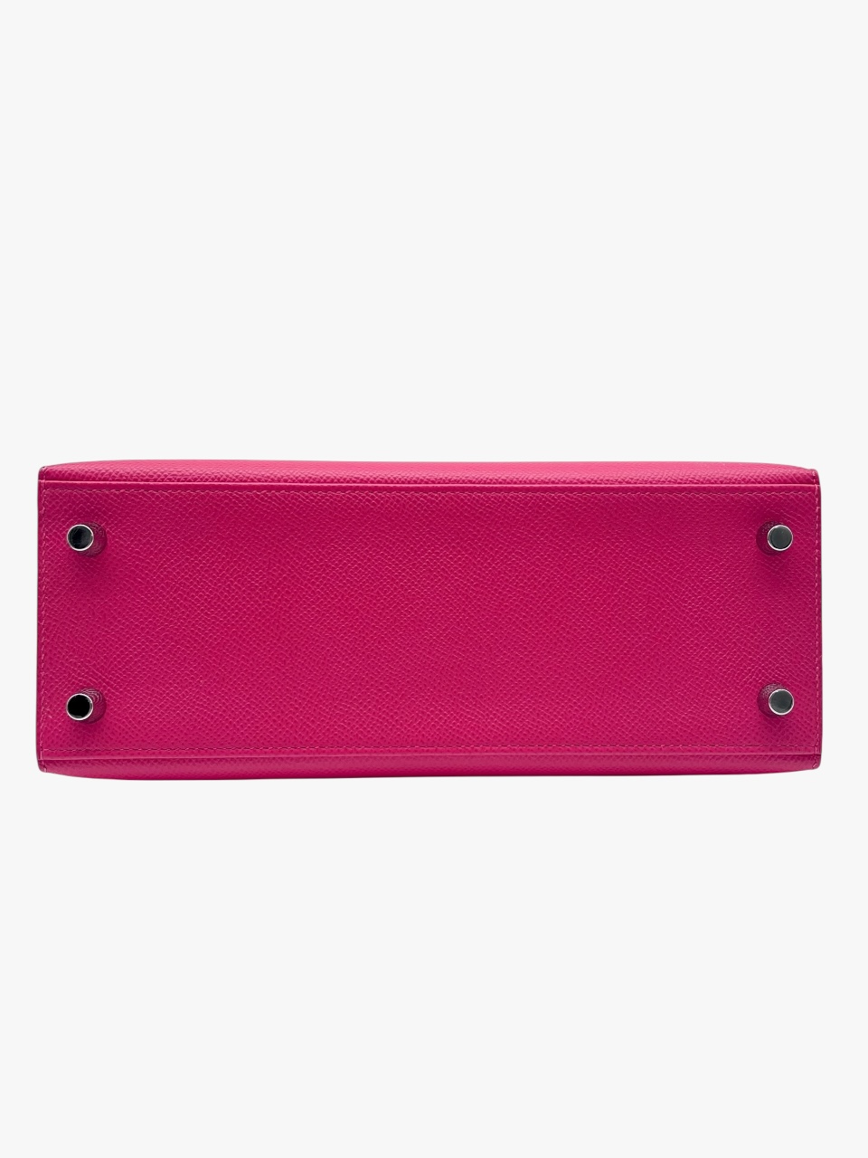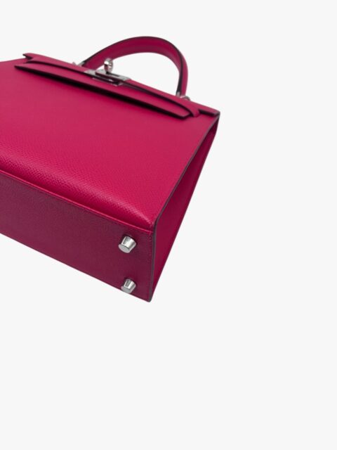 Negli anni ’30, Robert Dumas crea la borsa da donna Kelly. Con una forma trapezoidale, patta a taglio, un manico, due cinghie e la mitica chiusura Kelly, proietta la Maison nella modernità. Borsa Kelly 25 Hermès, in pelle Epsom color Rose Mexico, con parti metalliche in Palladio.