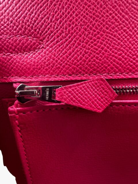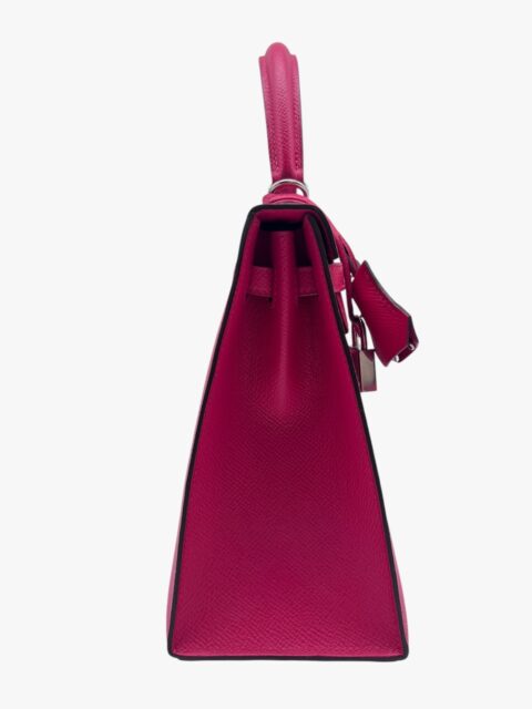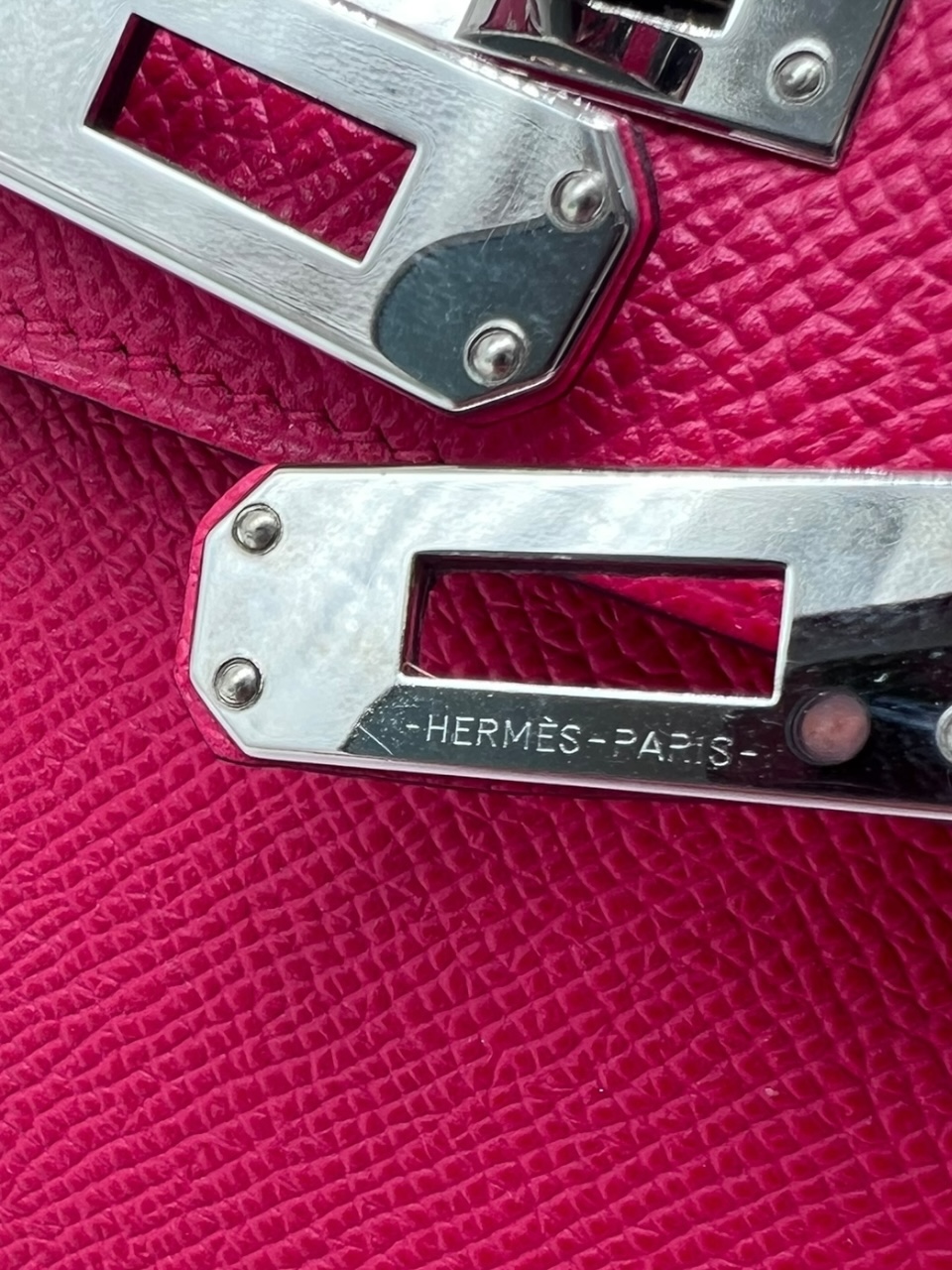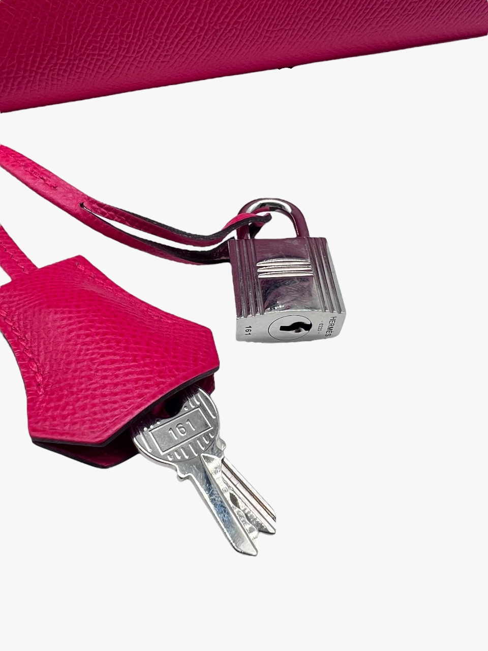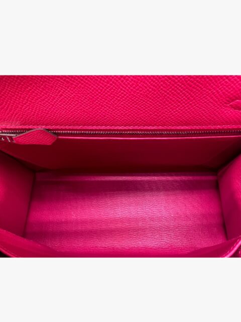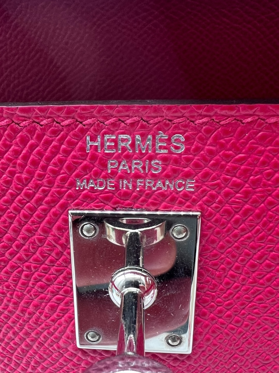 Negli anni ’30, Robert Dumas crea la borsa da donna Kelly. Con una forma trapezoidale, patta a taglio, un manico, due cinghie e la mitica chiusura Kelly, proietta la Maison nella modernità. Borsa Kelly 25 Hermès, in pelle Epsom color Rose Mexico, con parti metalliche in Palladio.