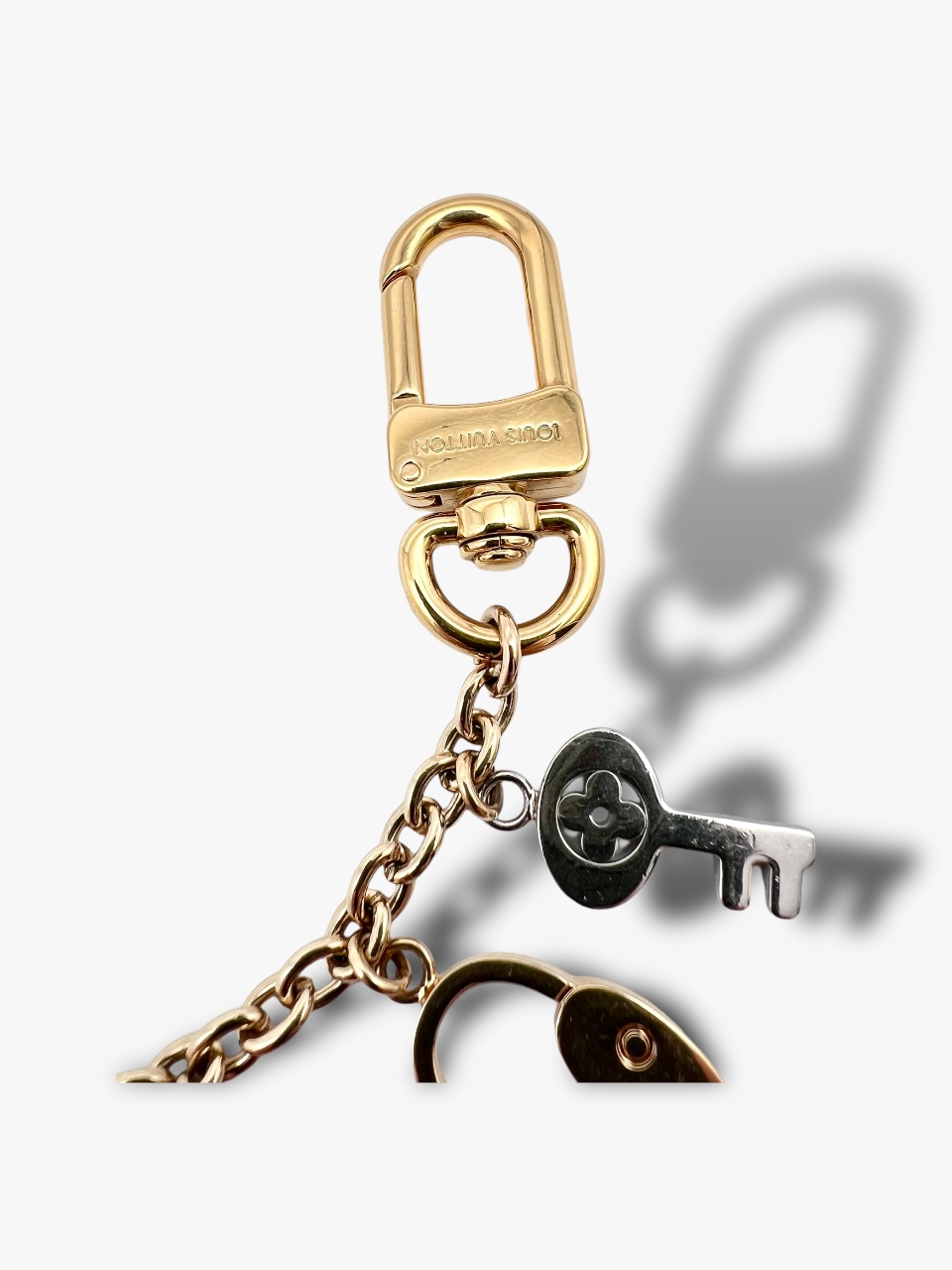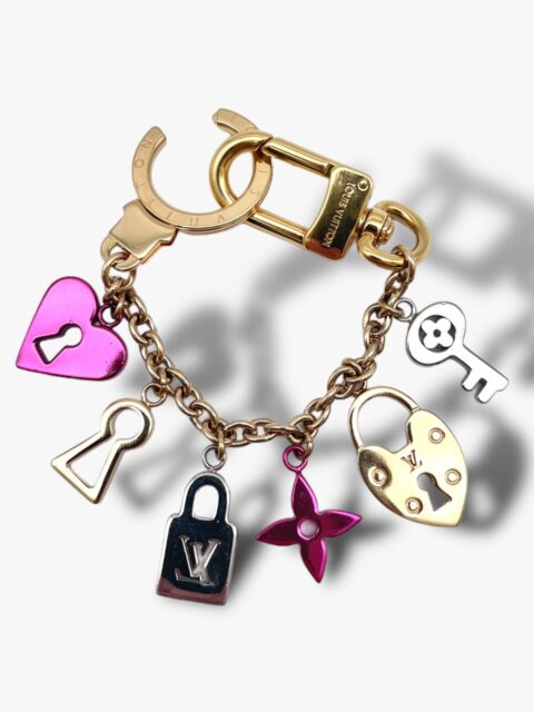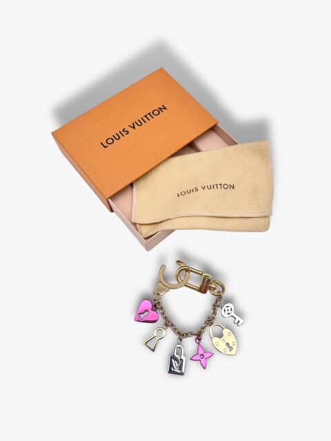 Bellissimo Charm di Louis Vuitton, ideato per adornare le borse, può essere attaccato comodamente ai manici della borsa o anche trasformarlo come portachiavi imporvvisato. Interamente in metallo dorato, con ciondoli di multicolor che prendono le forme caratteristiche dei loghi LV. Infatti le forme sono quelle del lucchetto, chiavi e serrature e il classico fiore. Misure, lunghezza massima 18,5 cm. Corredato di Box e Dustbag.