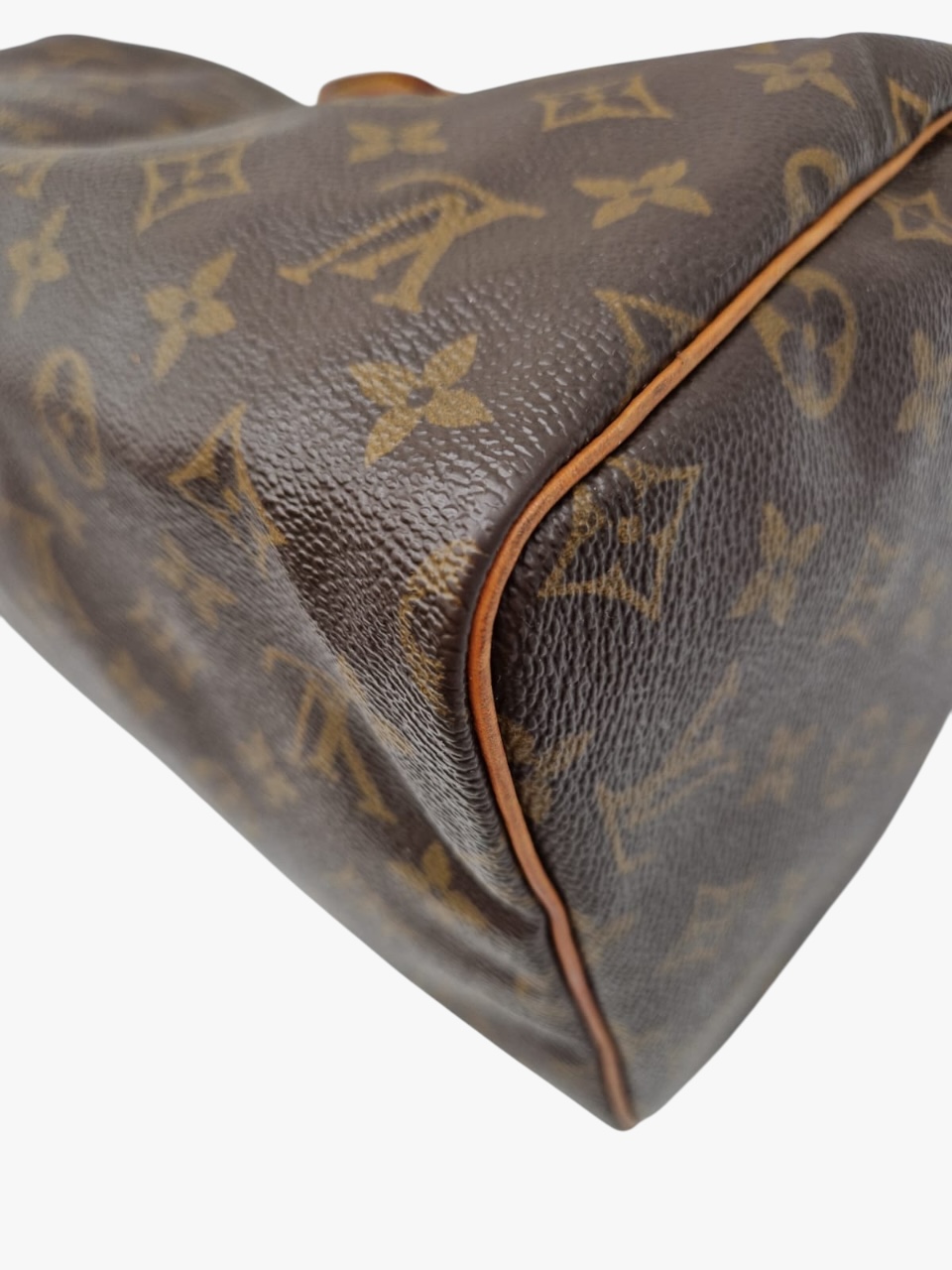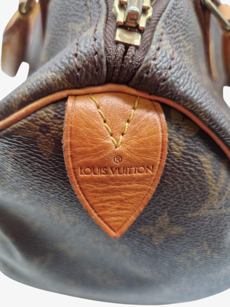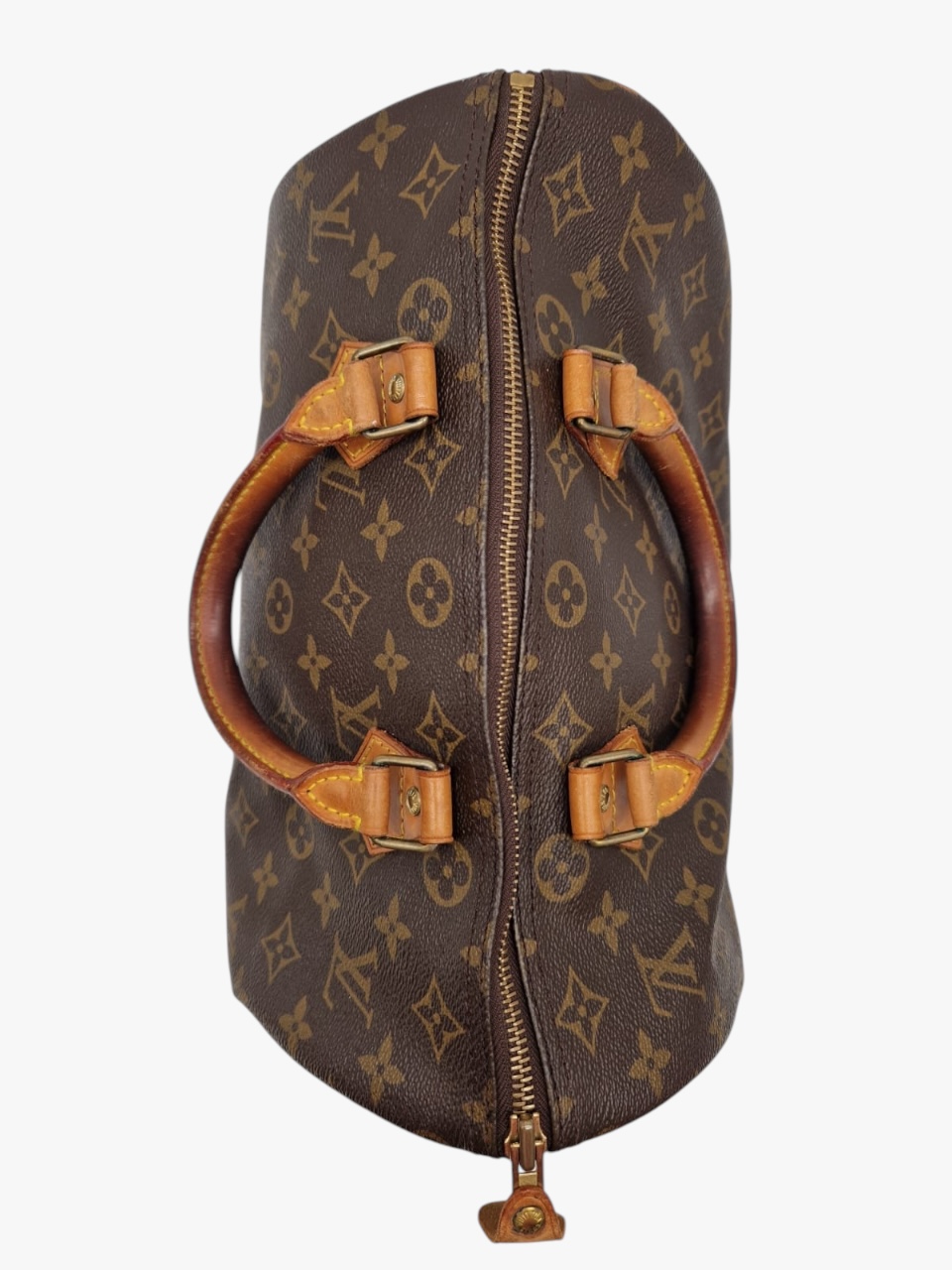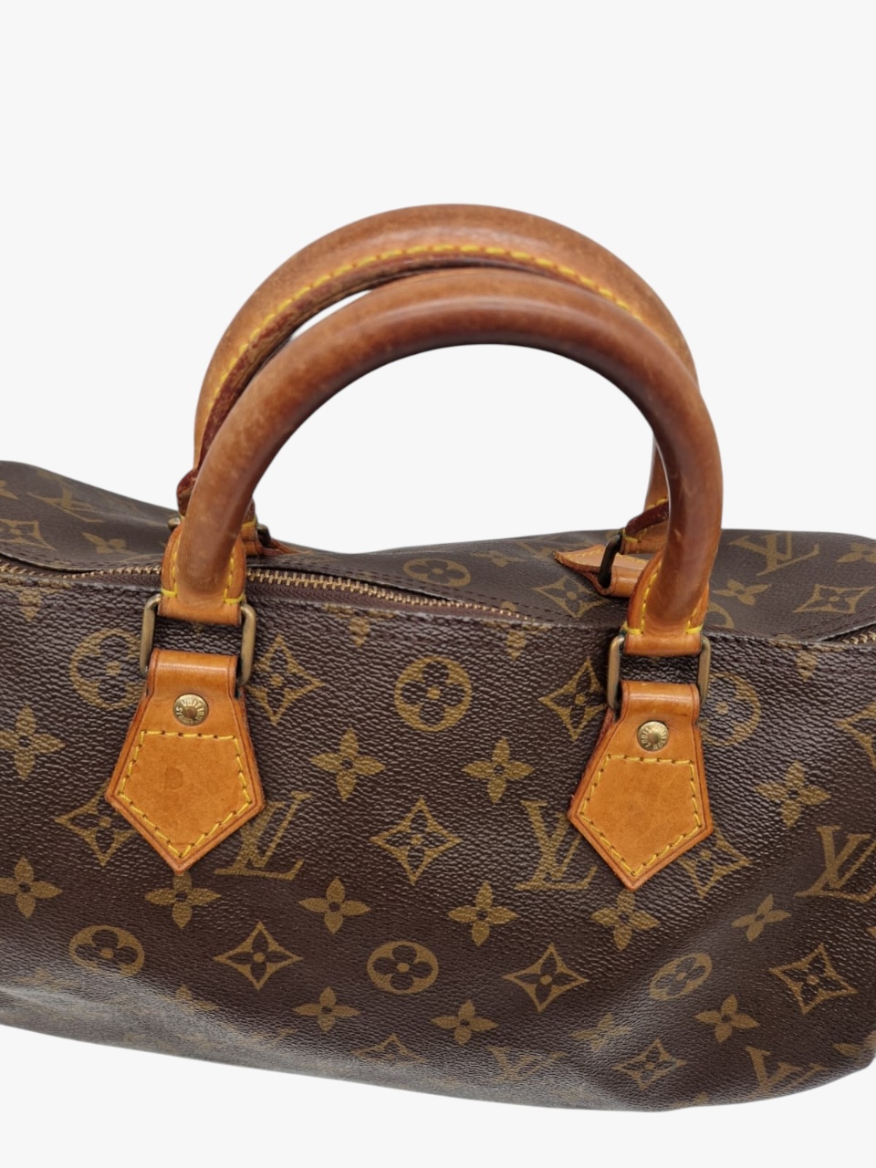 Bauletto Speedy 30 LV vintage, in tela monogram e vacchetta naturale, interno in tessuto marrone, parti metalliche color ottone.