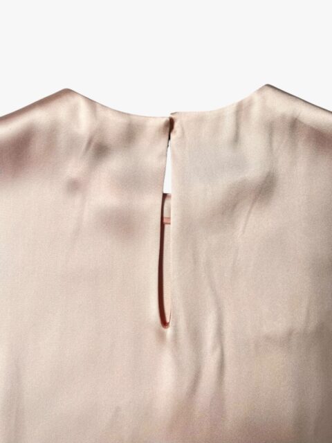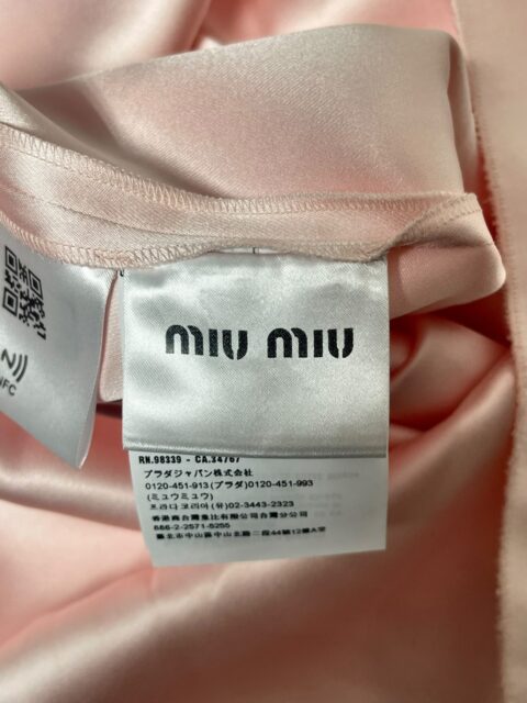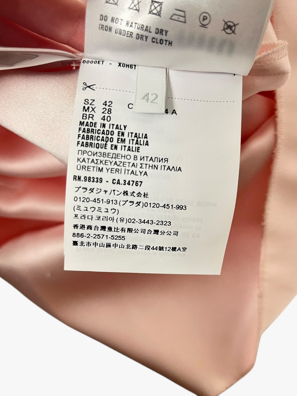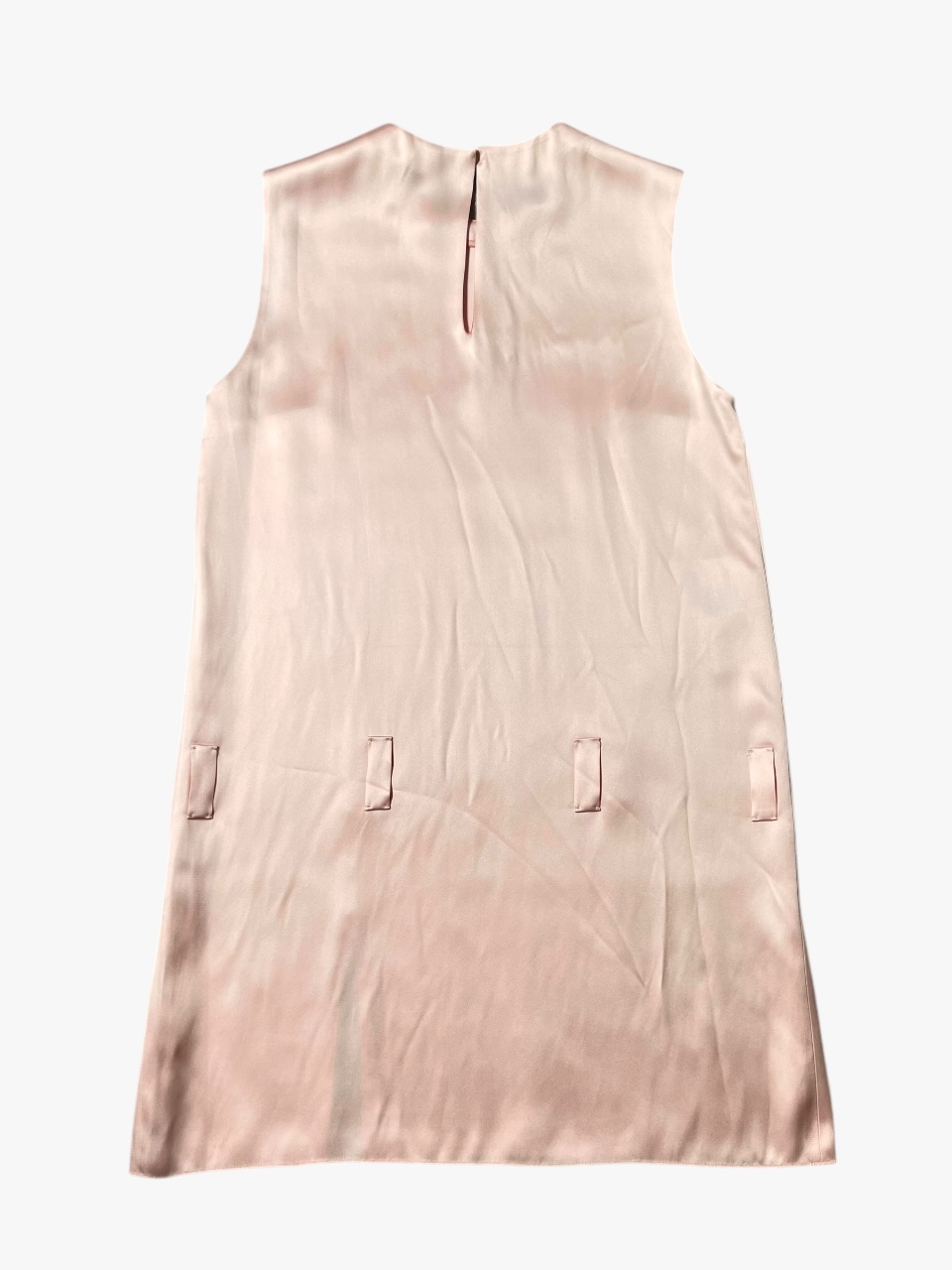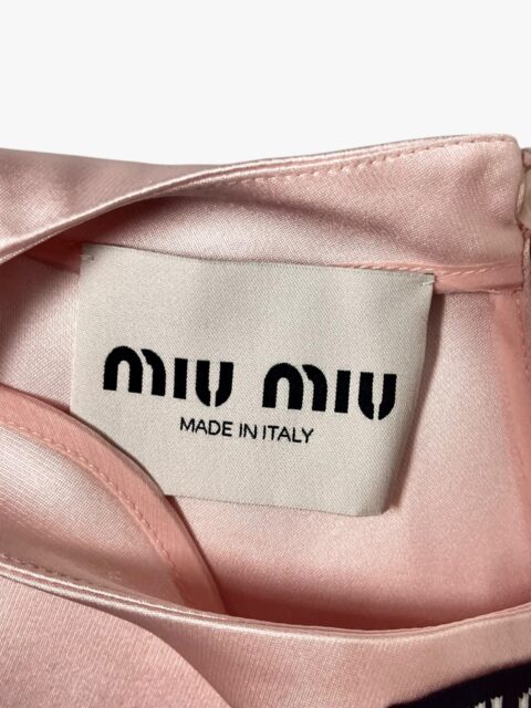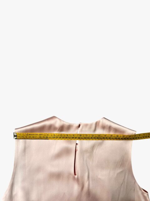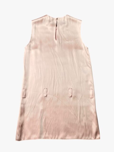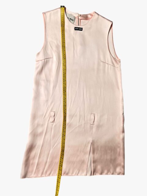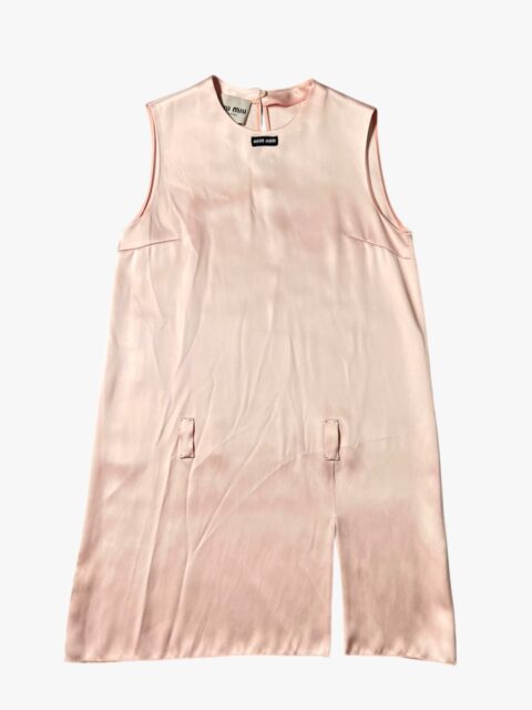 Abito Miu Miu mini rosa, taglio a trapezio smanicato, in 54% viscosa e 46% seta. Presenta logo Miu Miu nella parte centrale dell’abito, uno spacco sul davanti e passanti sul davanti e sul retro dell’abitino. Taglia 42 Italiana, lunghezza totale 89 cm, larghezza petto 48 cm, vita 50 cm. L’abito si presenta in condizioni discrete in quanto presenta pieghe dovute al tessuto satin, che però possono andare via.