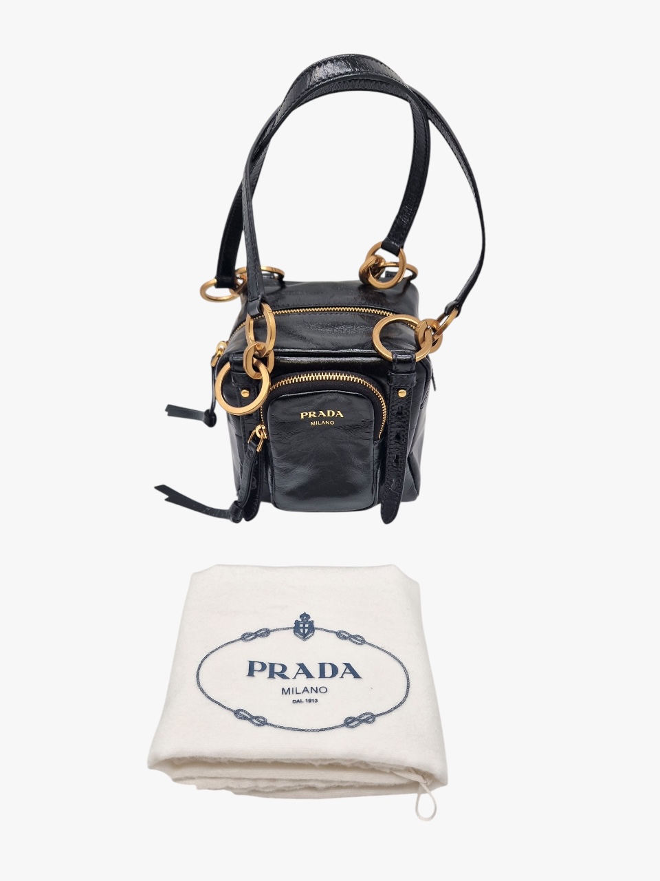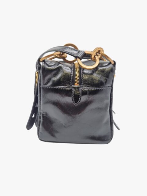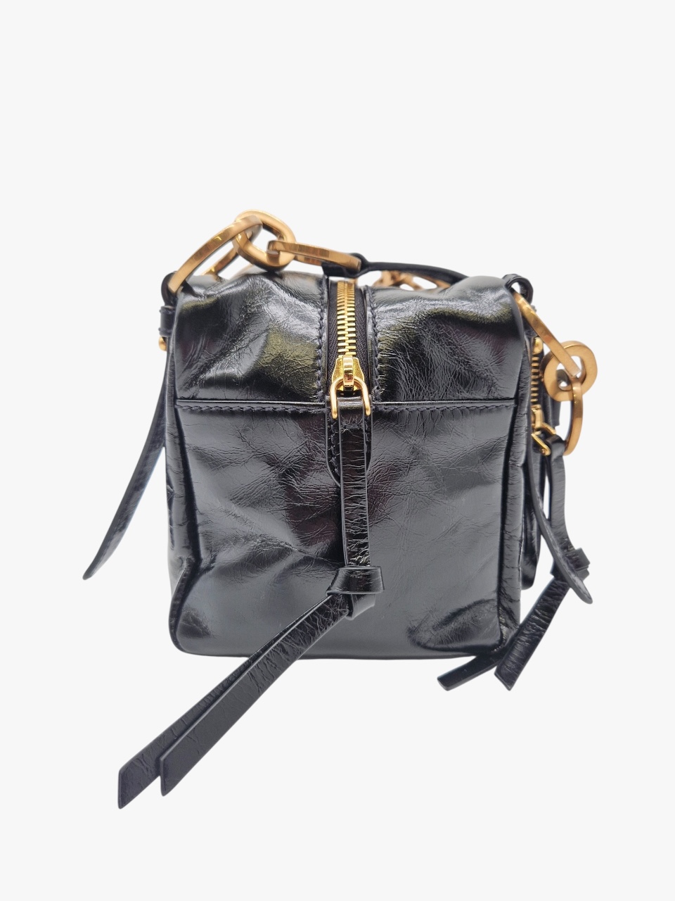 La borsa a bauletto è rinnovata nella geometria con una nuova forma cubica, realizzata in pelle morbida dal finish vintage. Il fascino retrò è enfatizzato dalle finiture in metallo anticato e dalla tasca con zip ispirata agli archivi. Manici in pelle, luce 25 cm. Tasca frontale con zip Finiture in metallo. Logo stampato a caldo su tasca Chiusura zip. Pelle di vitello con Interno in nylon siglato. Altezza: 14cm Larghezza: 14.5cm Lunghezza: 13.5cm. Anno 08/2025. Dotato di Dustbag e chip elettronico, si presenta in buone condizioni.