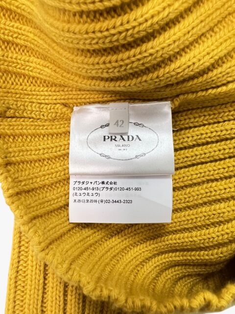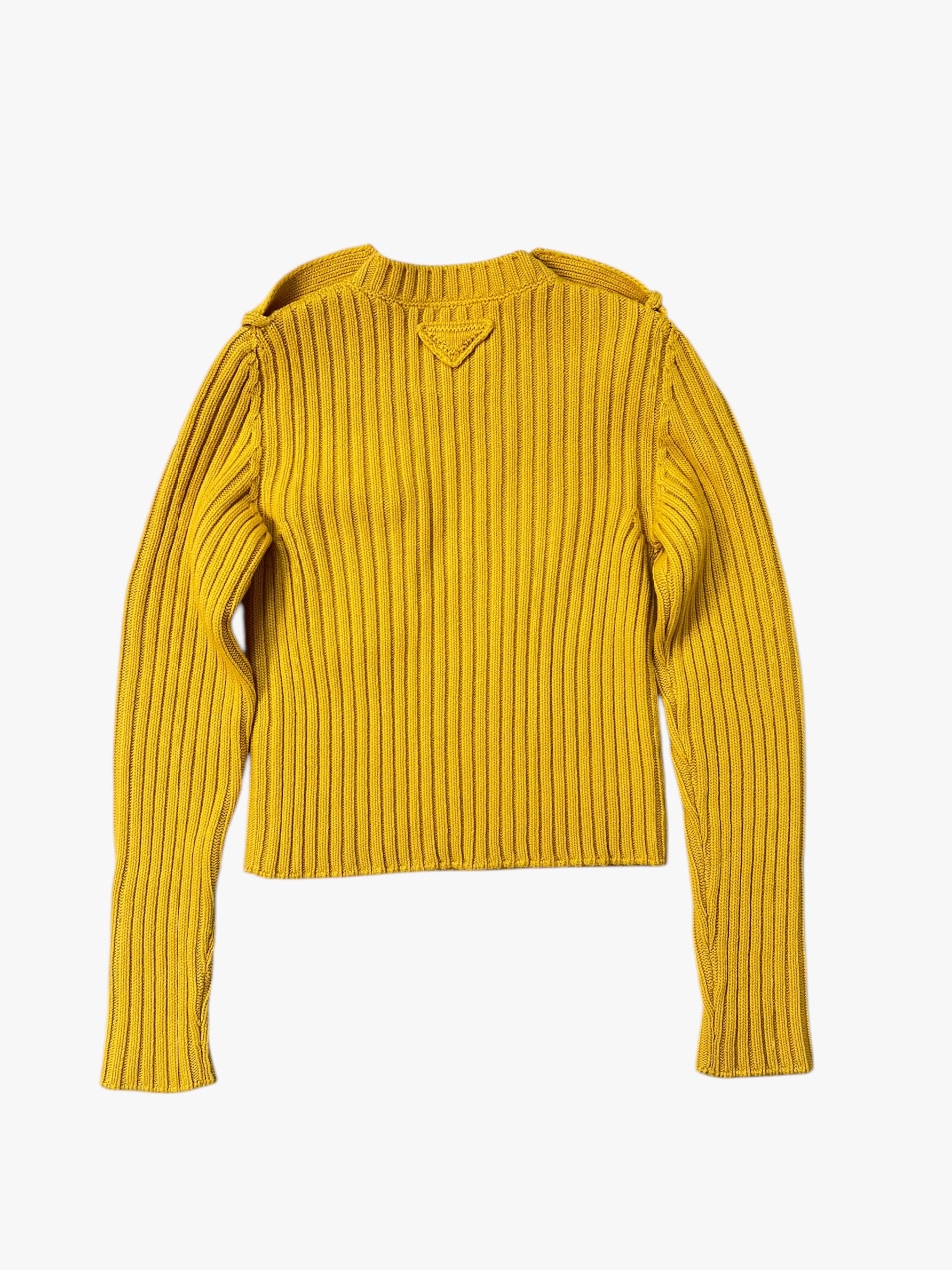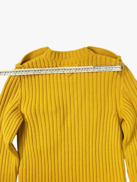 Maglioncino Corto di Prada, in Lana Vergine 70% misto con Cachemire 30%, di colore Giallo Sole. Il tessuto è lavorato con motivo a costine e taglio vivo su finale e maniche. Presenta delle Mostrine sulle spalle, un taschino a patta applicato sul davanti e girocollo. Invece sul retro altezza spalle possiamo trovare applicato, il classico logo triangolare ricamato. La taglia è una 42 ita, Le misure sono: lunghezza totale 51 cm, manica 65,5 cm, spalle 35 cm. Si presenta in ottime condizioni, senza alcun corredo.