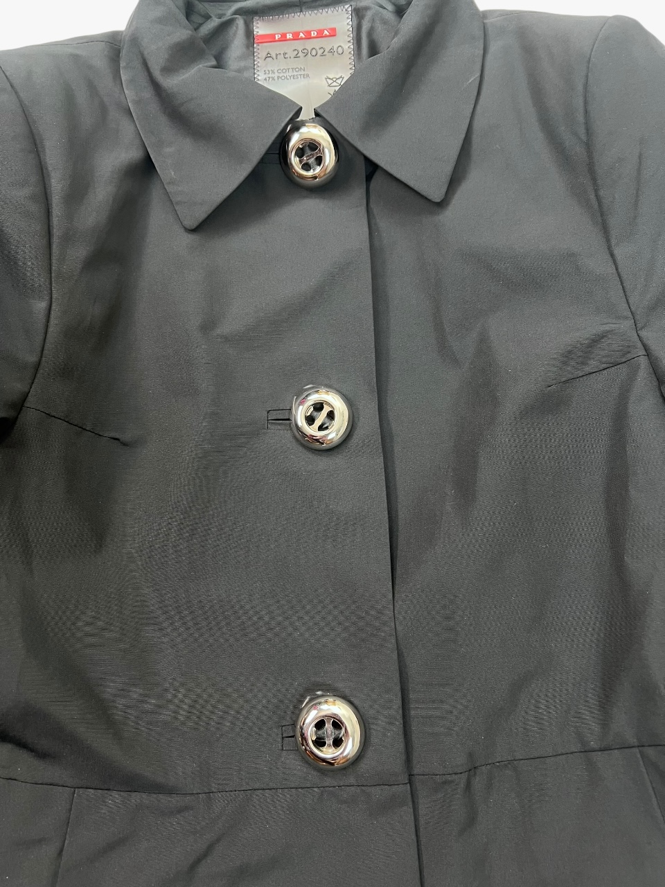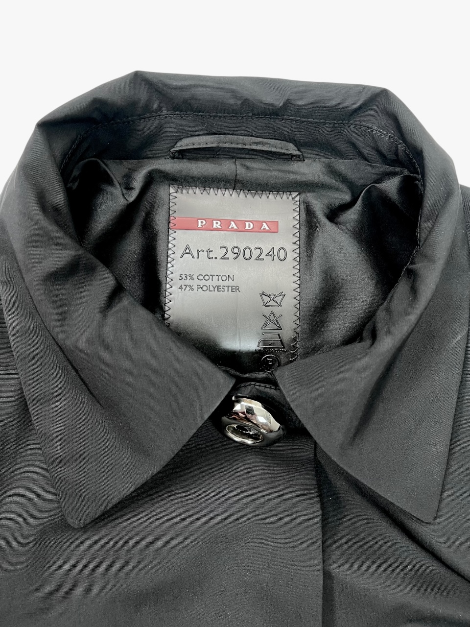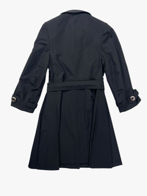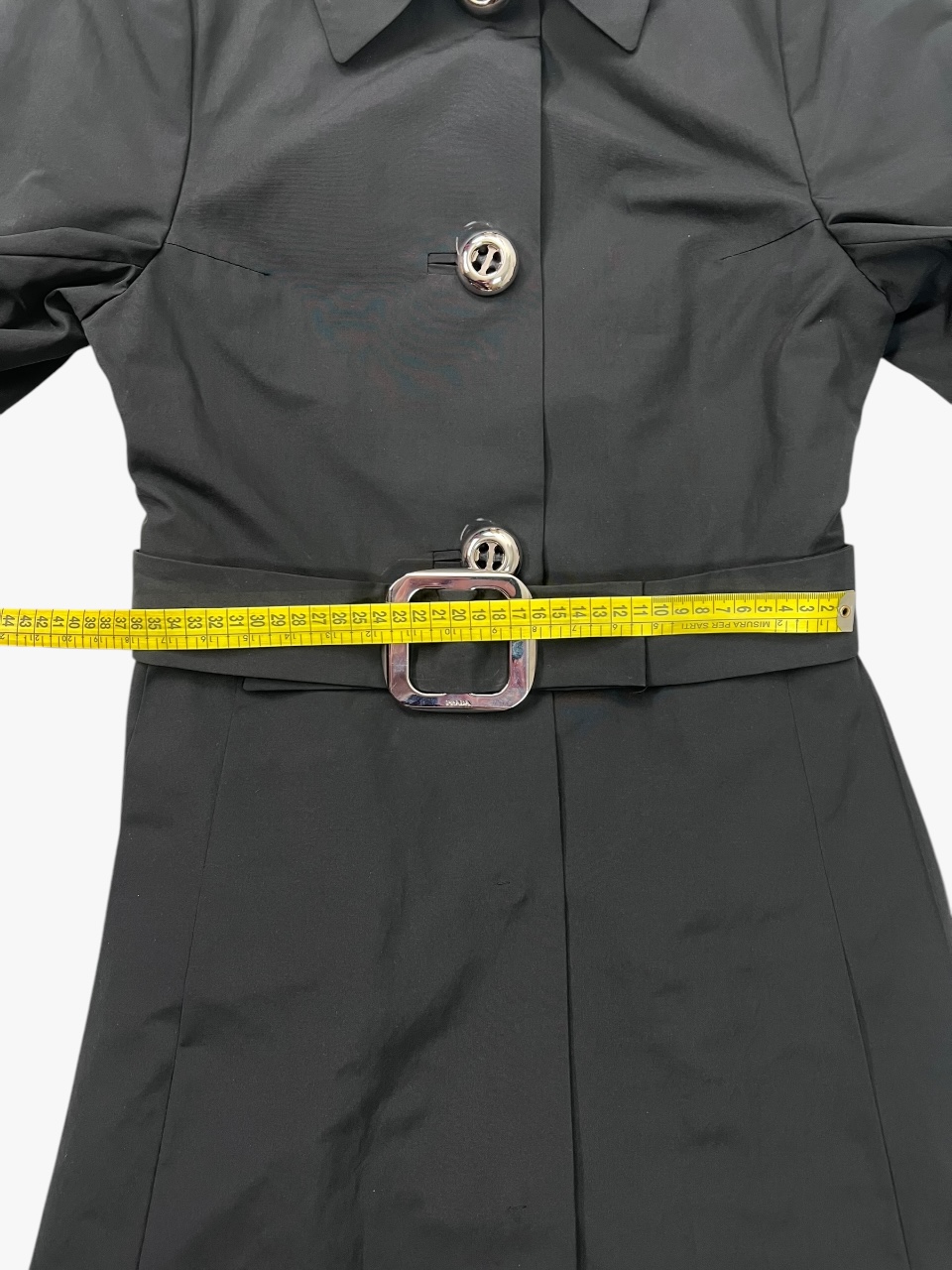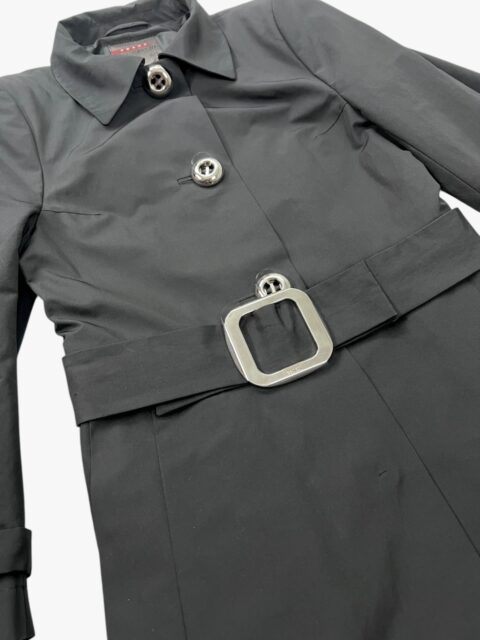 Trench Prada in tessuto misto Cotone, di colore nero con cintura alla vita con fibbia, regolabile solo in due misure. Colletto classico e chiusura a 5 Bottoni di cui 3 superiori a vista di metallo silver con asola e 2 pressione nascosti. Nella parte di sotto il trench presenta delle plissettature larghe, che lo rendono molto elegante e raffinato. La chiusura della cintura è con due ganci e due bottoni a pressione ed è regolabile per due misure. Tg. 40, Misure: lunghezza totale 95,5 cm, manica 53 cm, sotto petto 40 cm, vita 35 cm, spalle 35 cm. Si presenta in buone condizioni, senza alcun tipo di corredo.