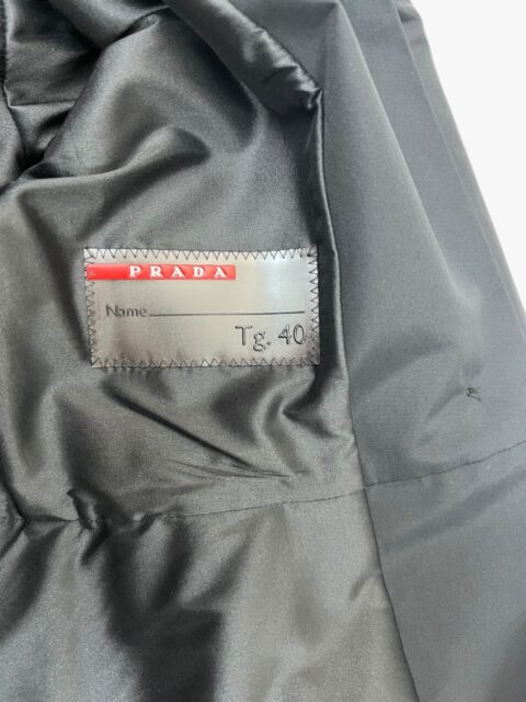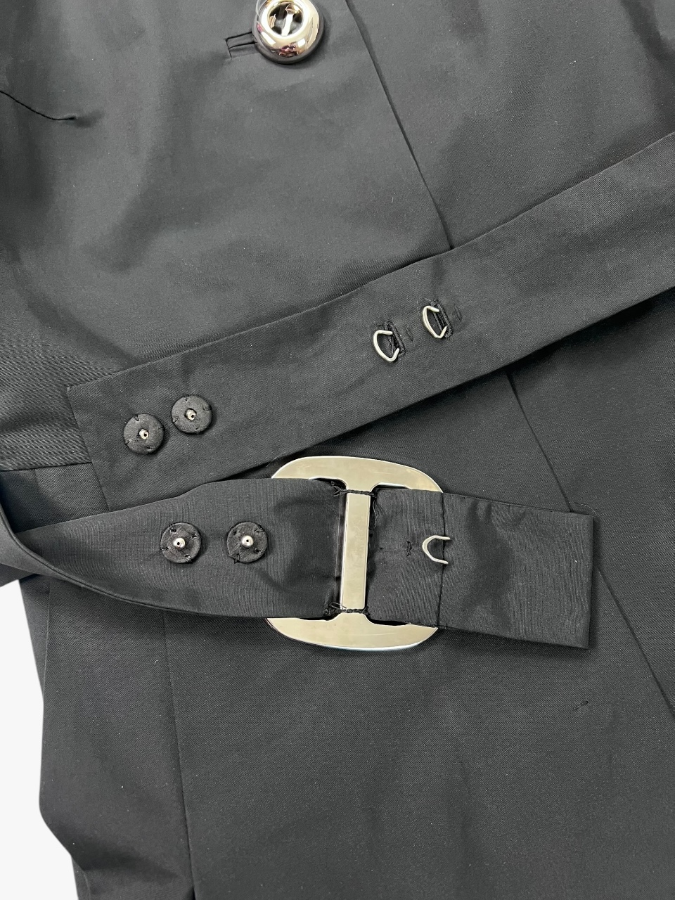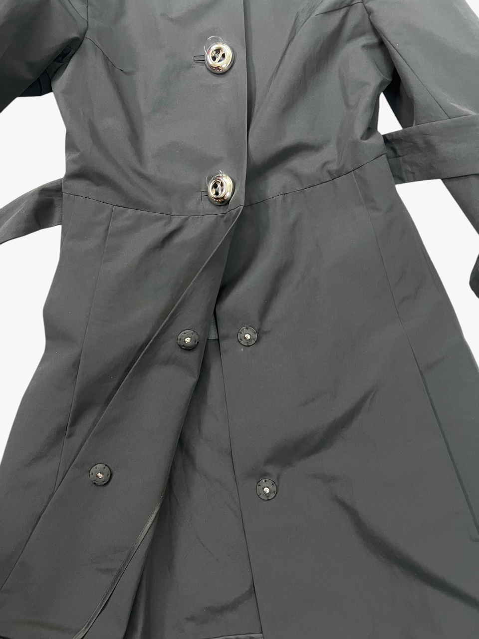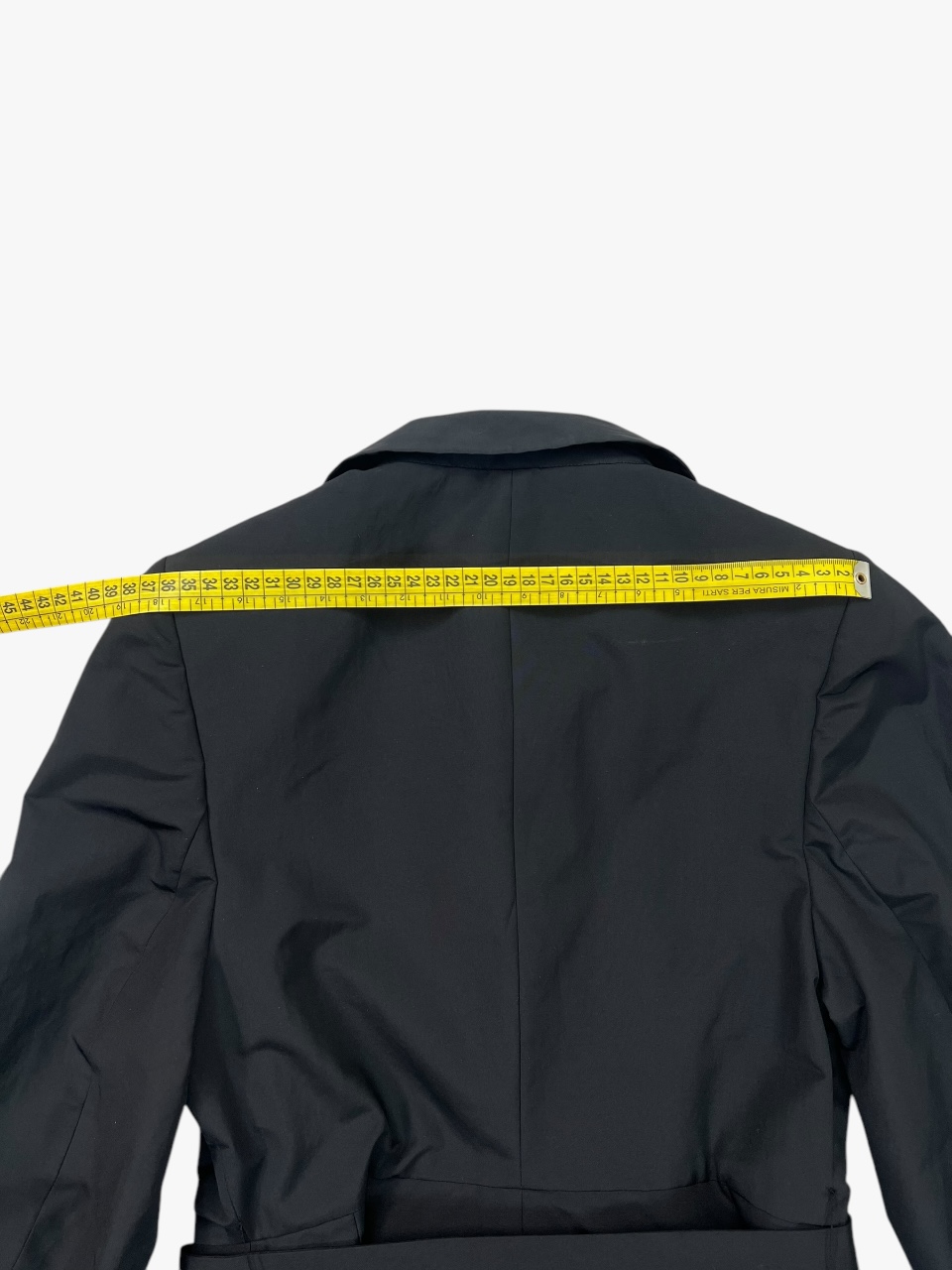 Trench Prada in tessuto misto Cotone, di colore nero con cintura alla vita con fibbia, regolabile solo in due misure. Colletto classico e chiusura a 5 Bottoni di cui 3 superiori a vista di metallo silver con asola e 2 pressione nascosti. Nella parte di sotto il trench presenta delle plissettature larghe, che lo rendono molto elegante e raffinato. La chiusura della cintura è con due ganci e due bottoni a pressione ed è regolabile per due misure. Tg. 40, Misure: lunghezza totale 95,5 cm, manica 53 cm, sotto petto 40 cm, vita 35 cm, spalle 35 cm. Si presenta in buone condizioni, senza alcun tipo di corredo.