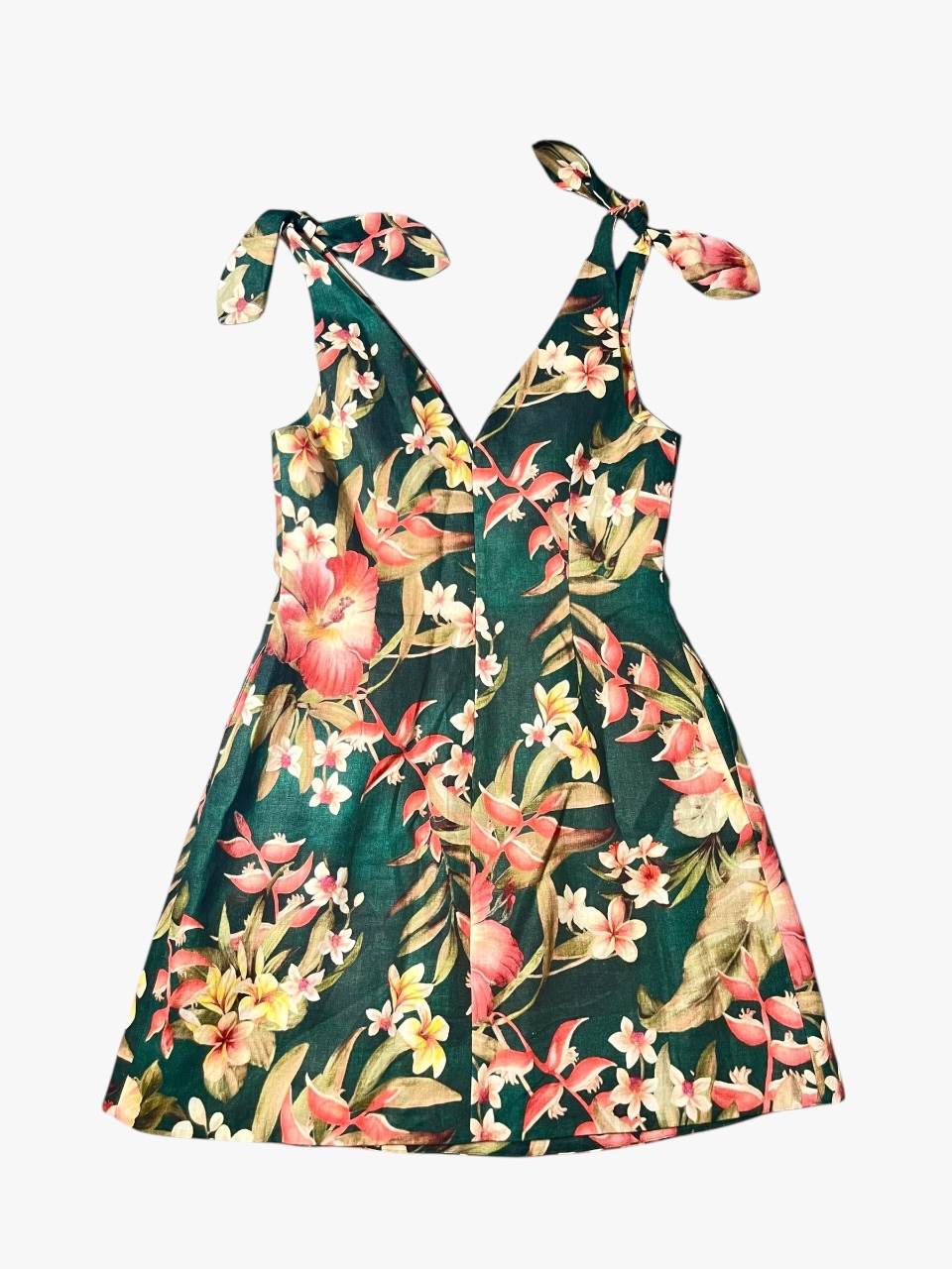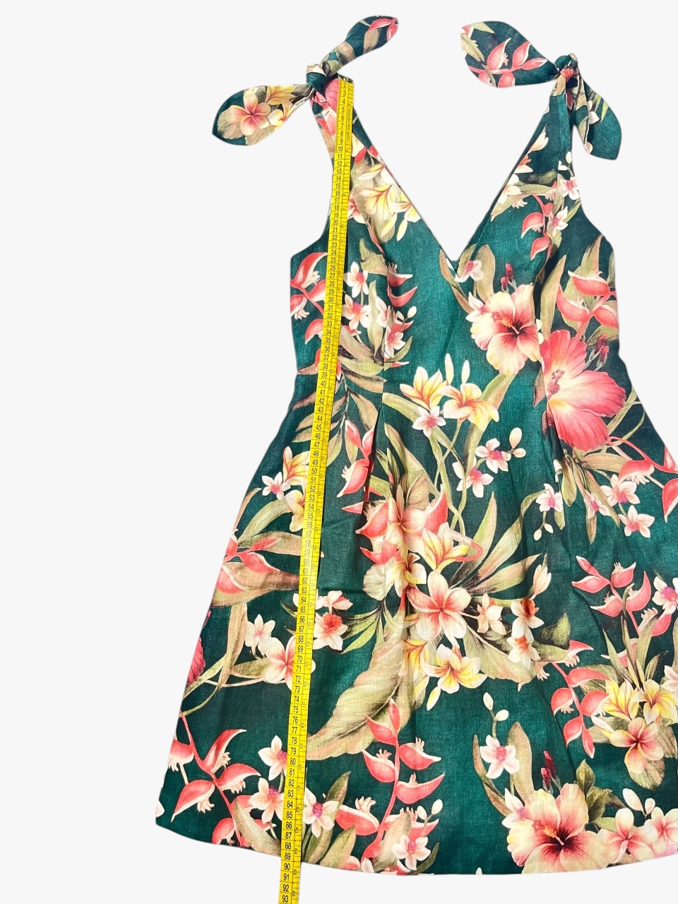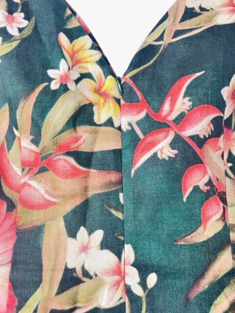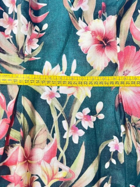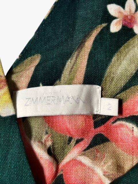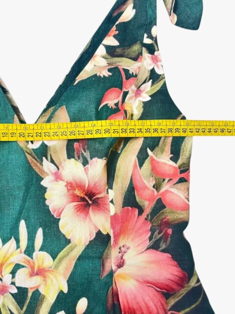 Abito Zimmermann modello Lexi color verde foresta con stampa floreale retrò e spalline da annodare sull’abito che si ispirano alla moda degli anni ’50. È realizzato in lino leggero con pratiche tasche sulla gonna a pieghe, mentre l’interno è 100% cotone. La taglia è una 2 che corrisponde ad una 44 Italiana. Misure: lunghezza totale 89 cm, petto 41 cm e vita 38 cm. L’abito si presenta in condizioni discrete, in quanto presenta alcuni difetti.